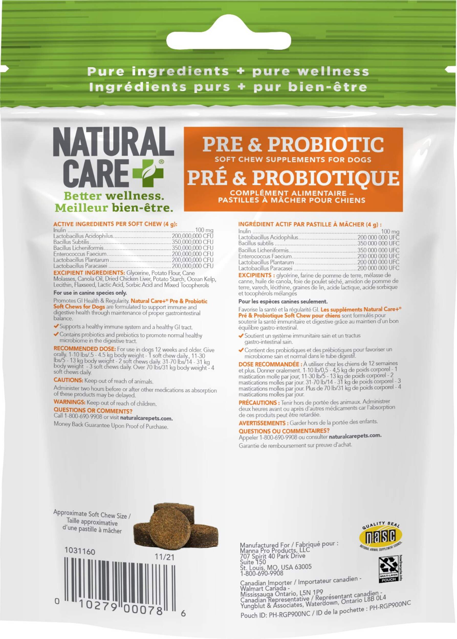 Natural Care Pre & Probiotic Chicken Soft Chew Supplements are formulated to support a healthy immune system and a healthy GI tract.