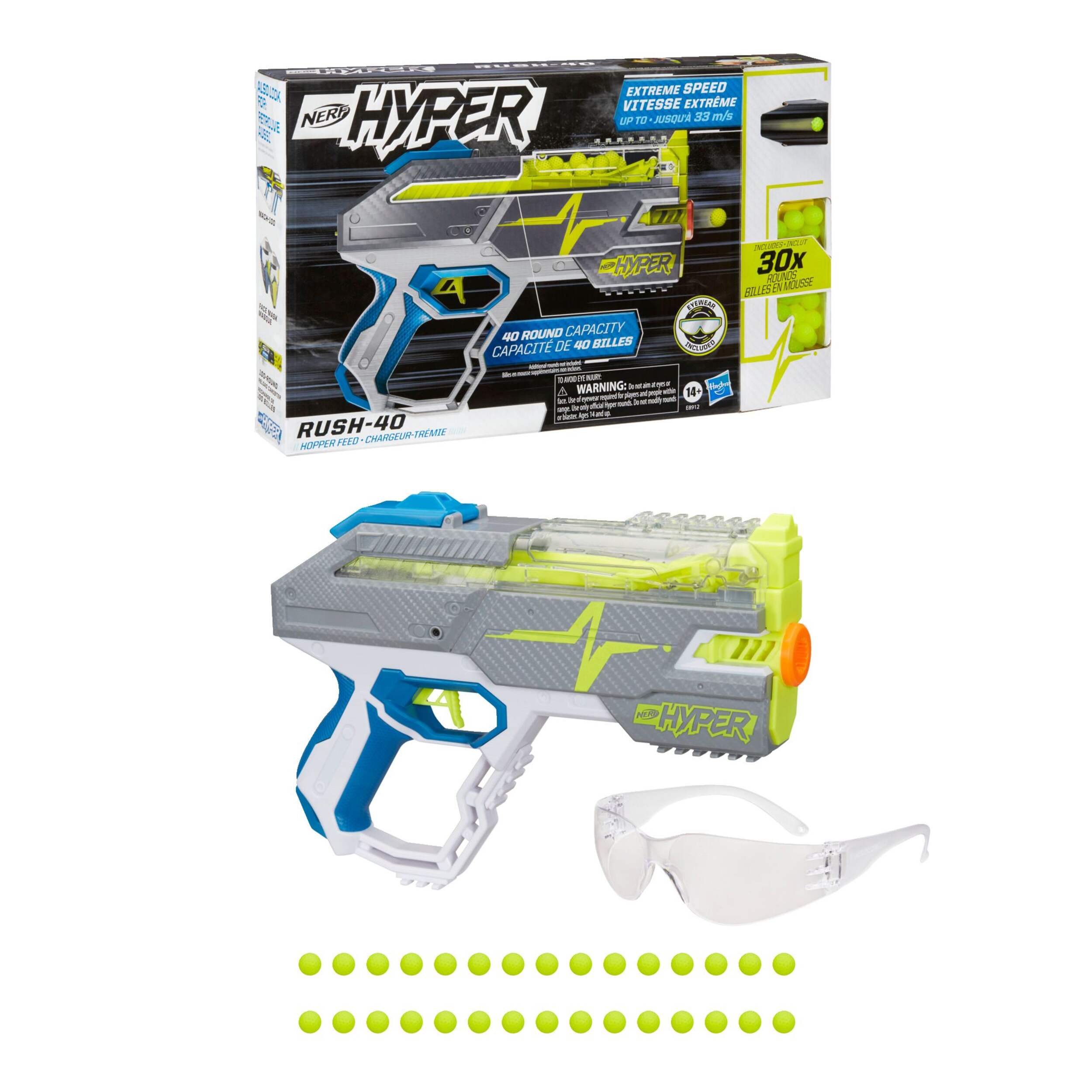 PUMP-ACTION NERF HYPER RUSH-40 BLASTER: Pump the hopper to prime the blaster and press the trigger to fire at a velocity of up to 110 FPS (hand-powered priming -- no batteries required)