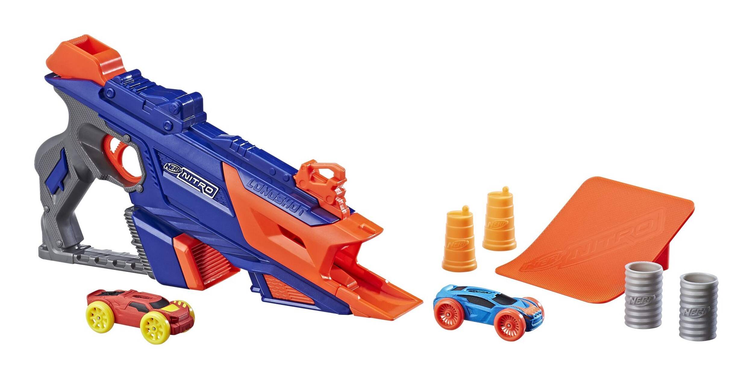 Key features include a front load blaster and a distance ramp for stunts