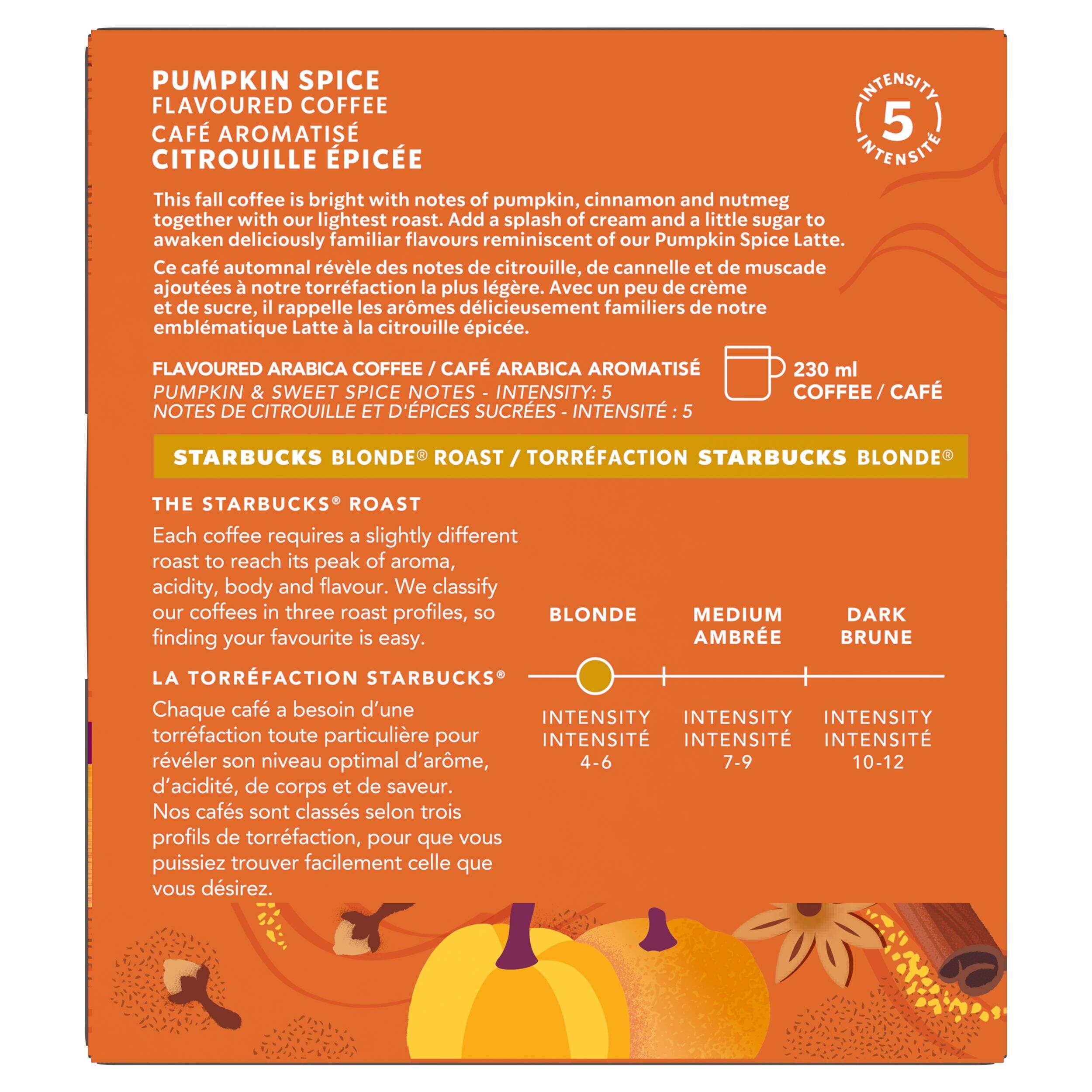 This fall coffee is bright with notes of pumpkin, cinnamon and nutmeg together with Starbucks' lightest roast. Add a splash of cream and a little sugar to awaken deliciously familiar flavours reminiscent of the Pumpkin Spice Latte.