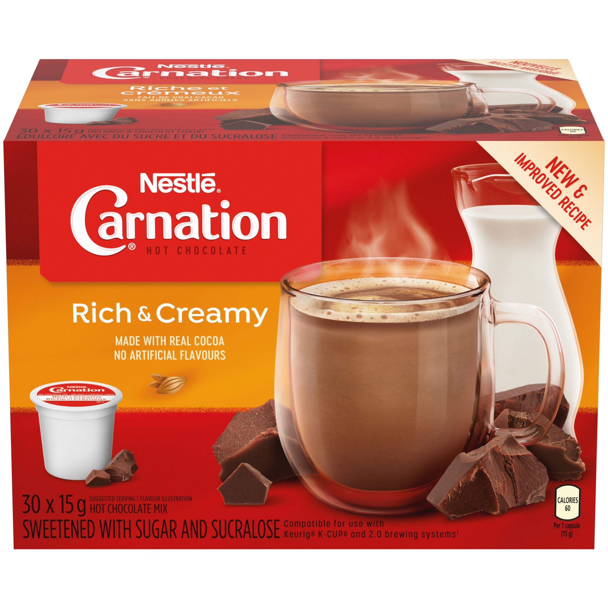 Rich and creamy hot chocolate in seconds from your Keurig. NESTLÉ Carnation Rich and Creamy hot chocolate K-Cup pods brew a mug of indulgent hot chocolate with pure cocoa for an incredibly delicious taste, in mere seconds using your Keurig 2.0 brewing system. Each single-serve pod makes just the right amount for a comforting hot drink on a chilly day, with no mess and maximum flavour. Have a sip of pure chocolatey comfort today.