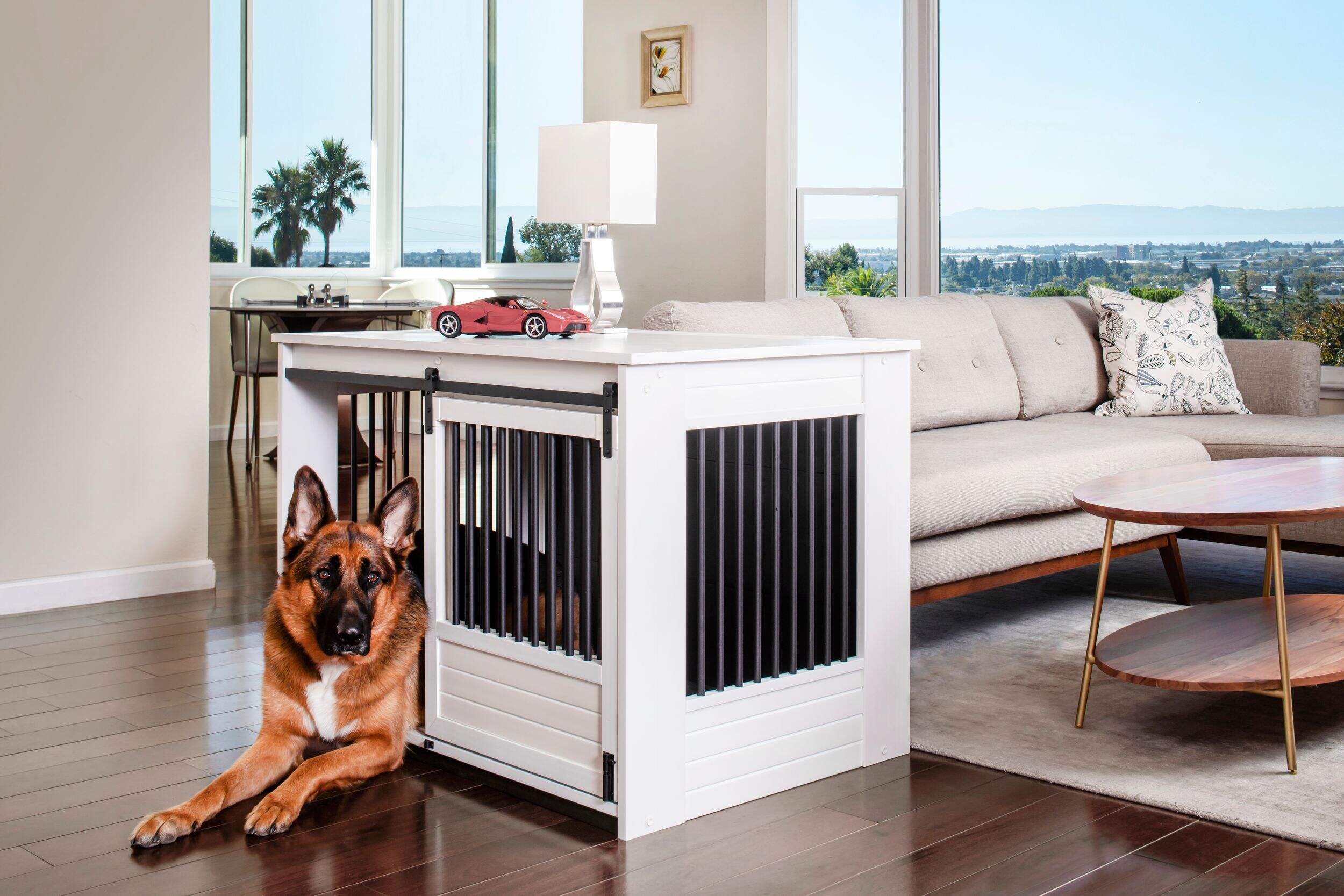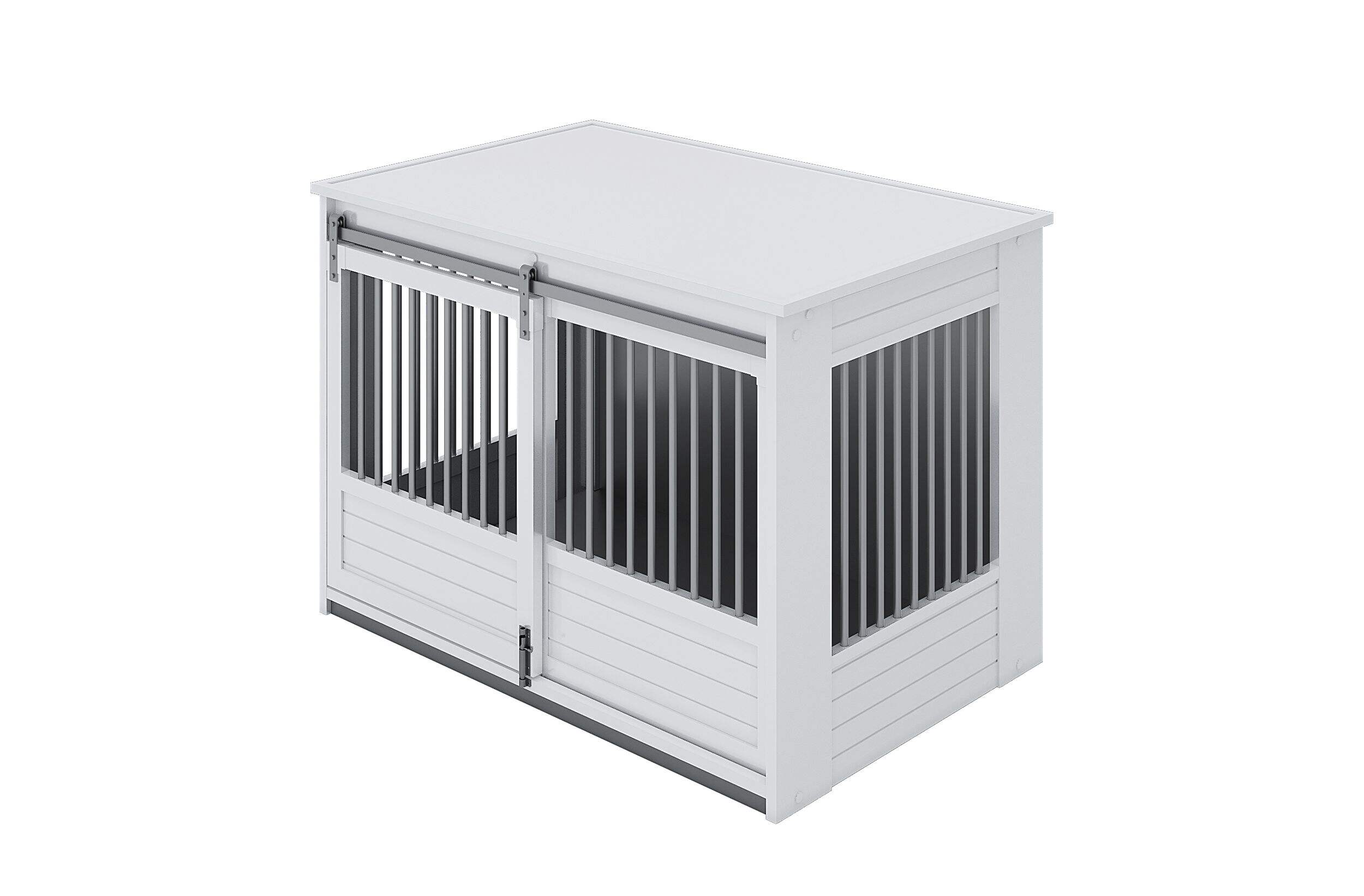 The New Age Pet® Barndoor Crate is crafted with ECOFLEX®—a unique blend of recycled polymers and reclaimed wood fiber by-products. This non-toxic, eco-friendly material is impervious to moisture and odor, making it the perfect choice for pet furniture. The crate features enhanced durability and security with upgraded hardware, ensuring your pet’s safety and the crate’s longevity. Its elegant design seamlessly complements any home decor, adding rustic charm to your space. Spacious and comfortable, the crate is designed to accommodate medium to large dogs and is available in sizes large and extra-large. Versatile in use, it doubles as an end table, blending functionality with style. Easy to assemble and maintain, the crate offers convenience for pet owners. Choose between antique white and gray to match your home’s aesthetic. Enjoy peace of mind with a 10-year limited manufacturer's warranty. Upgrade your pet’s living space with the New Age Pet® Barndoor Crate—where style meets sustainability