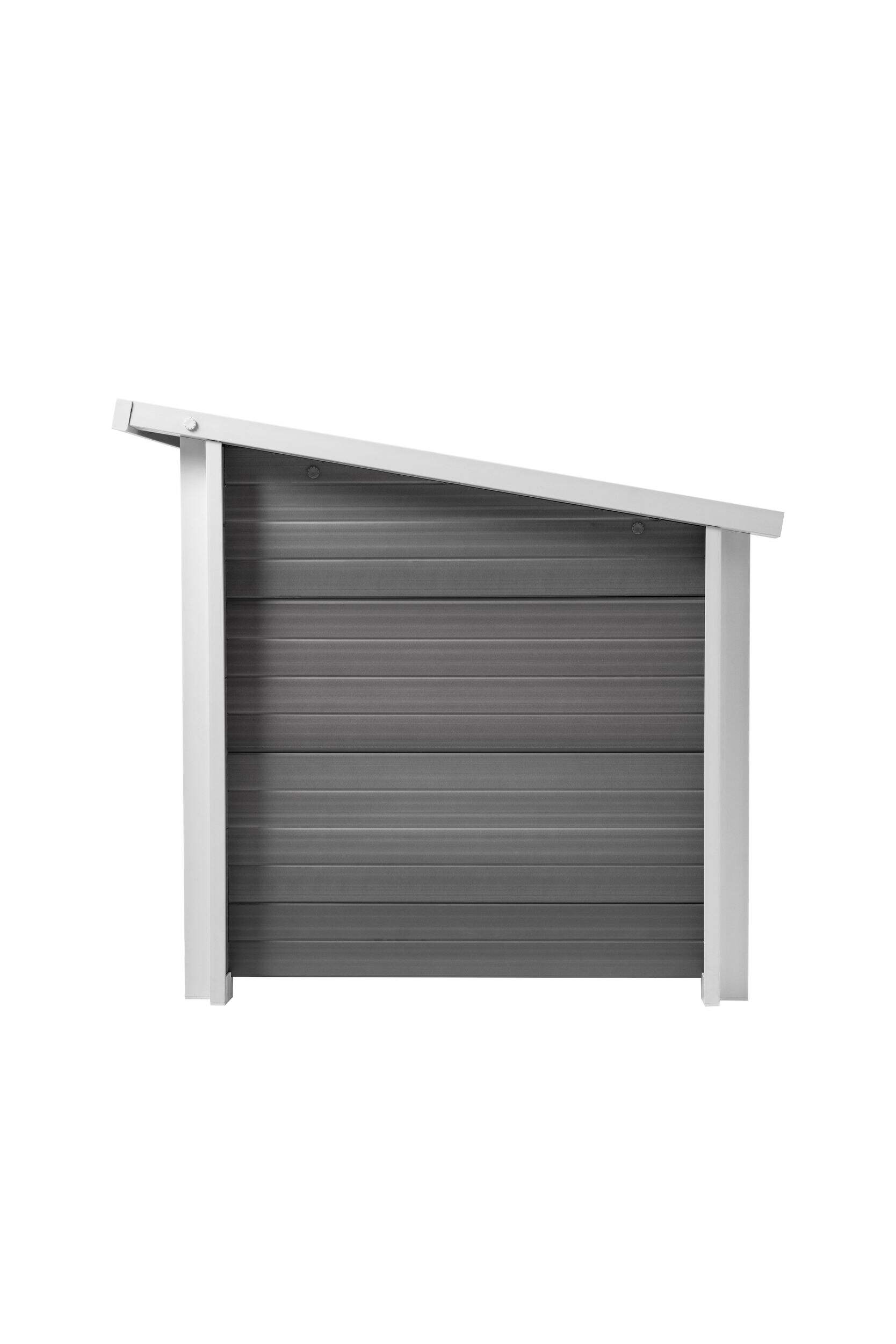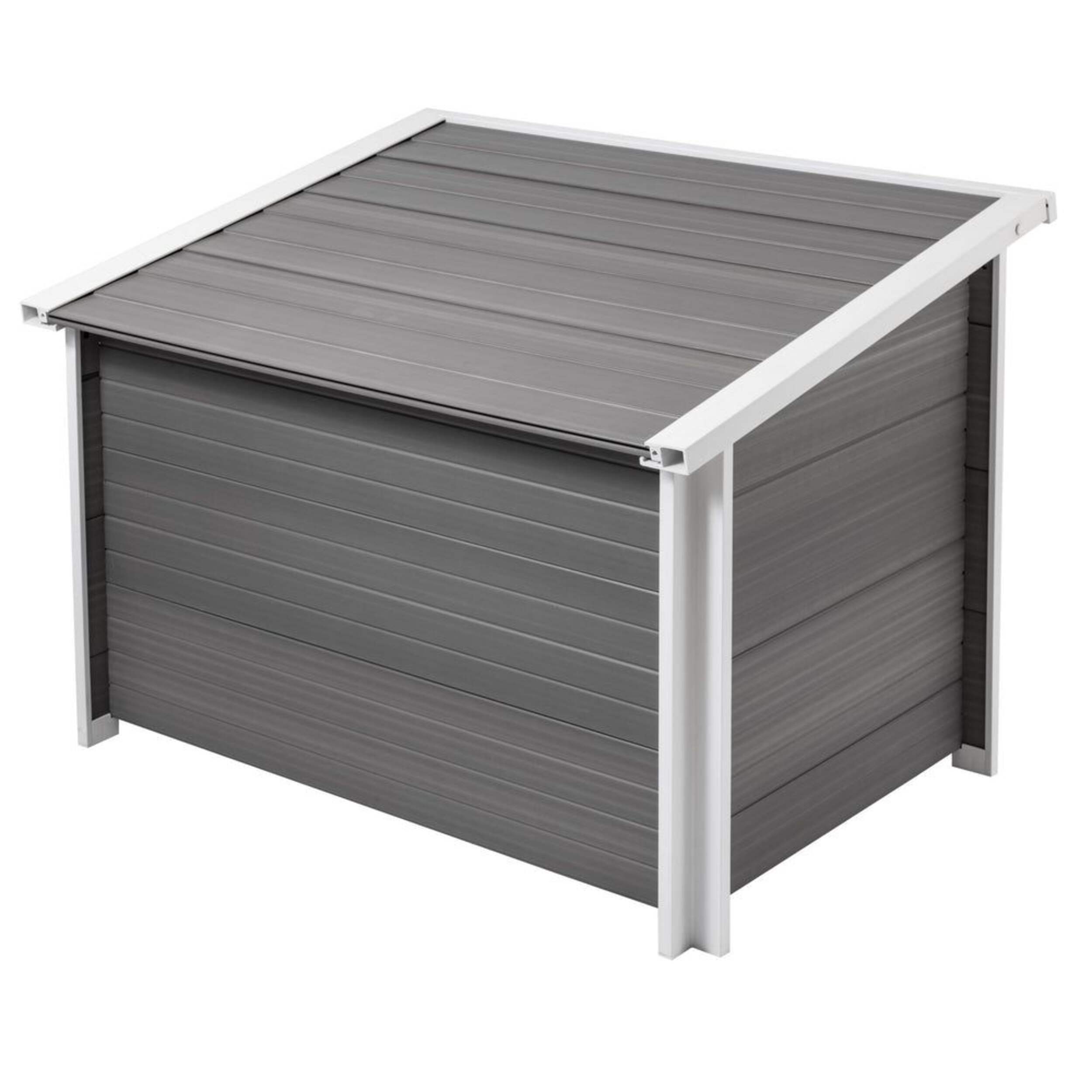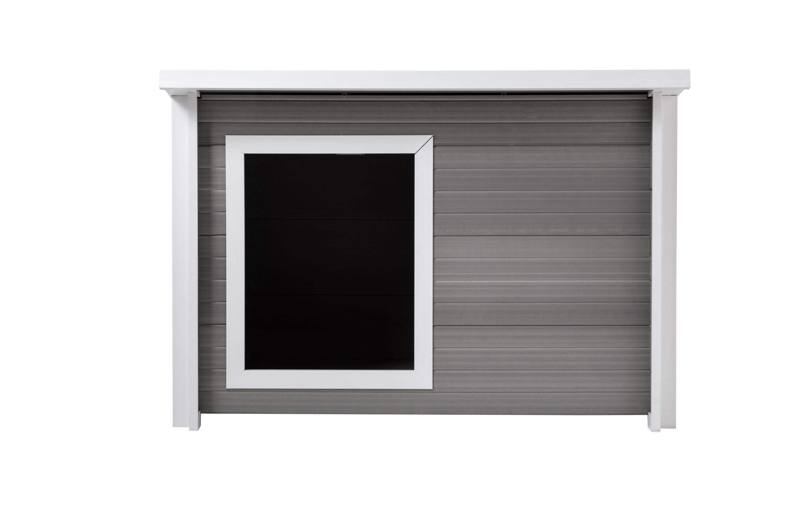 The ECOFLEX New Age Pet Rustic Lodge Dog House provides a cozy shelter for your canine companion. Made with ECOFLEX, a blend of recycled polymers and reclaimed wood fibers, this eco-friendly house is impervious to moisture and odor. The raised floor allows superior ventilation while the removable roof makes cleaning a breeze. Quick and easy to assemble, this extra large grey and white house easily accommodates dogs up to 120 pounds. With its rustic style and durable ECOFLEX construction, the New Age Pet Dog House offers your pet a healthy and happy home.