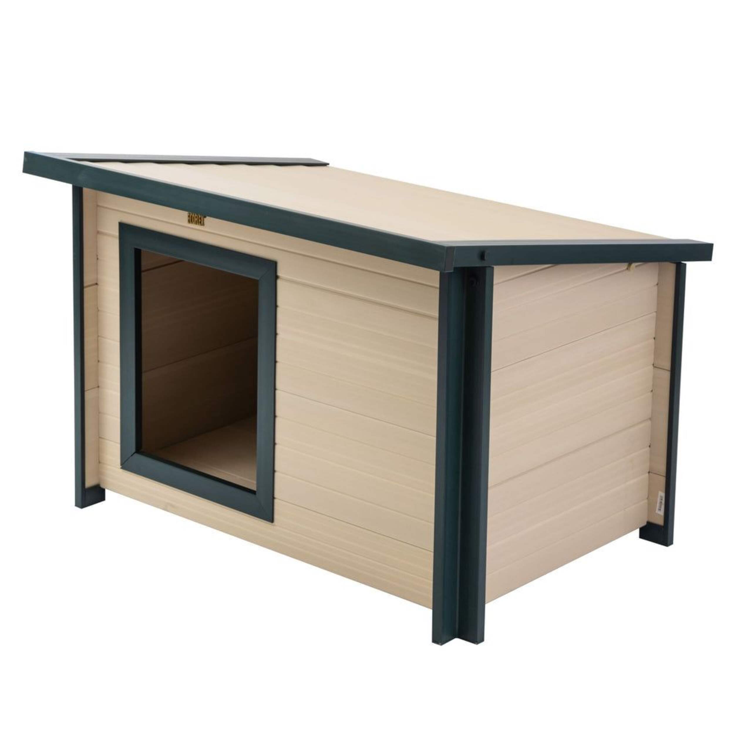 The ECOFLEX New Age Pet Rustic Lodge Dog House provides a cozy and eco-friendly shelter for dogs up to 110 pounds. Made from a proprietary recycled polymer and wood fibre blend called ECOFLEX, this dog house is impervious to moisture and odours. Its raised floor allows superior ventilation while the removable maple roof with green trim simplifies cleaning. With quick and easy assembly, this medium sized New Age pet dog house features a rustic maple design to blend into any outdoor space. The durable ECOFLEX material creates a healthy environment to keep your pet happy.