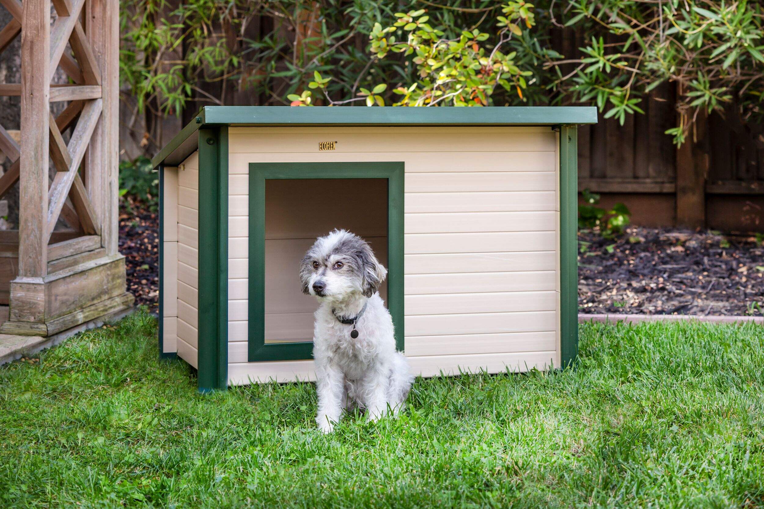 The New Age Pet® Ecoflex Rustic Lodge Dog House, Medium, is made with ECOFLEX®, a proprietary composite blend of recycled polymers and reclaimed wood fiber by-products