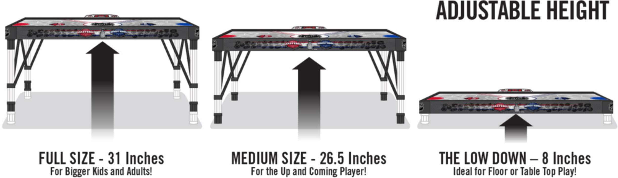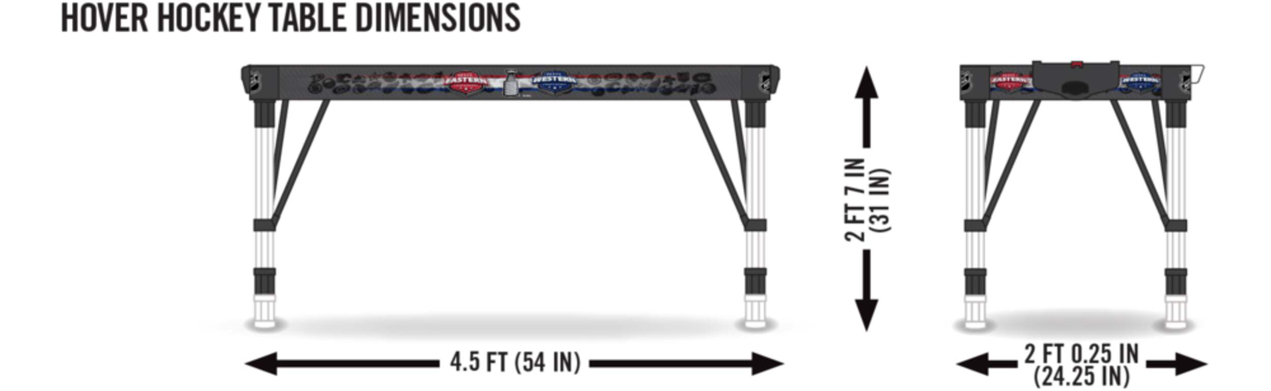For fast and exciting gameplay the NHL® Adjust & Store Hover Hockey Table is the perfect fit for everyone! Ideal for both table top or floor play, the simple screw-in leg design allows you to easily change the table height to suit a variety of ages and skill sets. Features fully automatic LED scoring and sound. Comes complete with two pushers and two pucks.