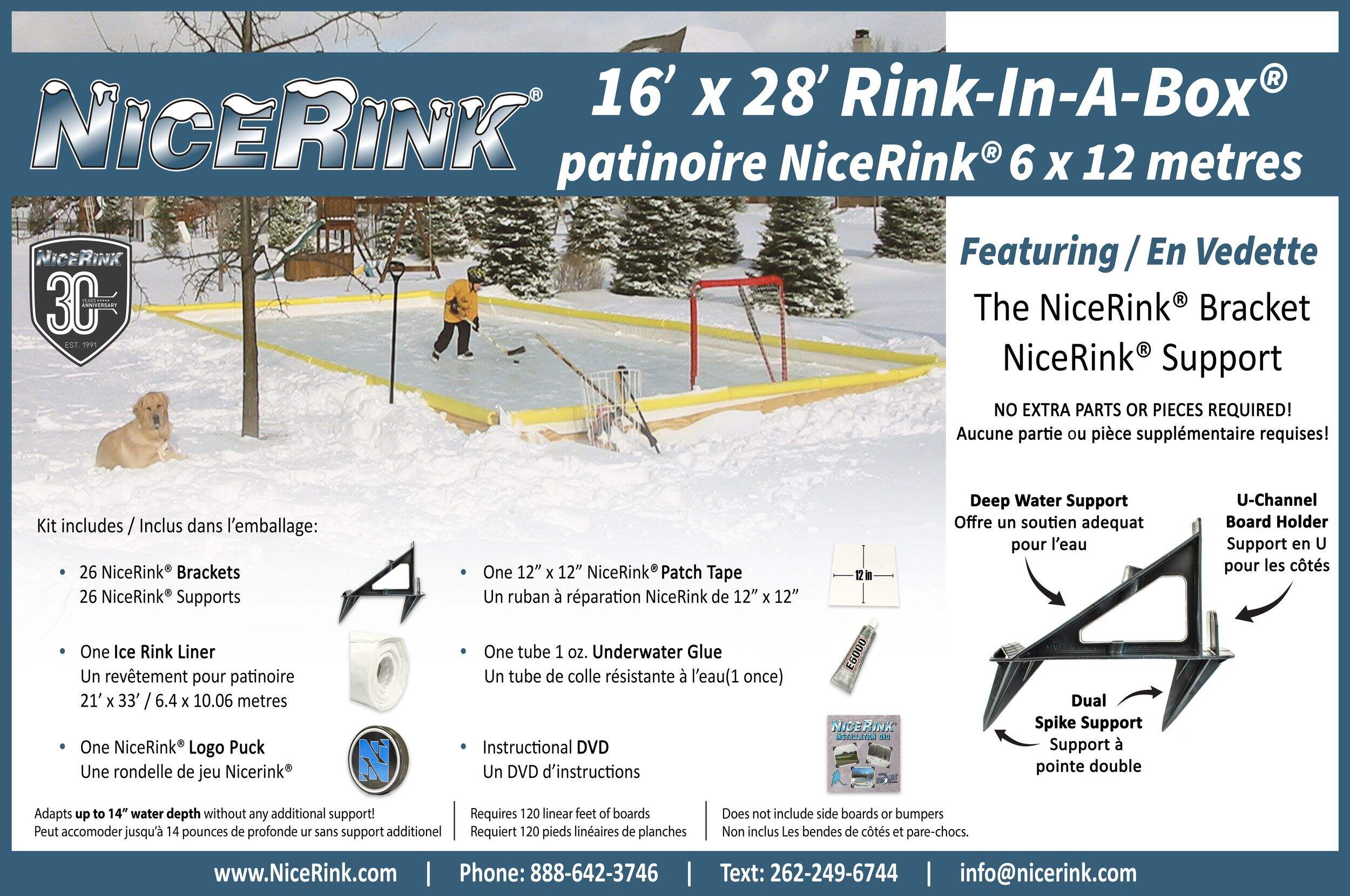 Includes 26 brackets, 1 ultra-white liner, 1 patch pad, 1 tube of water resistant glue, and 1 NiceRink puck