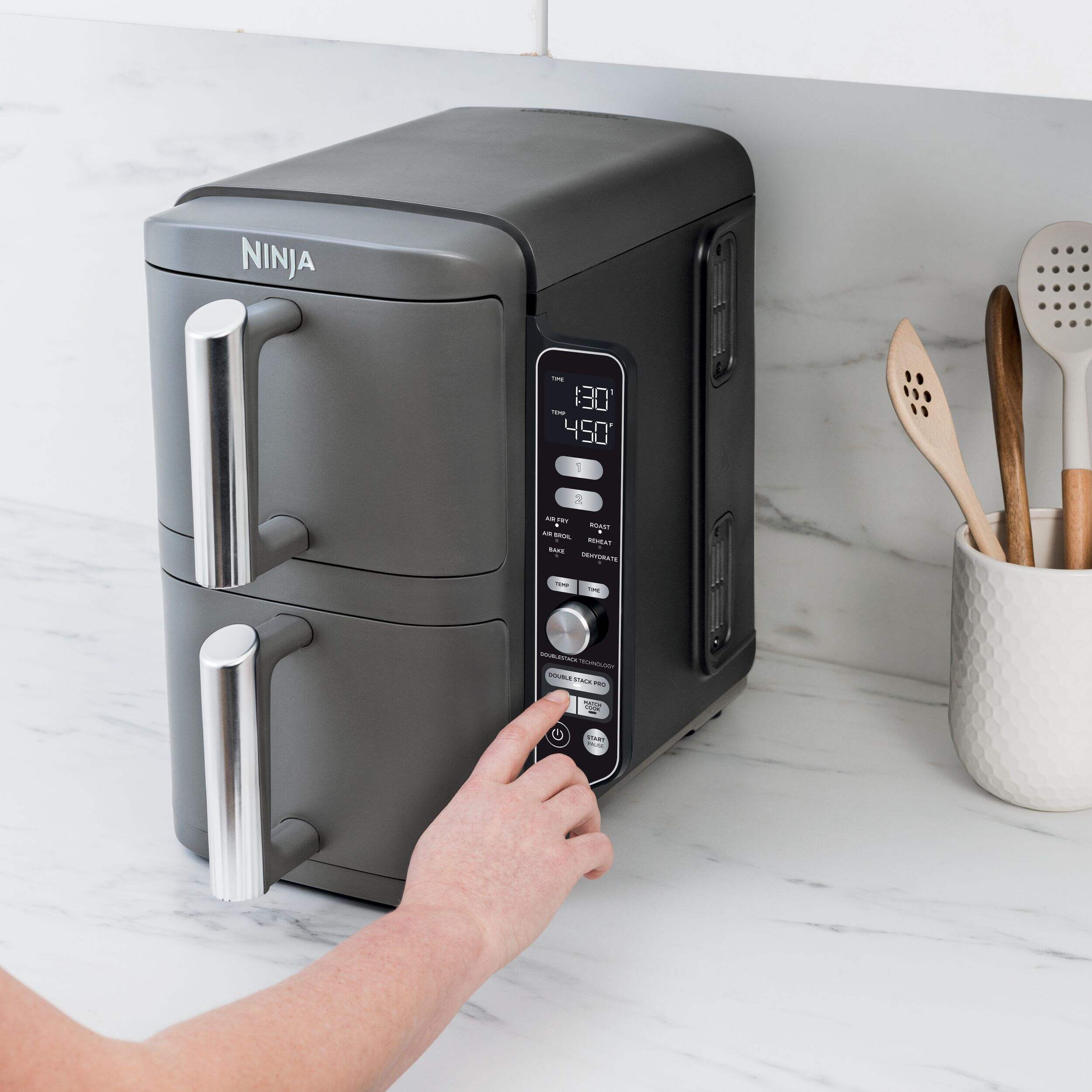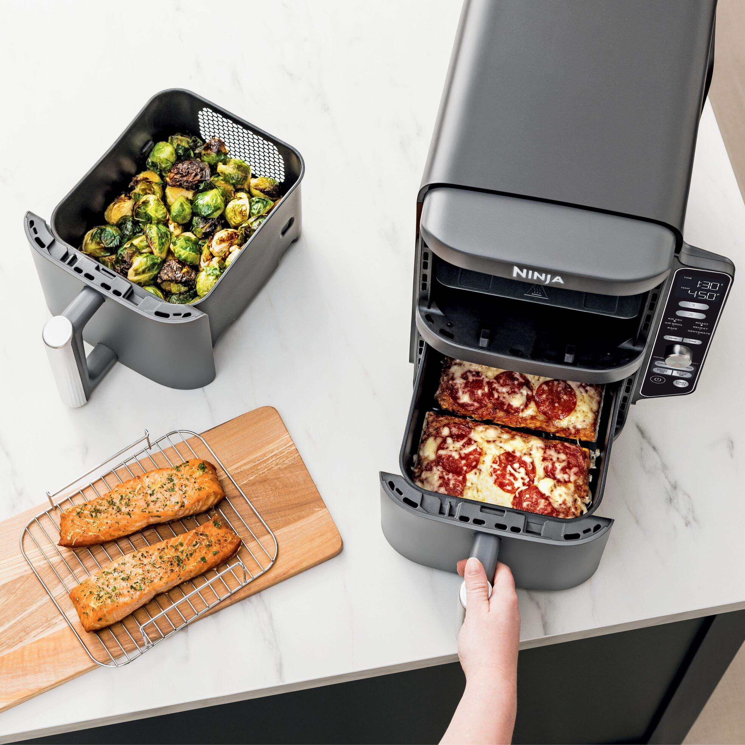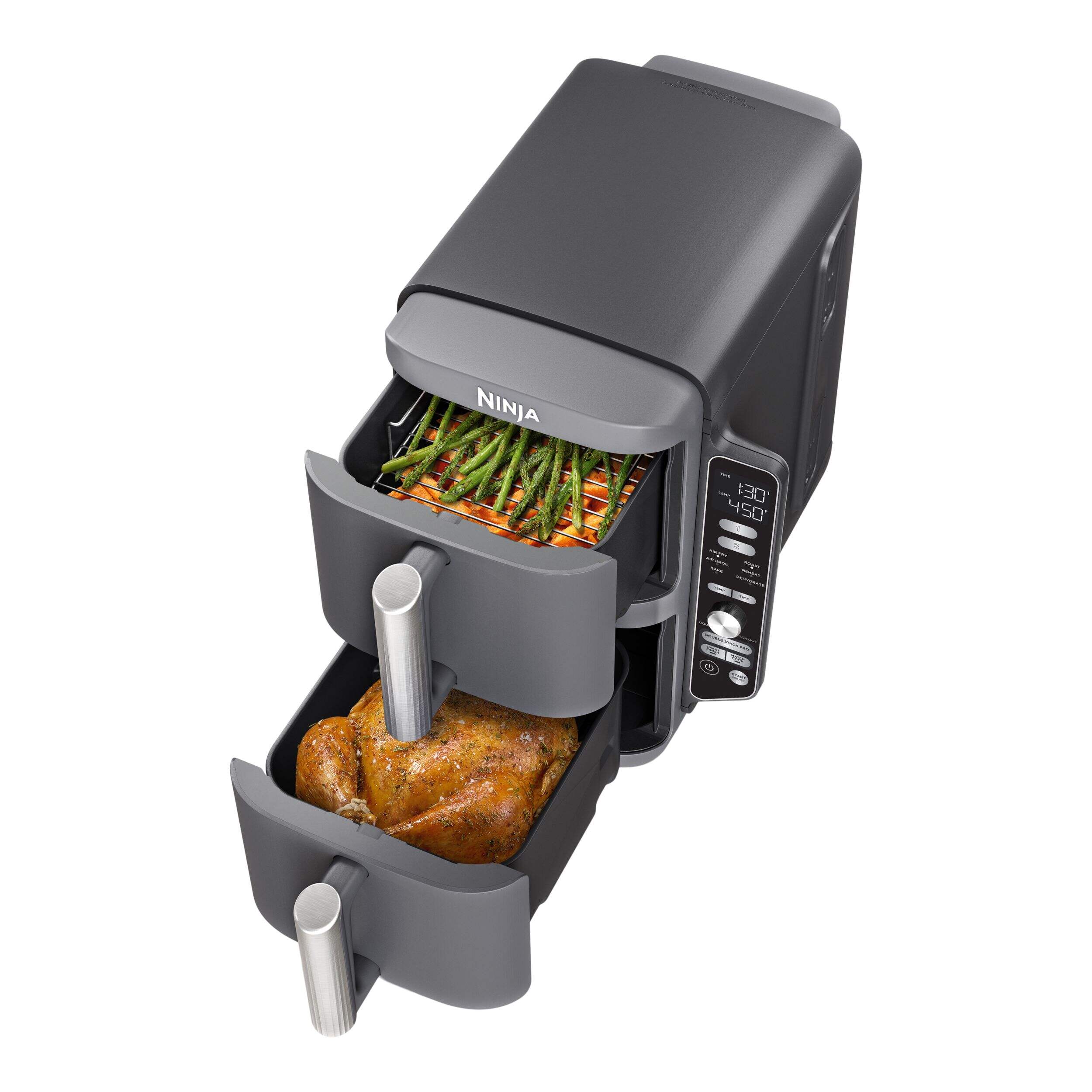 Ninja DoubleStack XL Dual Zone Multi-Rack Air Fryer features 2 independently controlled baskets so you can cook 4 foods at once