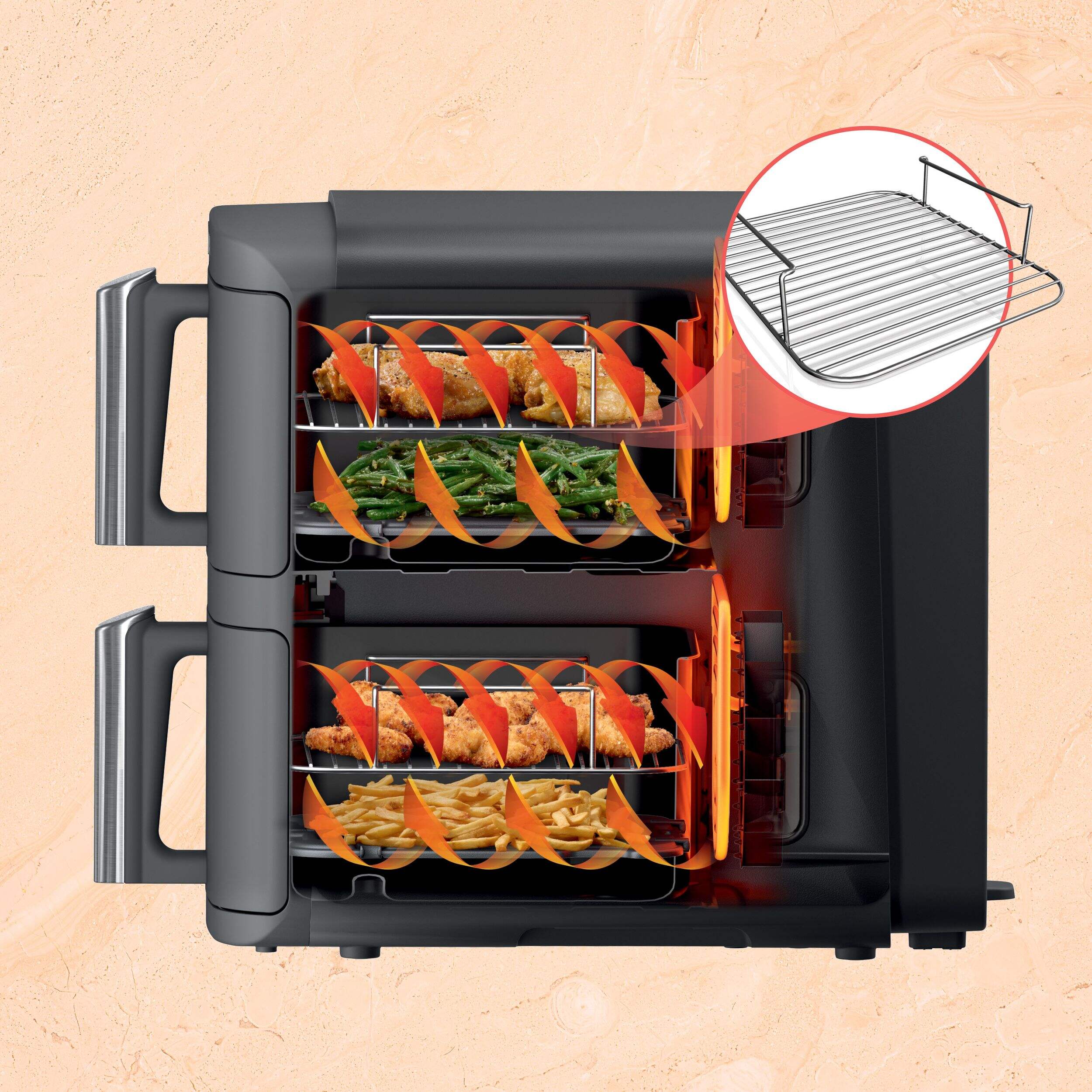 Includes 2 removable stacked meal racks allowing you to cook on 2 levels per basket