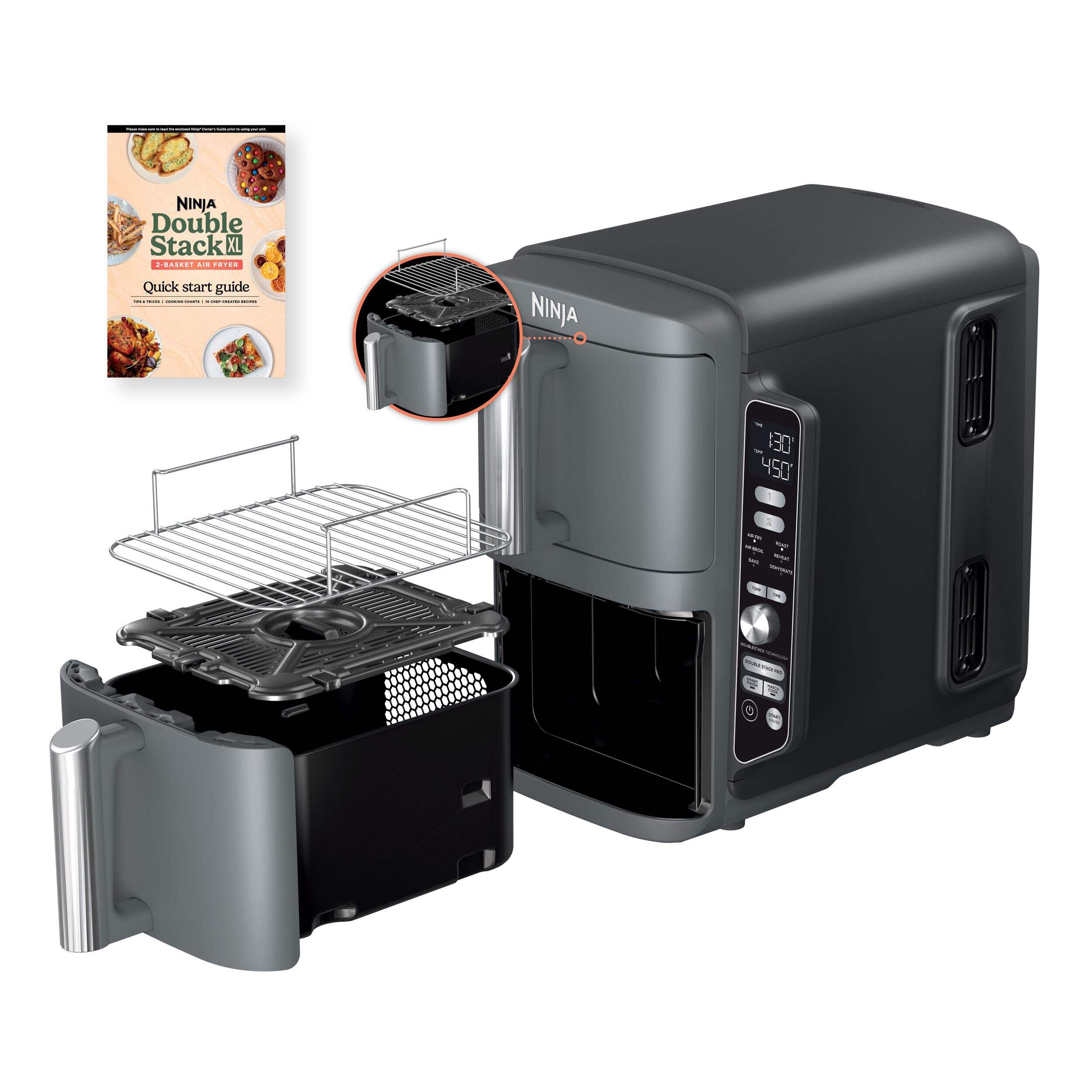 Meet the Ninja® DoubleStack™ XL 2-Basket Air Fryer, the only stacked 2-basket air fryer that can cook up to 4 foods at once. Designed for efficiency, versatility, and easier family-sized meals, Ninja’s stacked 10-QT (9.5 L) design maximizes counter space while giving you the performance and capacity of 2 air fryers in the counter space of 1*. Only Ninja has DoubleStack Air Frying technology that delivers the optimal air flow and even heat required to cook 4 foods at once for crispy, golden perfection every time. Simply load your veggies onto the crisper plate, insert the stacked meal rack into the basket, and place your proteins on top to cook 2 different foods in one basket. Two 5-QT (4.7 L) baskets allow you to simultaneously prepare different dishes, making multi-tasking in the kitchen a breeze. Cook more food in a smaller footprint—easily fits two 5-lb (2.3 kg) chickens or 5 lbs (2.3 kg) of wings in each drawer. Perfect for smaller kitchens, enjoy delicious homemade meals while keeping your counter tops clear of clutter. * vs NINJA AF080C (power) and CHEFMAN 5QT Air Fryer