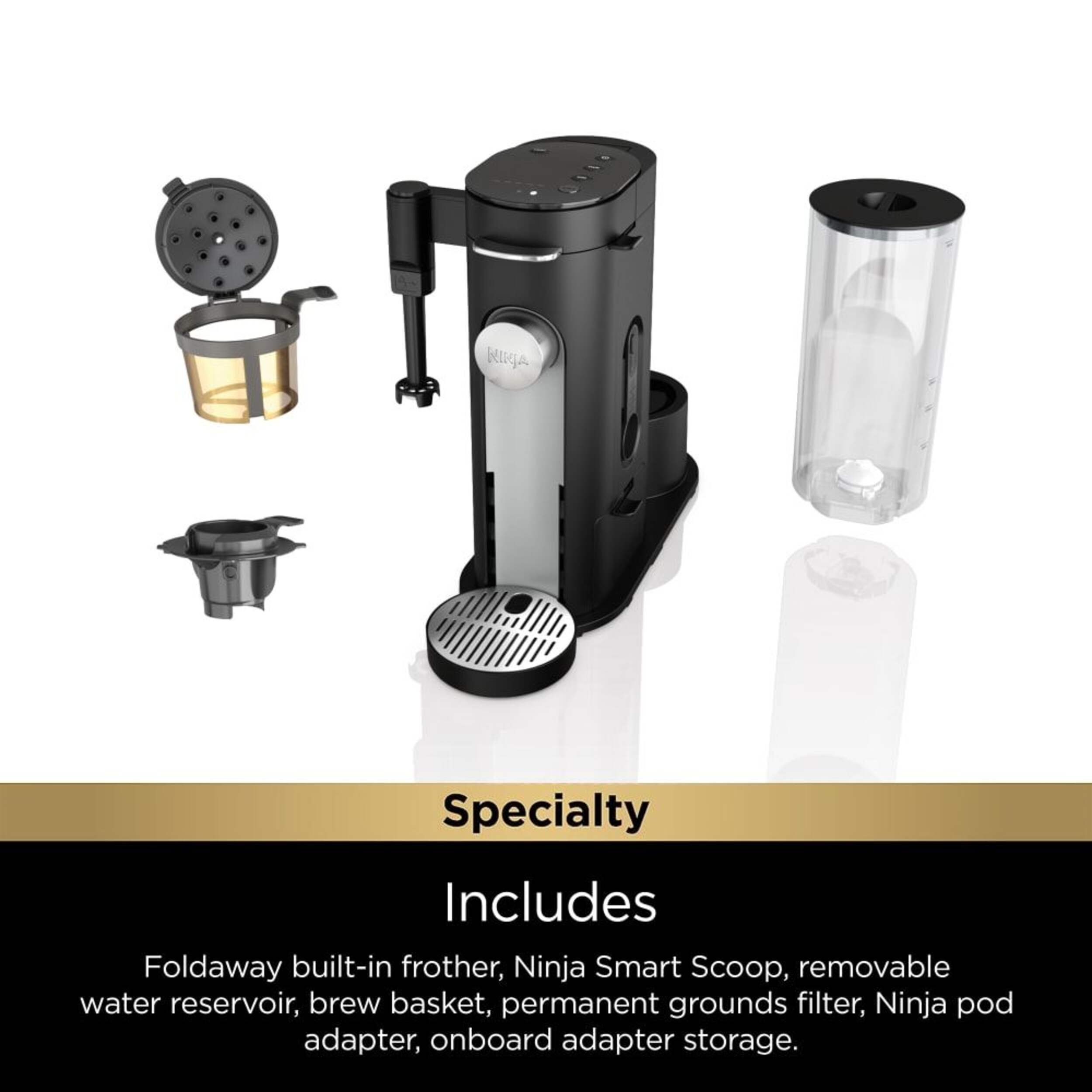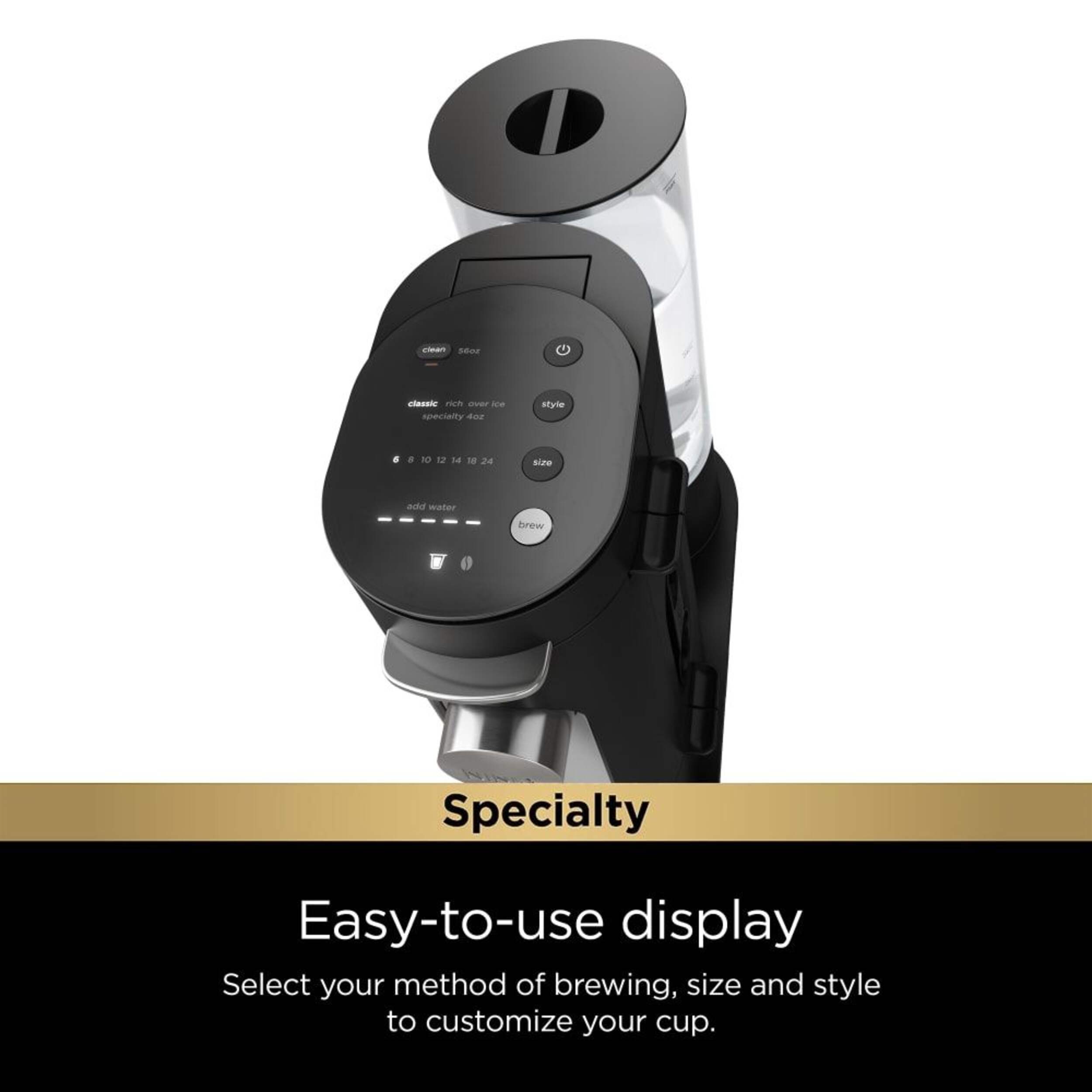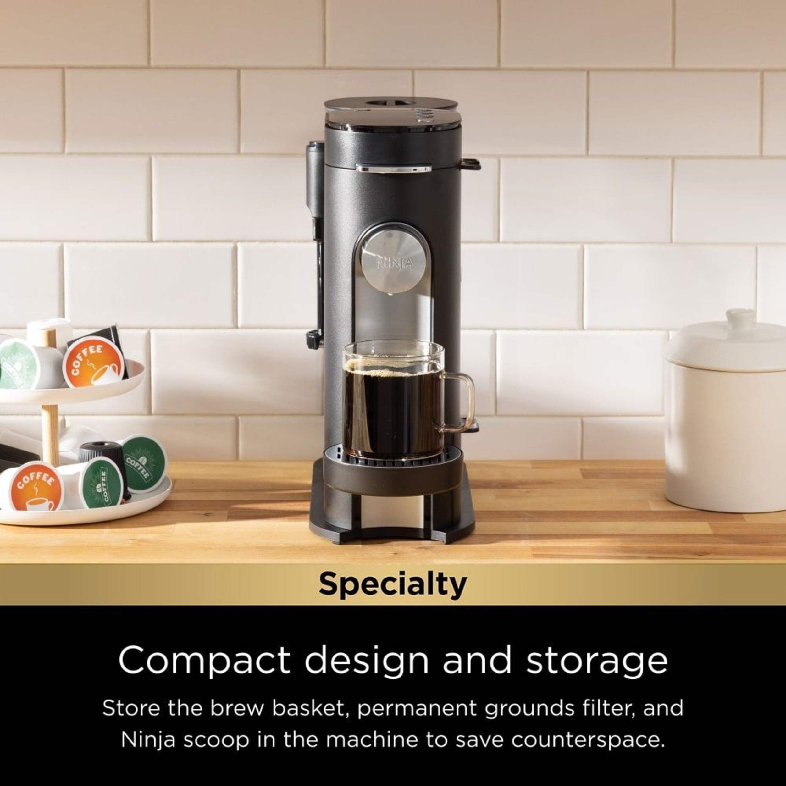 Ninja Dual Brew Mini Pro Single-Serve Pods & Grounds Specialty Coffee Maker conveniently brews your favourite grounds and coffee pods in up to 7 sizes from a 6-oz cup to a 240-oz travel mug. Choose from 4 brew styles: Classic, Rich, Over Ice or Specialty coffee. Create a coffeehouse-style drink at home with the built-in frother.