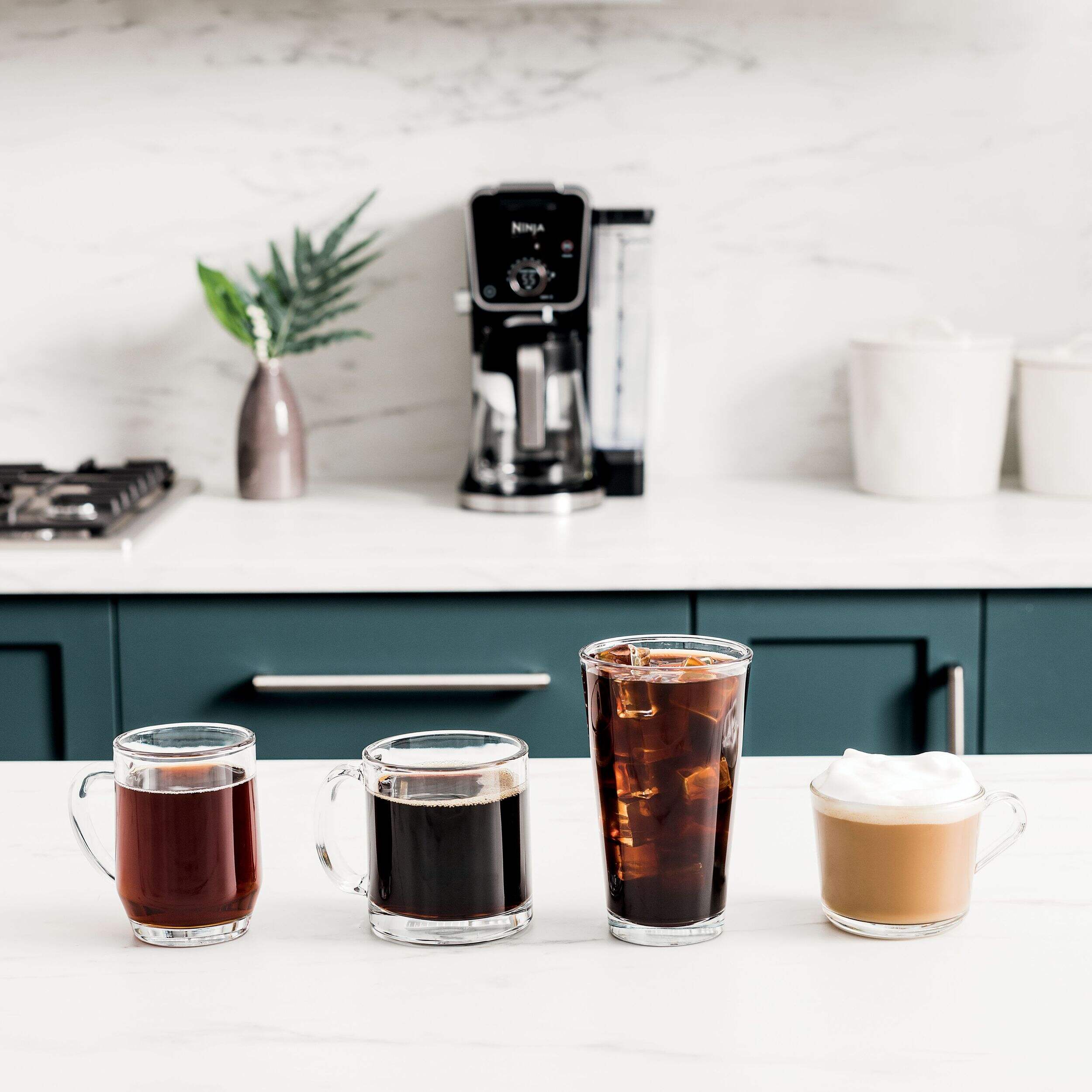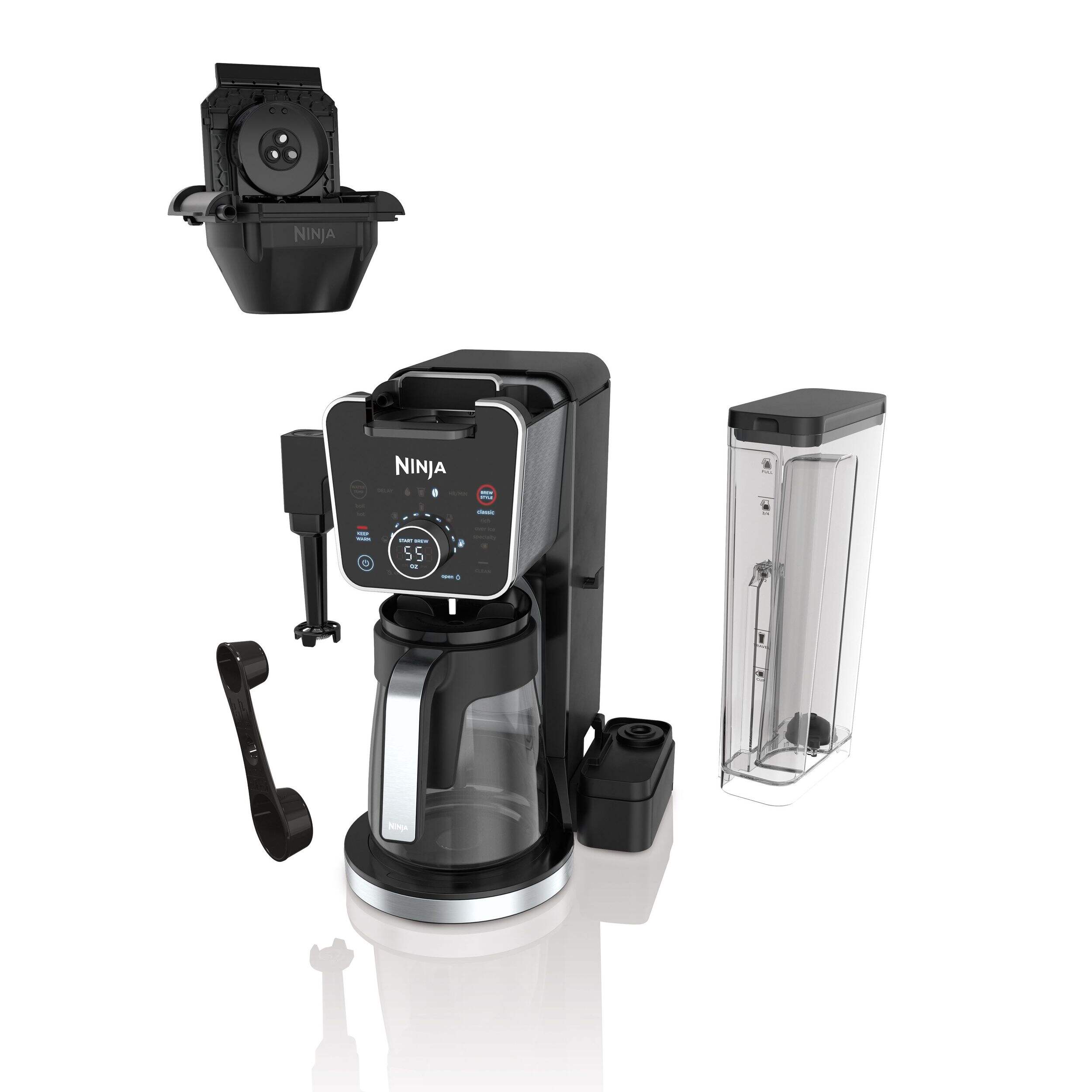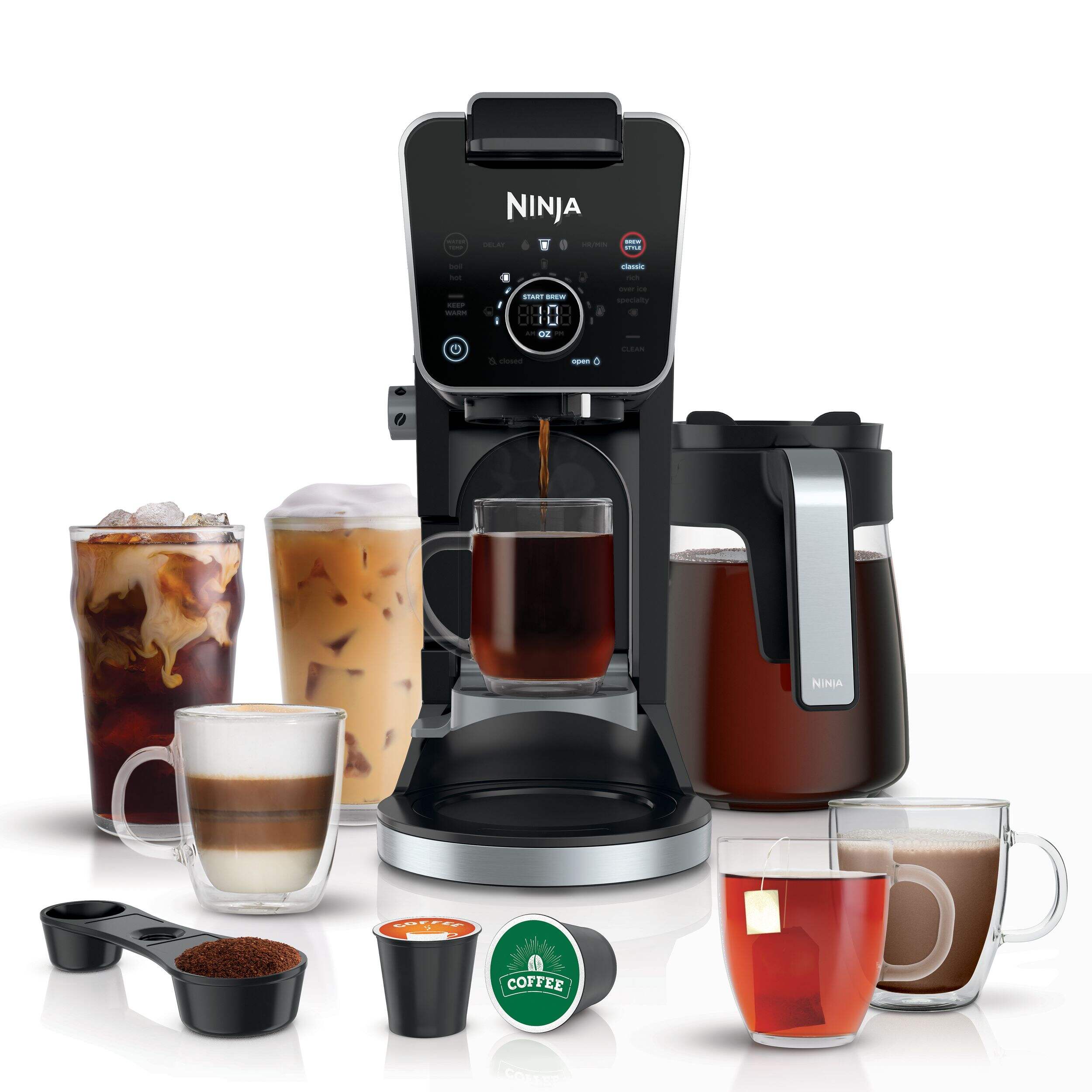 The Ninja DualBrew Pro Specialty Coffee System makes it easy to enjoy Classic, Rich, Over Ice, and Specialty brews from your favourite coffee grounds or K-Cup coffee pods. Customize your brew with nine grounds sizes from single serve to carafe and four pod sizes from 6 to 12 oz. You can use the fold-away frother to create cappuccinos and lattes or dispense hot water from the independent hot water system to make tea or soup.