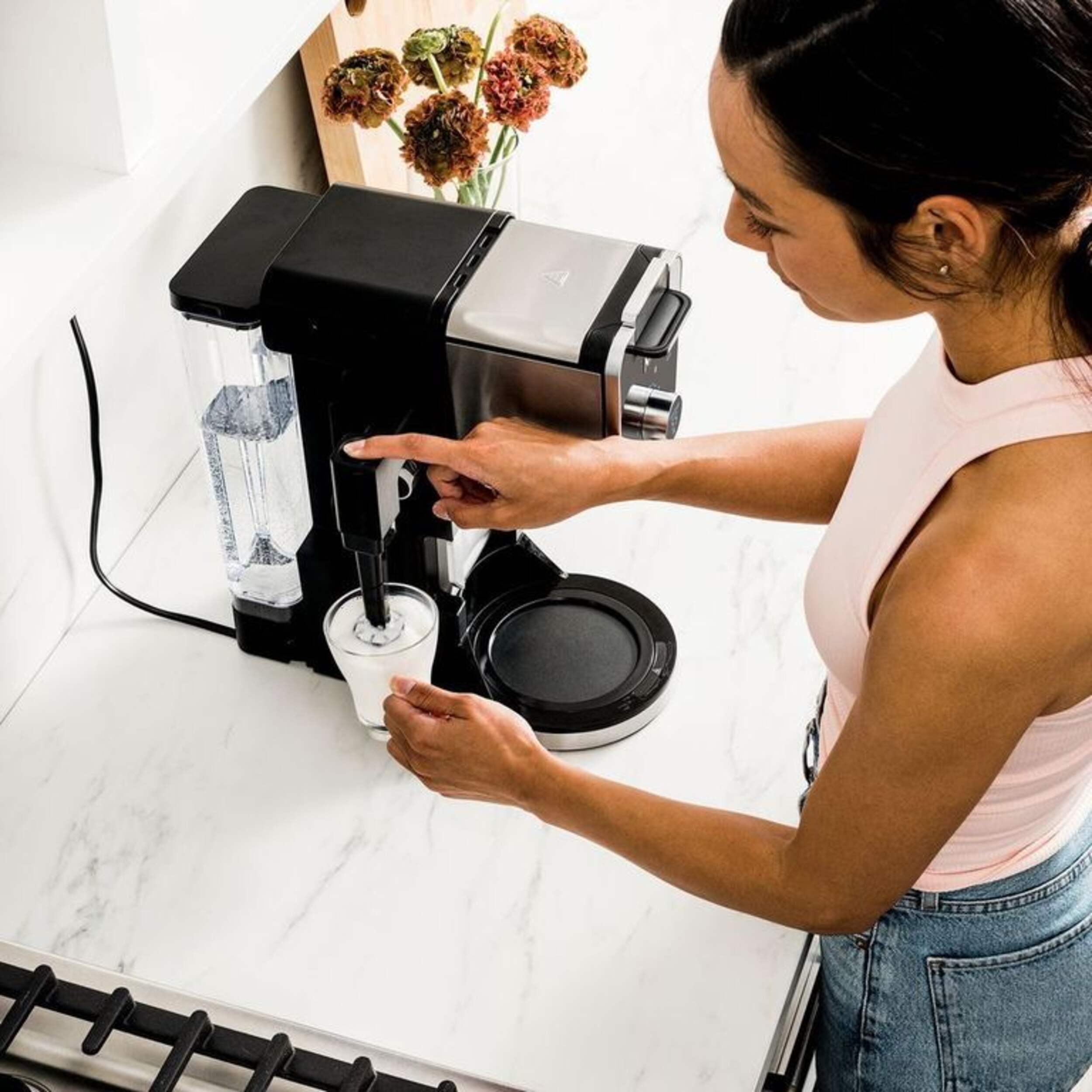 Fold-away frother turns hot or cold milk or milk alternative into silky-smooth froth; removable for easy cleaning