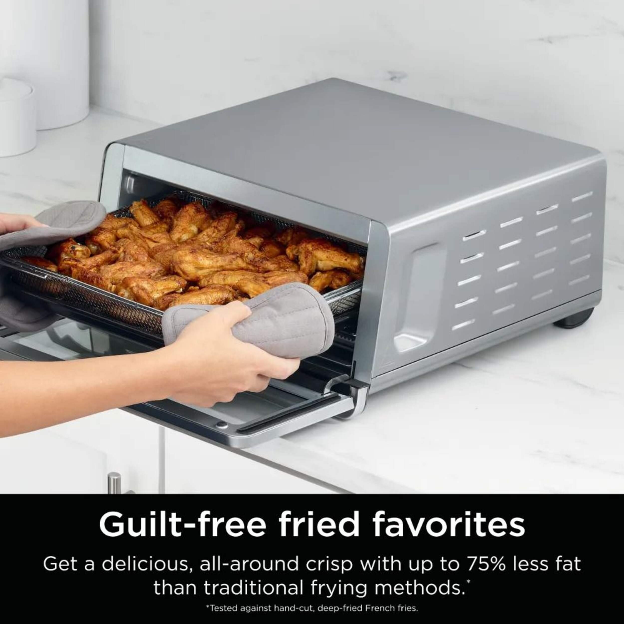 The Ninja® Flip Toaster Oven & Air Fryer is a convection oven, air fryer, and toaster that crisps and flips up and away. Get extra-large capacity without sacrificing counter space with its unique design that allows you to flip it up against your backsplash when not in use so you can save 50% more space on your countertop. OvenCrisp Technology™ combines infrared heat with rapid, circulating hot air all around your food for quick, edge-to-edge even cooking providing you with optimum cooking results. The Ninja® Flip includes 8 functions so no matter what you’re craving, you can make it all in this countertop appliance—air fry, roast, broil, bake, pizza, toast, bagel, dehydrate all in one.