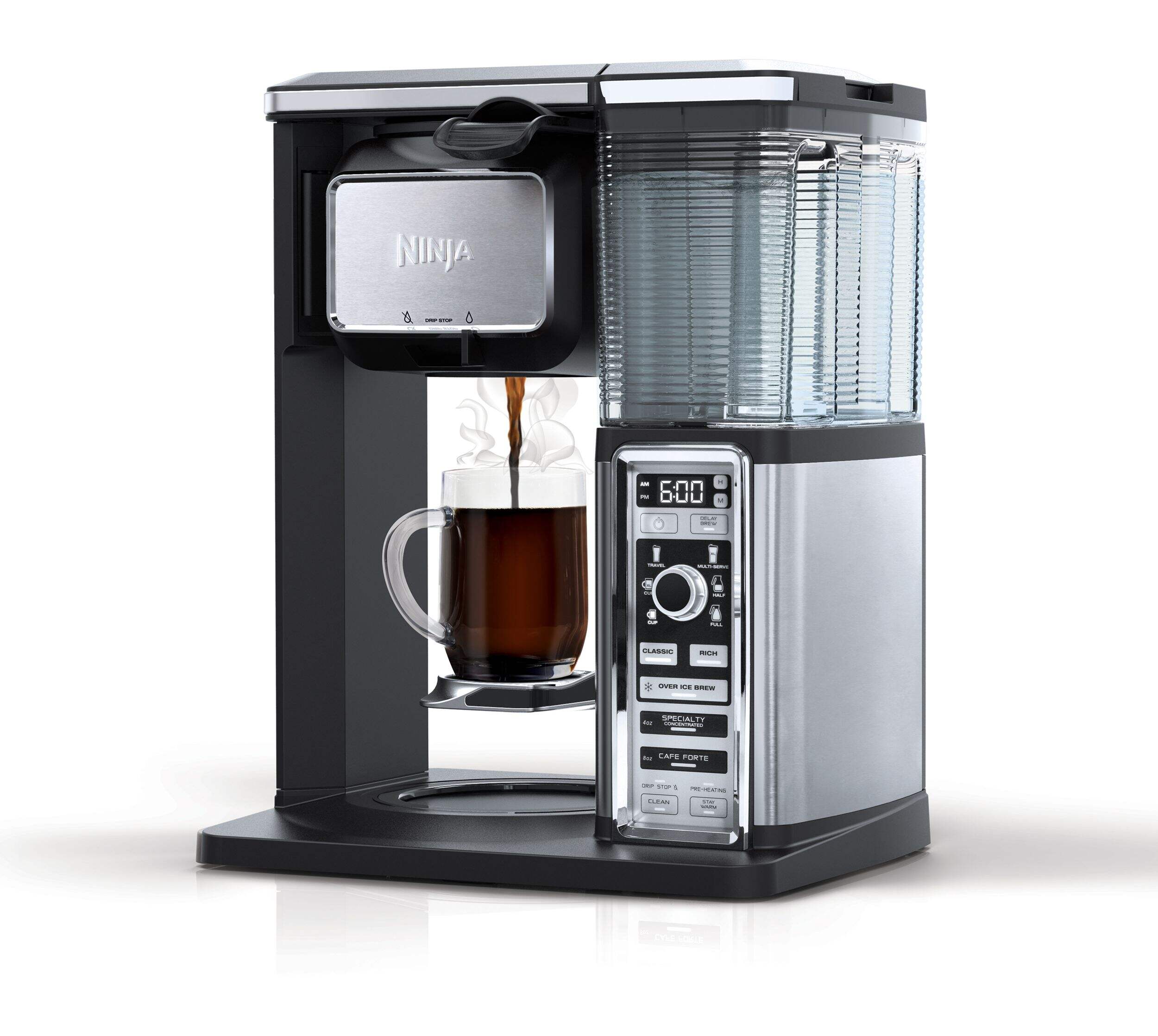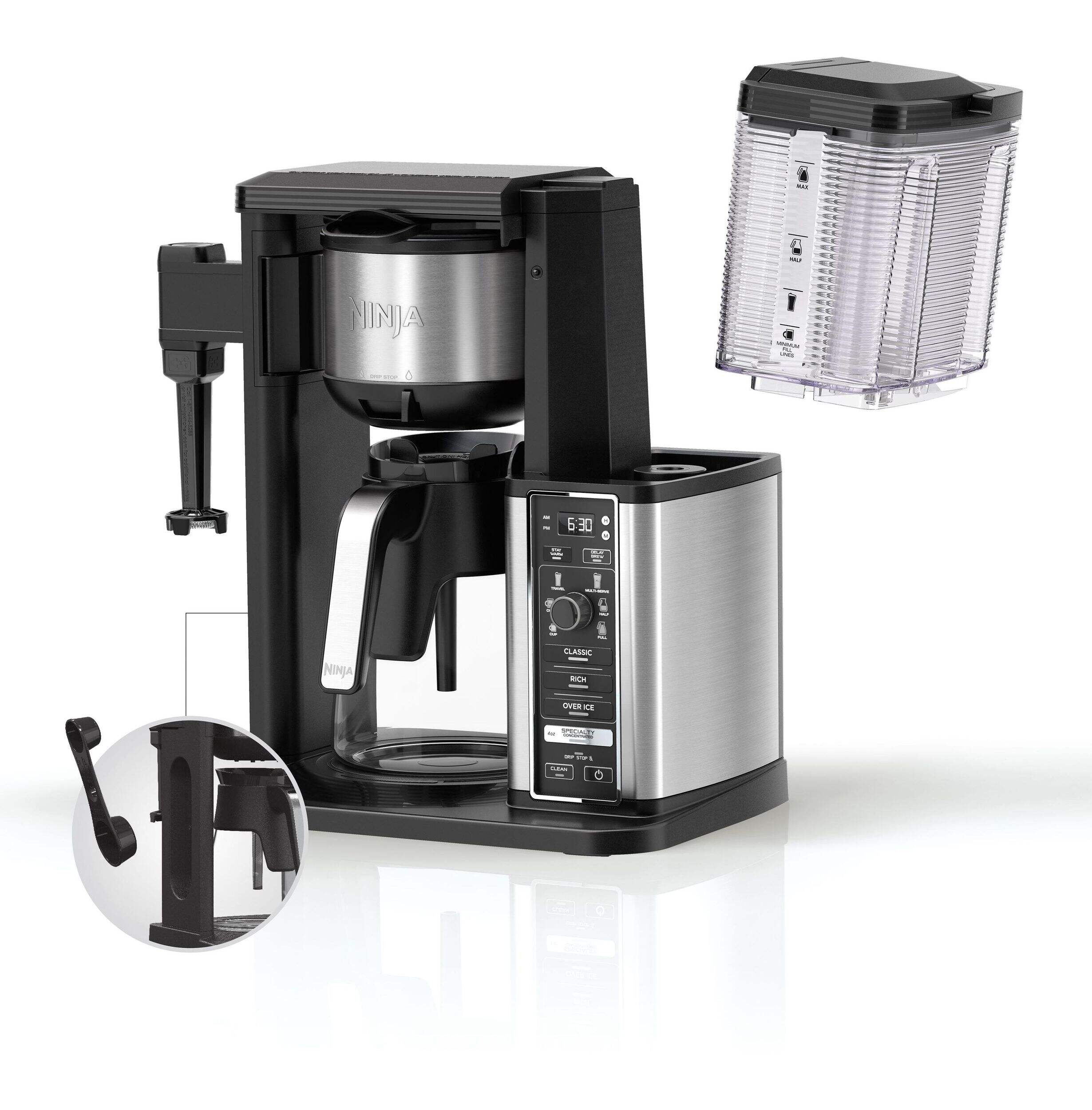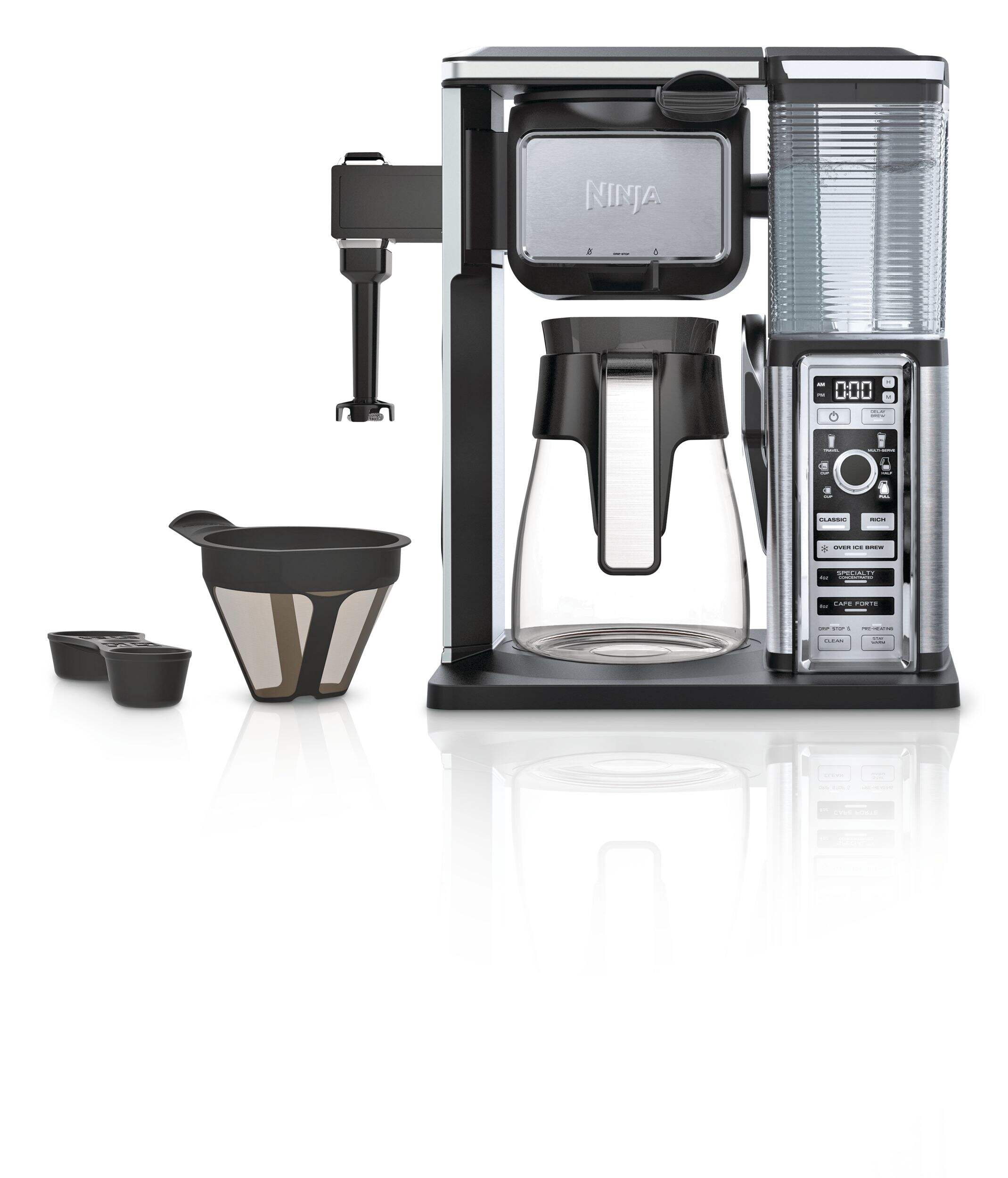 Includes: 50 oz. (10-cup) glass carafe, fold-away frother, recipe inspiration guide, gold-tone permanent filter, Ninja Smart Scoop, removable water reservoir, Quick Start Guide and Owner's Guide