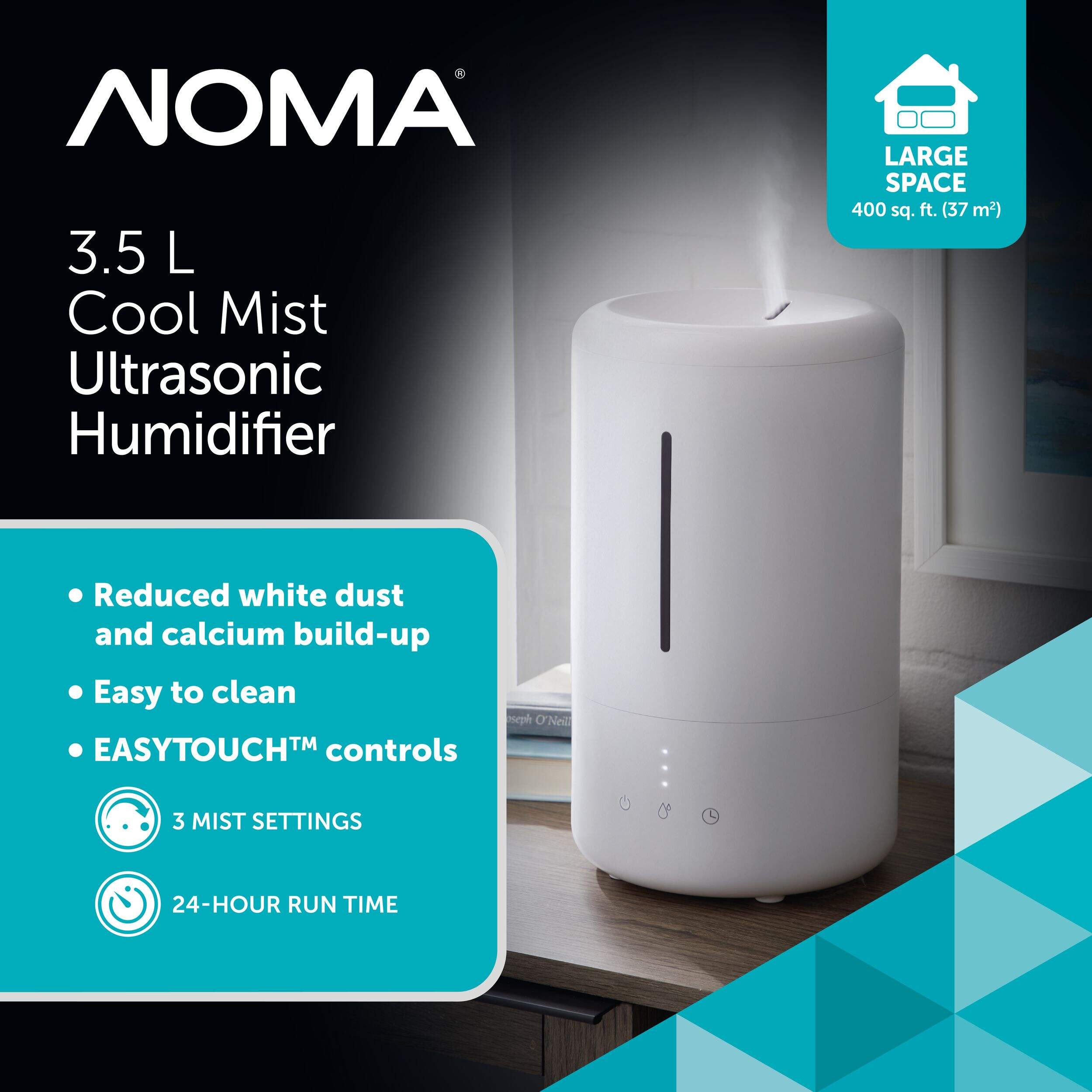 The NOMA Ultrasonic Cool Mist Humidifier is crafted to effectively combat dry air in rooms up to 400 square feet. Featuring a 3.5-litre water reservoir and three mist settings, it provides continuous humidity control for up to 24 hours. The convenient top-fill design makes refilling hassle-free, while the 360-degree mist nozzle ensures even moisture distribution throughout the room. A sleek touch-control panel allows for easy adjustments for custom comfort.