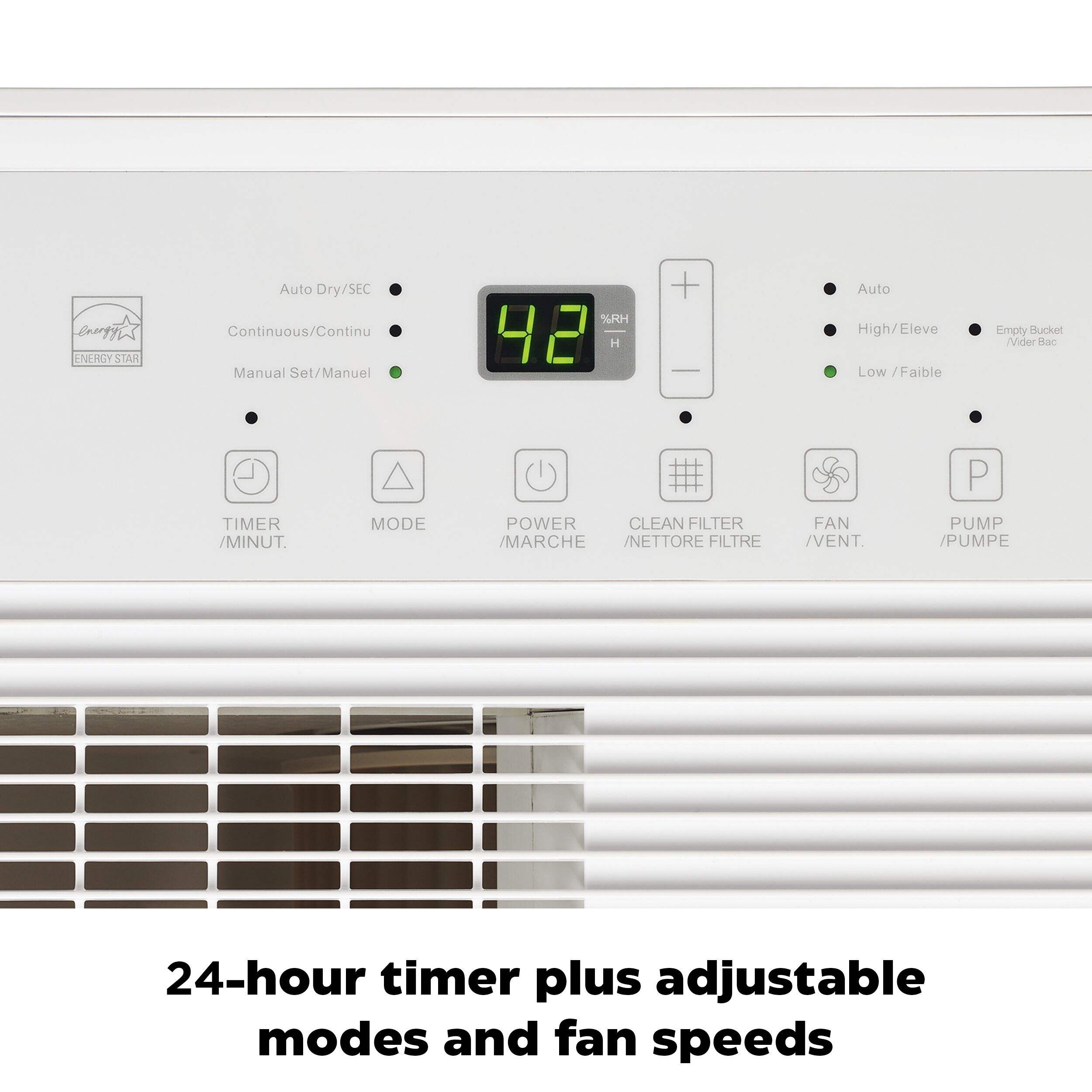 The NOMA 42 Pint 2-Speed ENERGY STAR® LED Dehumidifier helps you remove moisture from the air before it causes a problem. This dehumidifier features a sizable 42 pint internal storage and features two fan speeds, high and low, so you can customize how it operates depending on your needs. It also has three humidify modes including auto dry, continuous and manual set so you can enjoy a comfortable environment. The quiet dehumidifier is designed to consistently maintain normal humidity levels and has a convenient LED readout for monitoring, with a 24-hour timer.
