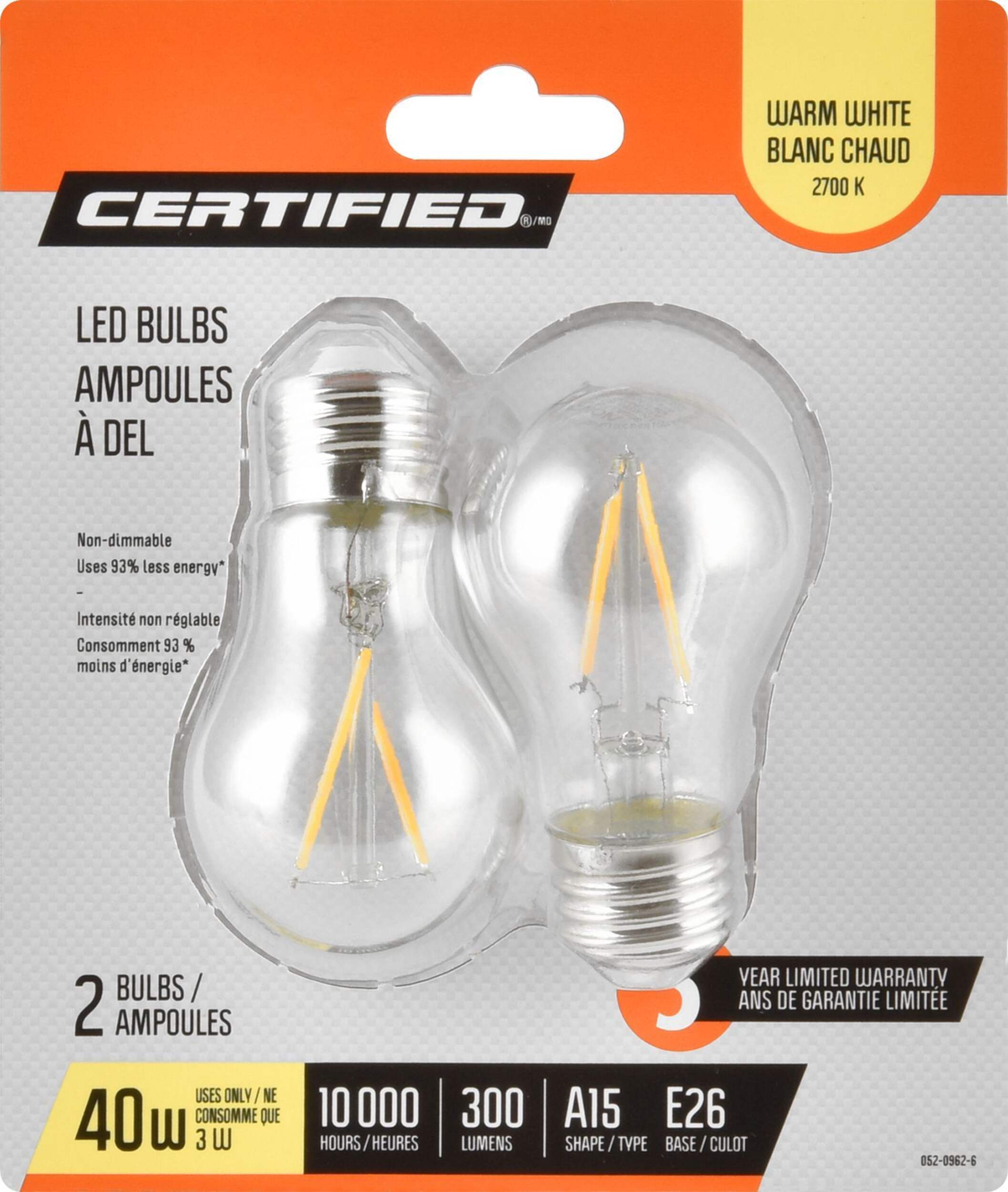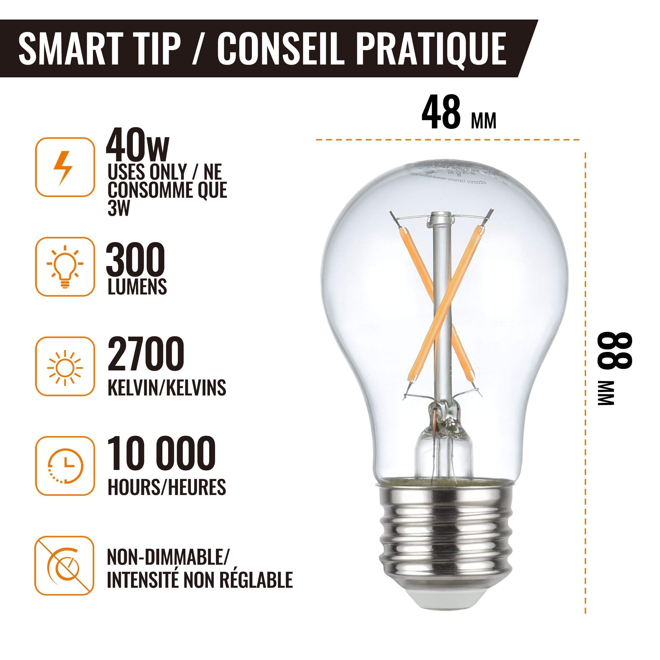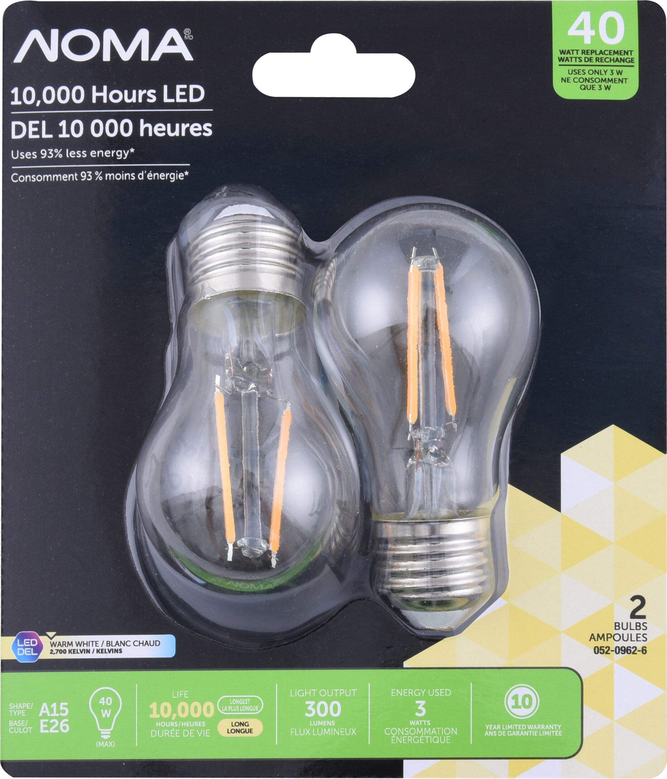 Enjoy instant brightness with the NOMA LED A15 40W E26 Base Soft White Bulb. Ideal for ceiling fans and lanterns, the LED bulb is non-dimmable with a clear finish and comes on at full brightness. This soft white LED light has a colour temperature of 2700K and an E26 medium base. The E26 LED bulbs in this two-pack are mercury free and emit little heat. They have outputs of 300 lumens and impressive lifespans of 10,000 hours.