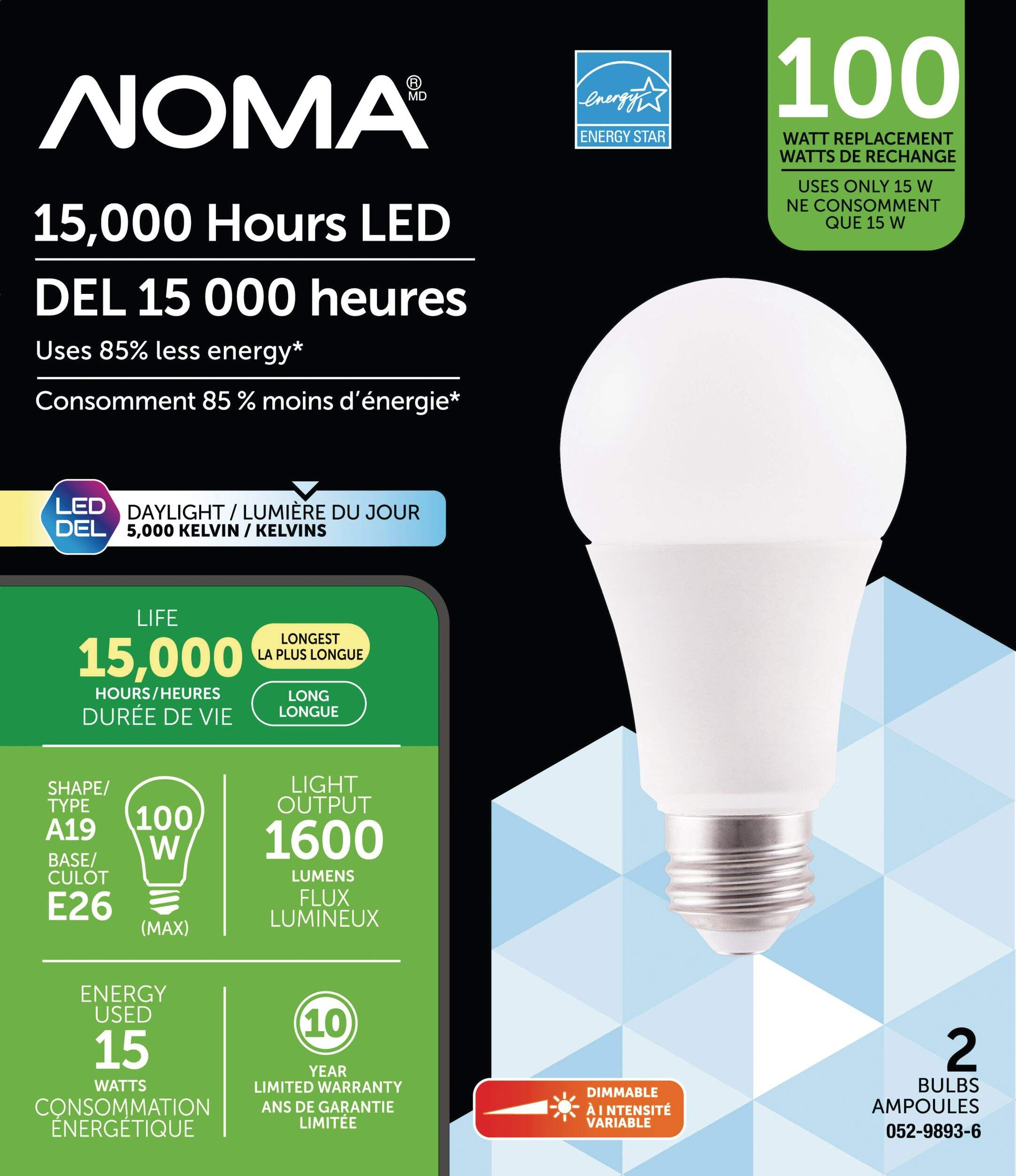 The NOMA LED A19 100W Dimmable Warm White Bulb helps provide bright task lighting while using far less energy than a traditional incandescent bulb. This LED light bulb stays bright for 15,000 hours, which means less time and energy wasted changing out burnt bulbs. The dimmable LED bulb emits the daylight glow of a 100W incandescent bulb while consuming a fraction of the power, allowing you to save money on your energy bills over time.