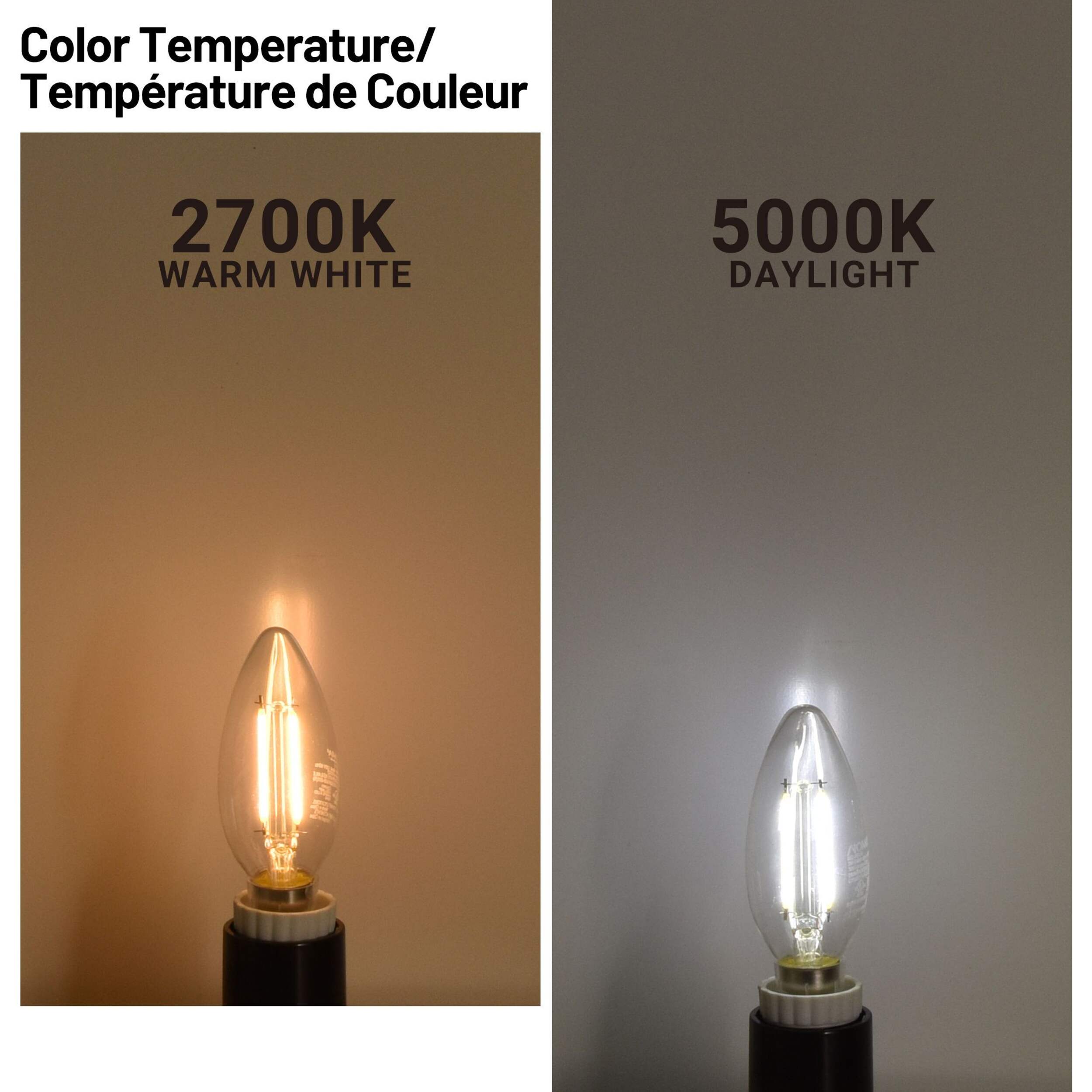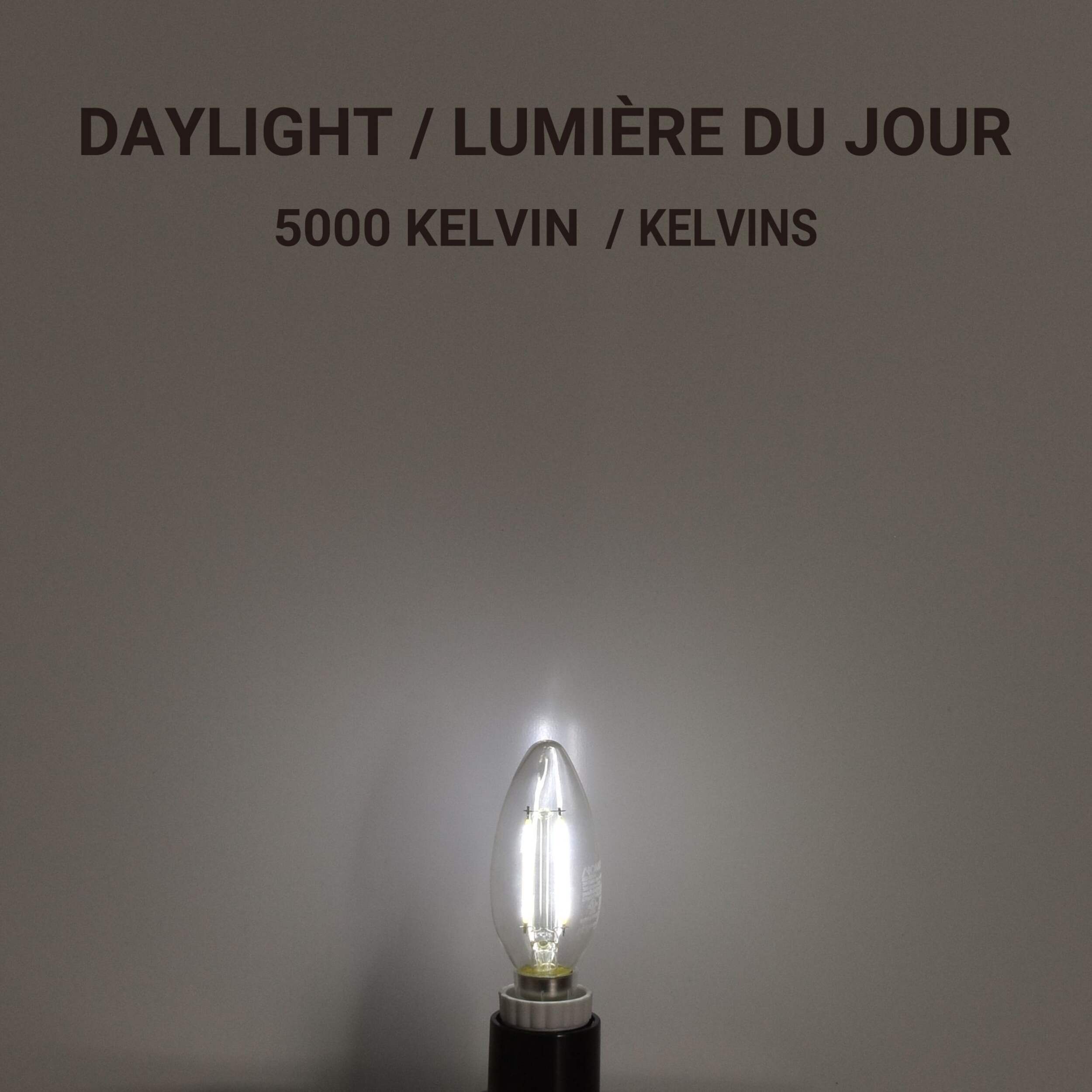 Featuring a sophisticated design, the NOMA Chandelier 25W E12 Base Torpedo Clear Dimmable Daylight LED Bulb pack is the perfect choice to add a decorative finishing touch to lighting fixtures with exposed bulbs, such as chandeliers and lanterns. Designed for function as much as style, this 2-pack of E12 LED light bulbs uses only 2.5W of energy to help you save costs, and emits a bright light that emulates daylight for better visibility.