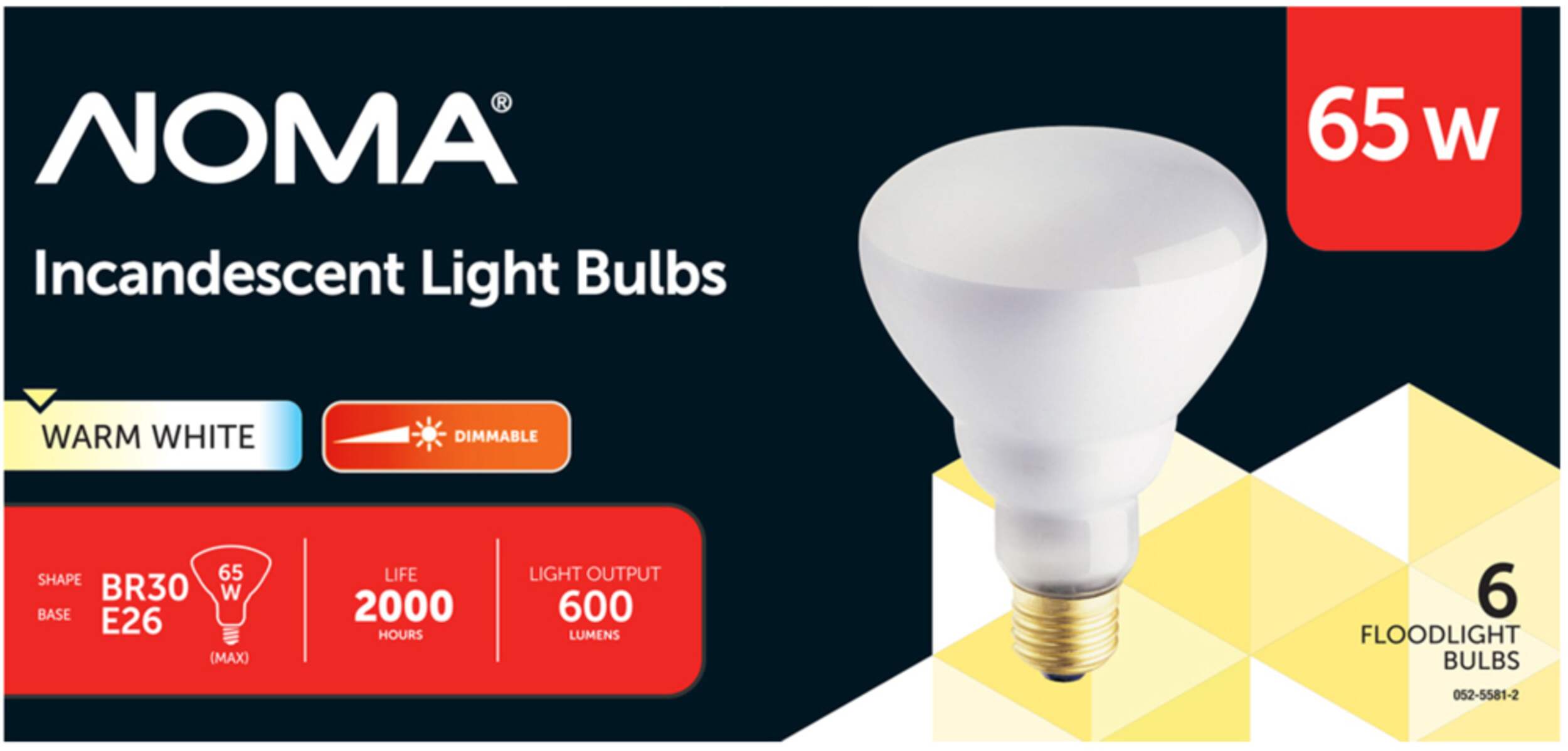 The NOMA 65W BR30 Incandescent Floodlight Bulbs output 600 lumens of light and offer a life span of up to 2000 hours
