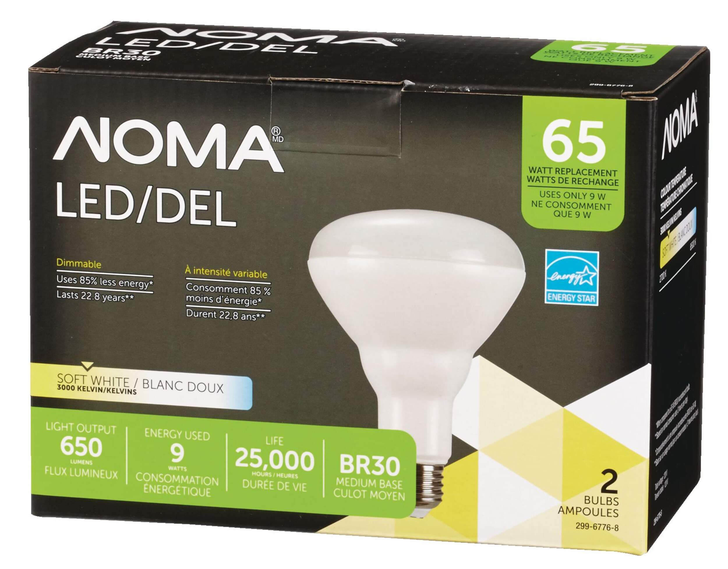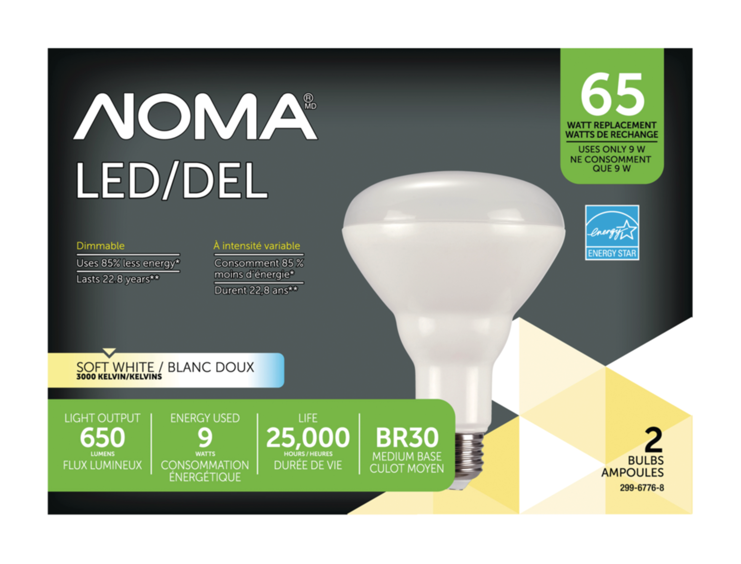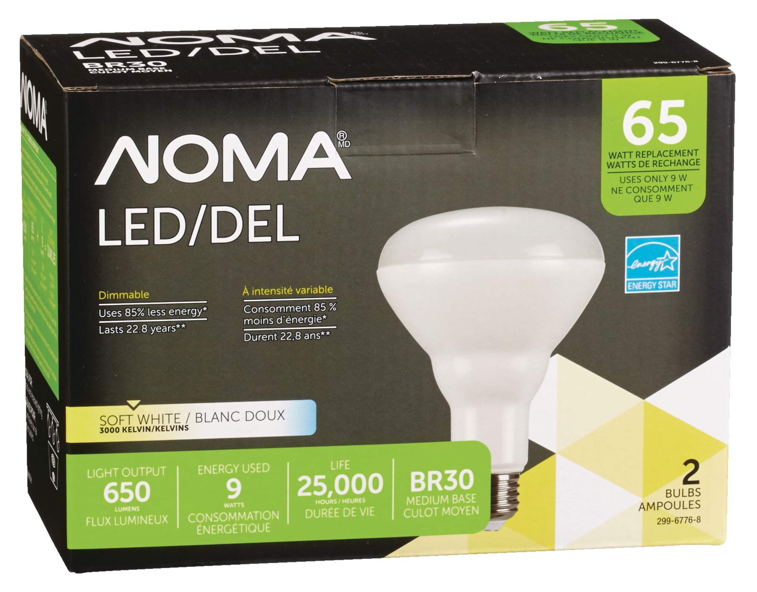 Using 85% less energy than traditional alternatives, the NOMA 65W BR30 LED Light Bulb provides 650 lumens of soft white light and has a lifespan of up to 25,000 hours, so you can use this bulb for years before having to replace it. This long-lasting, energy-efficient LED bulb is ENERGY STAR® rated and suitable for general indoor household use. This indoor LED bulb features a BR30 medium base and uses just 9-watts of power.