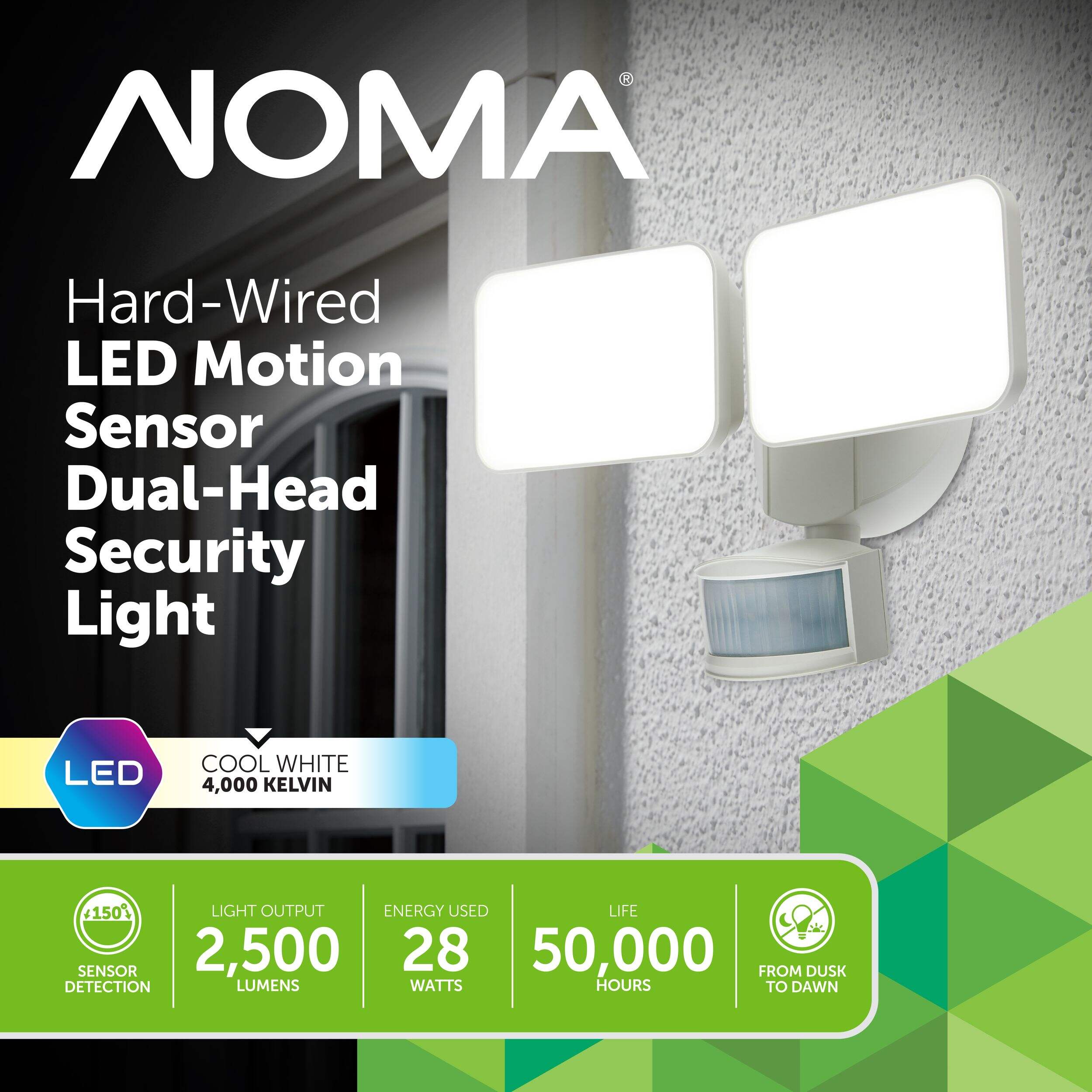 Enhance your home's security with the NOMA Hardwired 2-Head Dusk-to-Dawn Motion Detected LED Security Light. This powerful light provides 2500 lumens of bright illumination, ensuring your outdoor spaces are well-lit and safe. The dusk-to-dawn sensor automatically turns the light on at night and off during the day, while the motion detector activates the light when movement is detected. Built with durable materials and designed for easy installation, this security light is perfect for enhancing safety and visibility around your home.