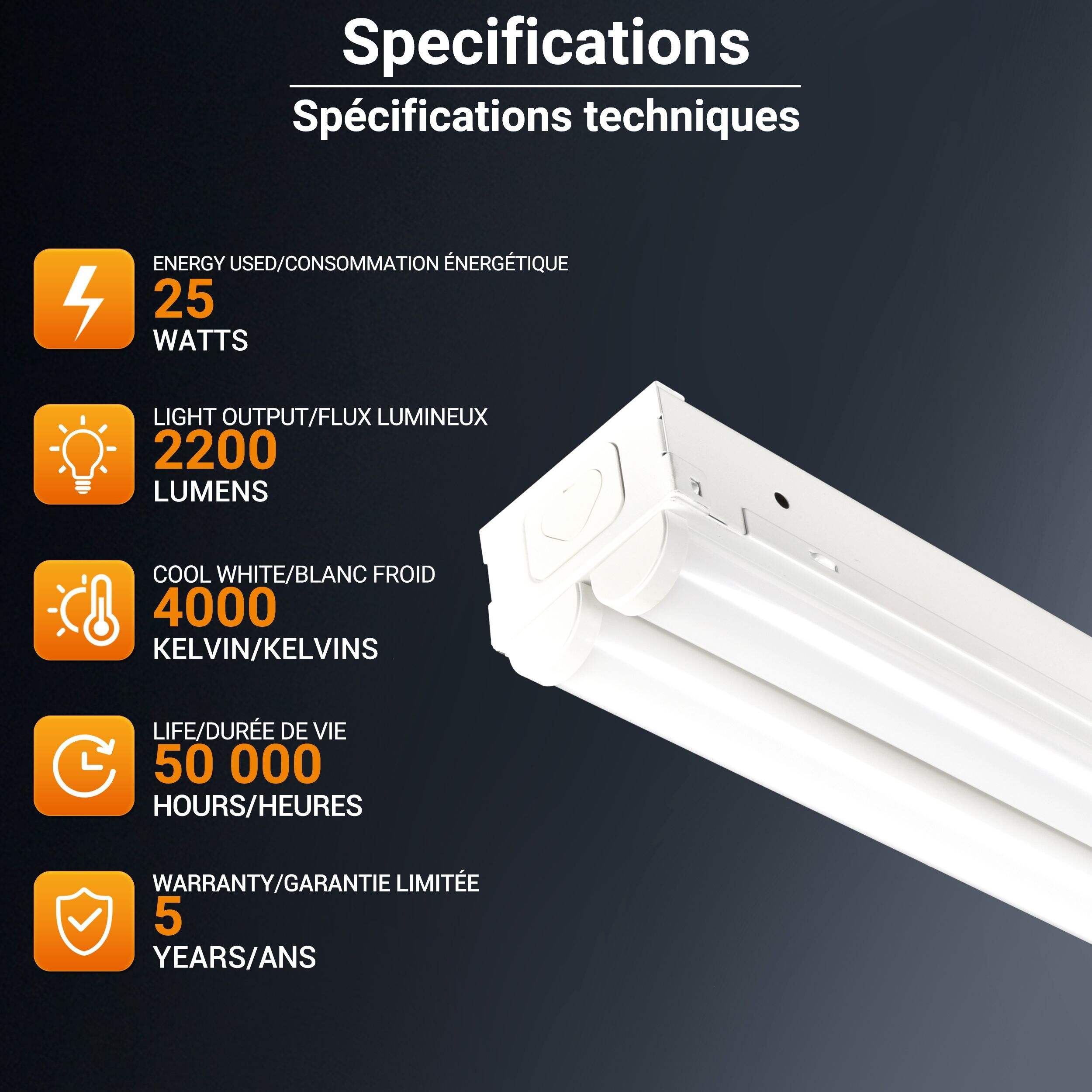 Light up your garage, basement, or workshop with the NOMA Dougle LED Strip Light. With its integrated LED light, you won’t have to replace the bulbs for over 45 years, using 38% less energy during that time. This strip light is linkable, so you can connect up to 15 of them end-to-end to create an even longer light. With a glossy white finish with polycarbonate lens, it will be an attractive feature in your space while providing the light you need in an efficient manner. Not only is this LED strip lighting better for your energy costs, it also has a lower temperature than traditional bulbs and stays cool. This makes it a much safer option for children, pets, and heat sensitive areas. You don’t need to purchase or install a bulb into this light, and all the mounting hardware and instructions are included to make the installation process as easy as possible. Enjoy the two feet of cool white light with 2,200 lumens of output, 25 watts of energy used, and over 50,000 hours of life.