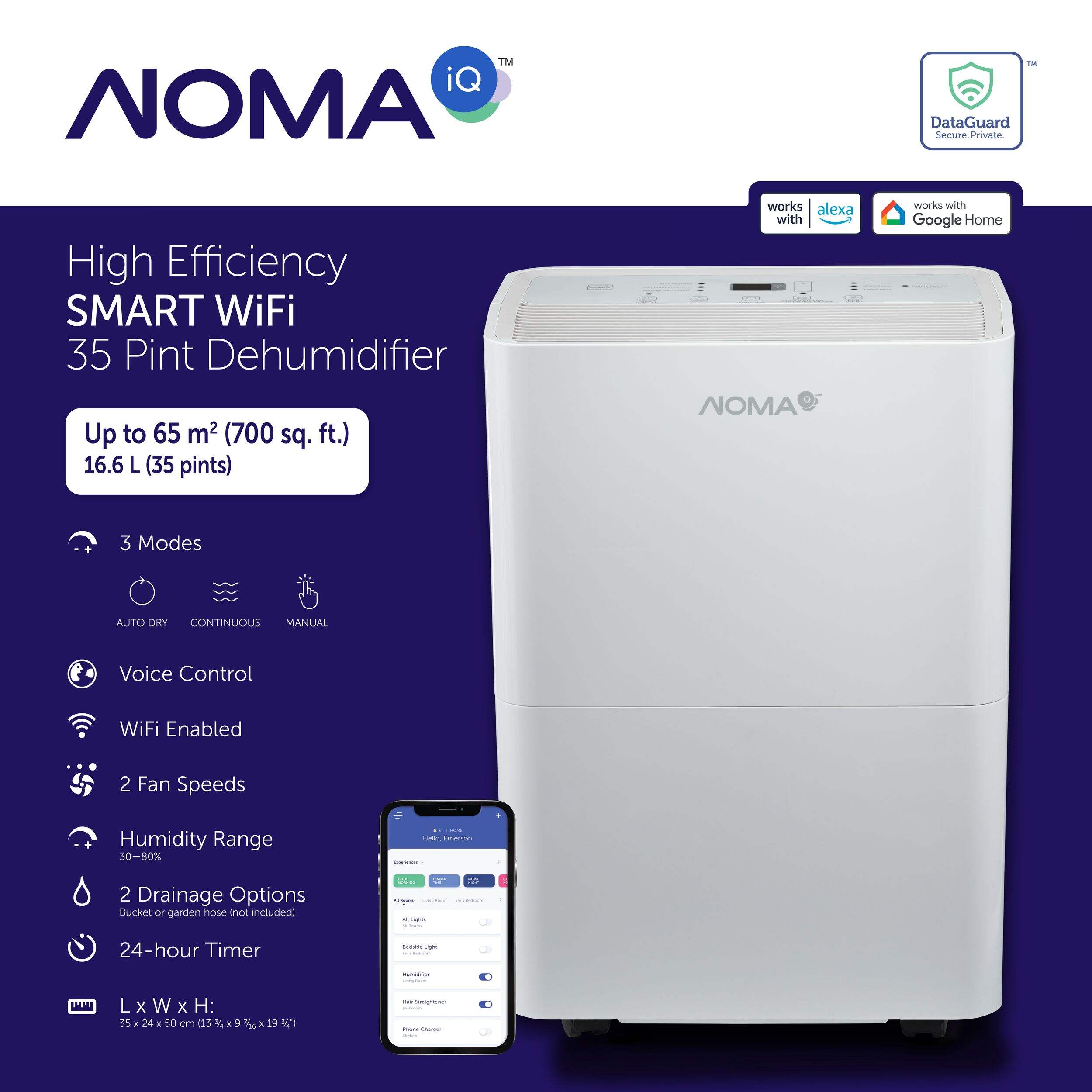 Breathe easy with the NOMA iQ 35 Pint Dehumidifier. This unit helps you remove moisture from the air, keeping the growth of mould and bacteria at bay. Enjoy customized options of high and low fan speeds right from your smartphone. The Smart feature allows you to control this dehumidifier anywhere, anytime.