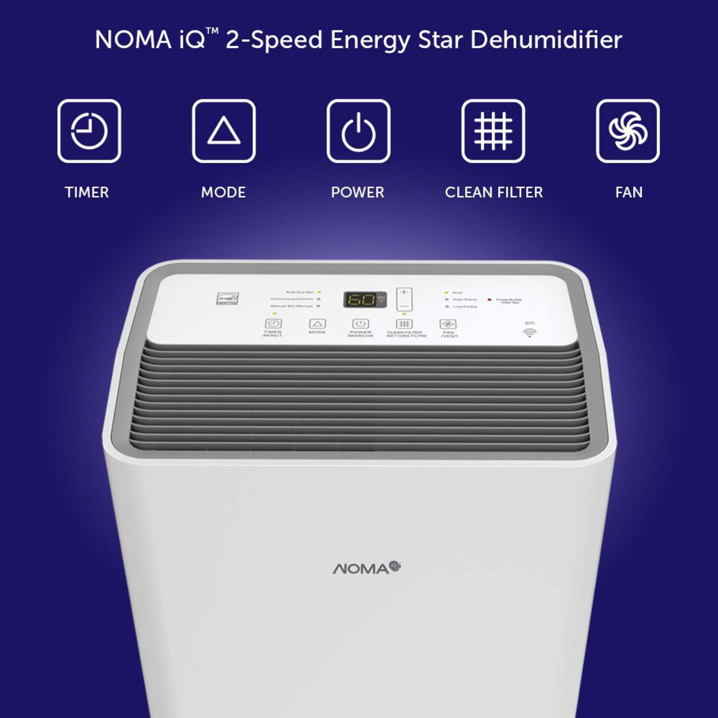 The NOMA iQ 50 Pint 2-Speed ENERGY STAR® Dehumidifier provides powerful moisture control to help ensure a more comfortable environment for you and your family. Featuring a large 50-pint capacity, two fan speeds, and adjustable humidity settings, it allows you to customize operation based on your needs. Designed for quiet and efficient operation, this dehumidifier is ideal for spaces up to 1500 sq. ft.