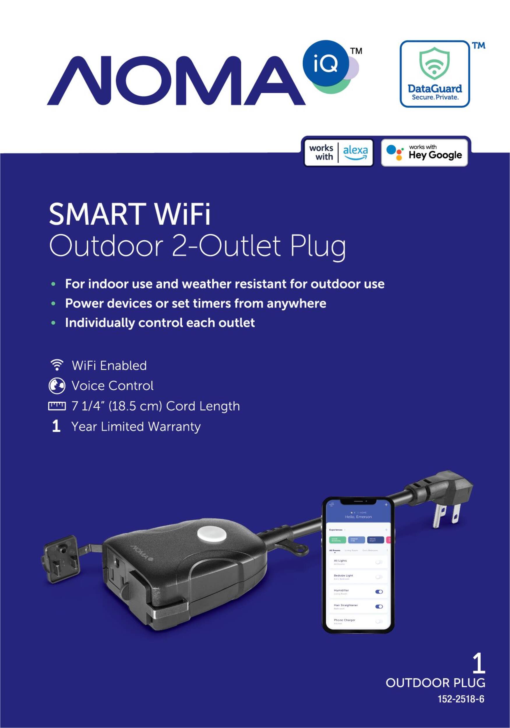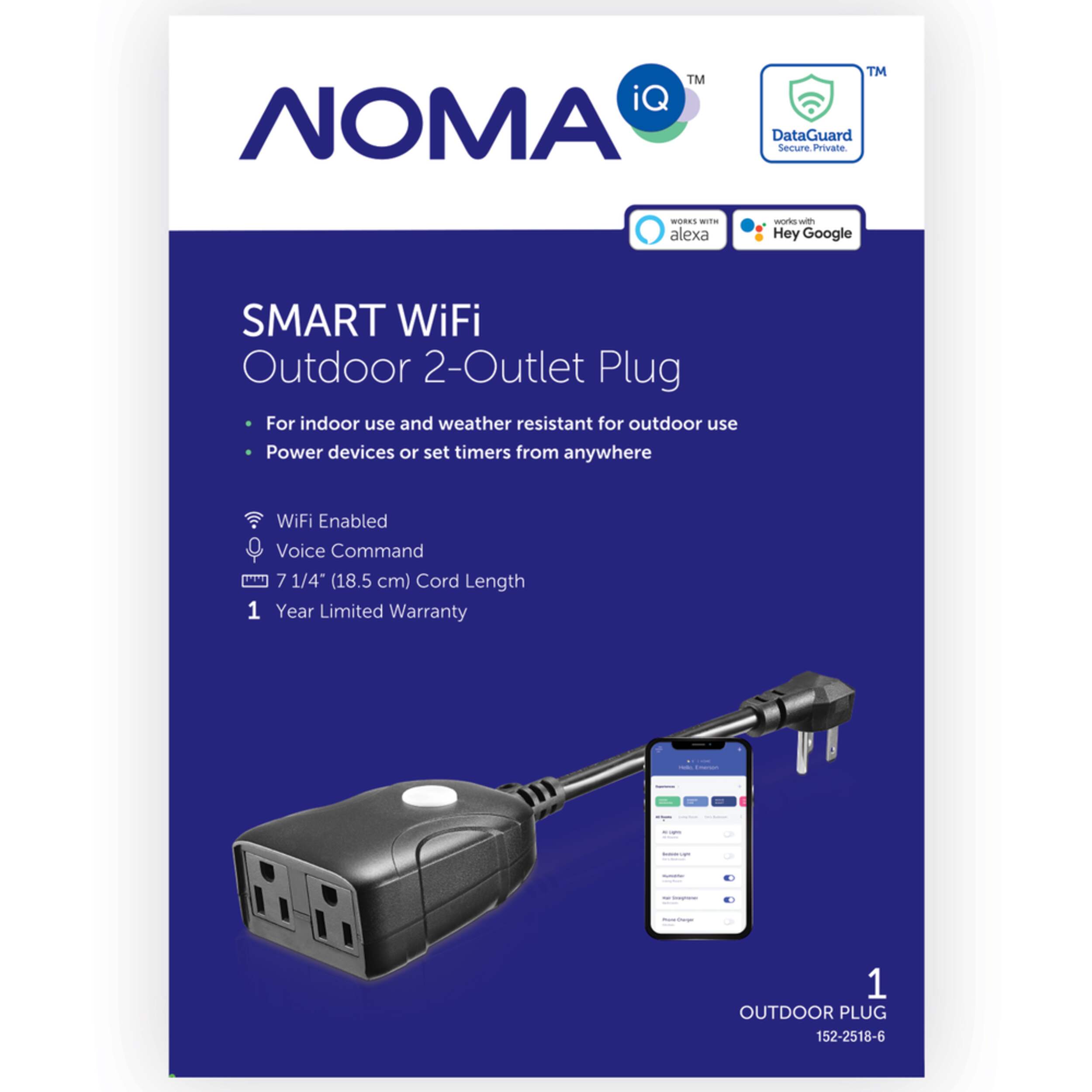 The NOMA iQ Outdoor 2-Outlet Smart Plug offers a seamless and convenient way to control your outdoor devices. Whether it's your holiday lights or other appliances, this smart plug integrates with Google Assistant, Siri, and Alexa for hands-free control. With no hub required, it operates through Wi-Fi, allowing you to create customized schedules for both weekday and weekend use, ensuring automation fits your lifestyle.