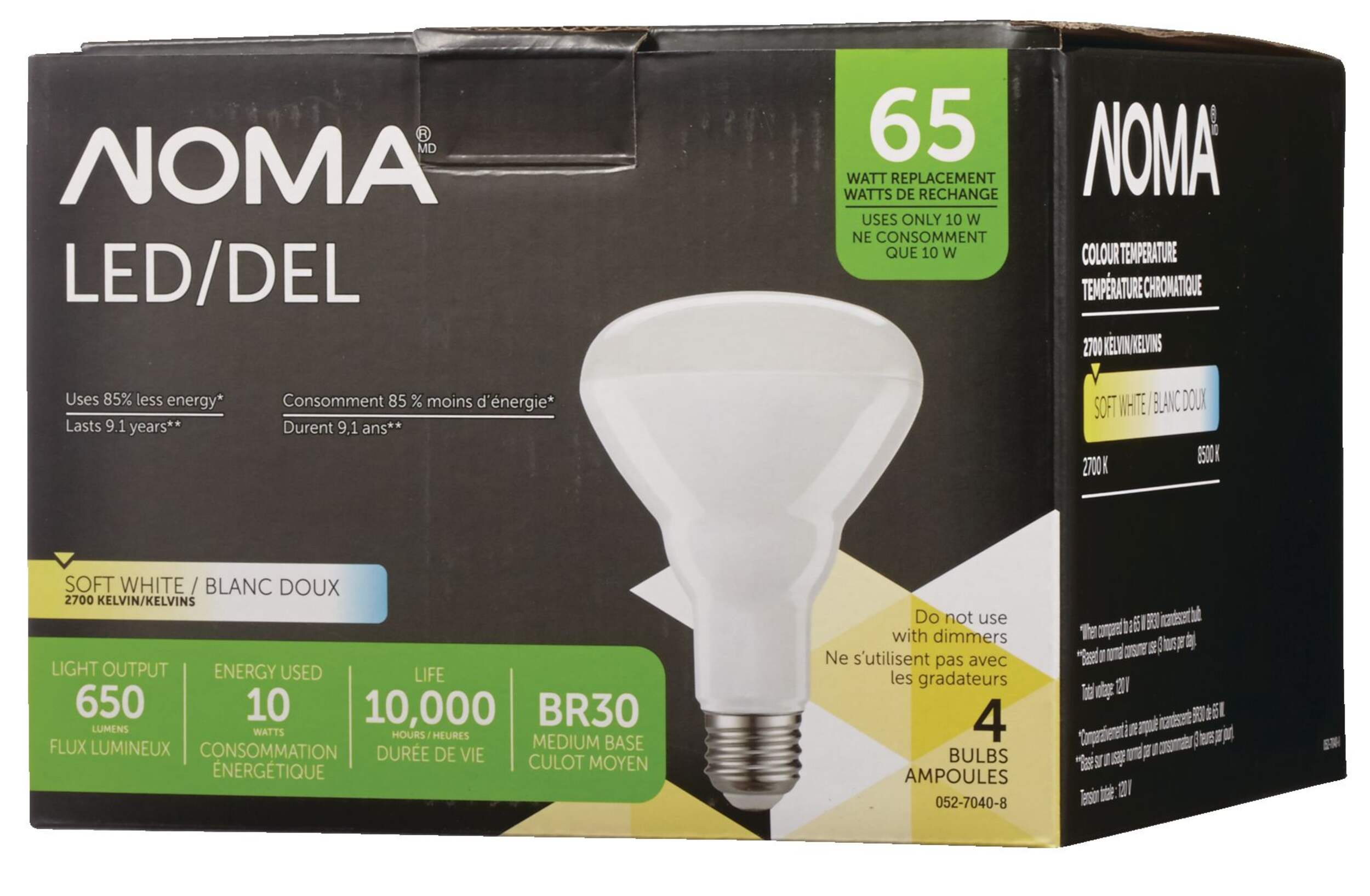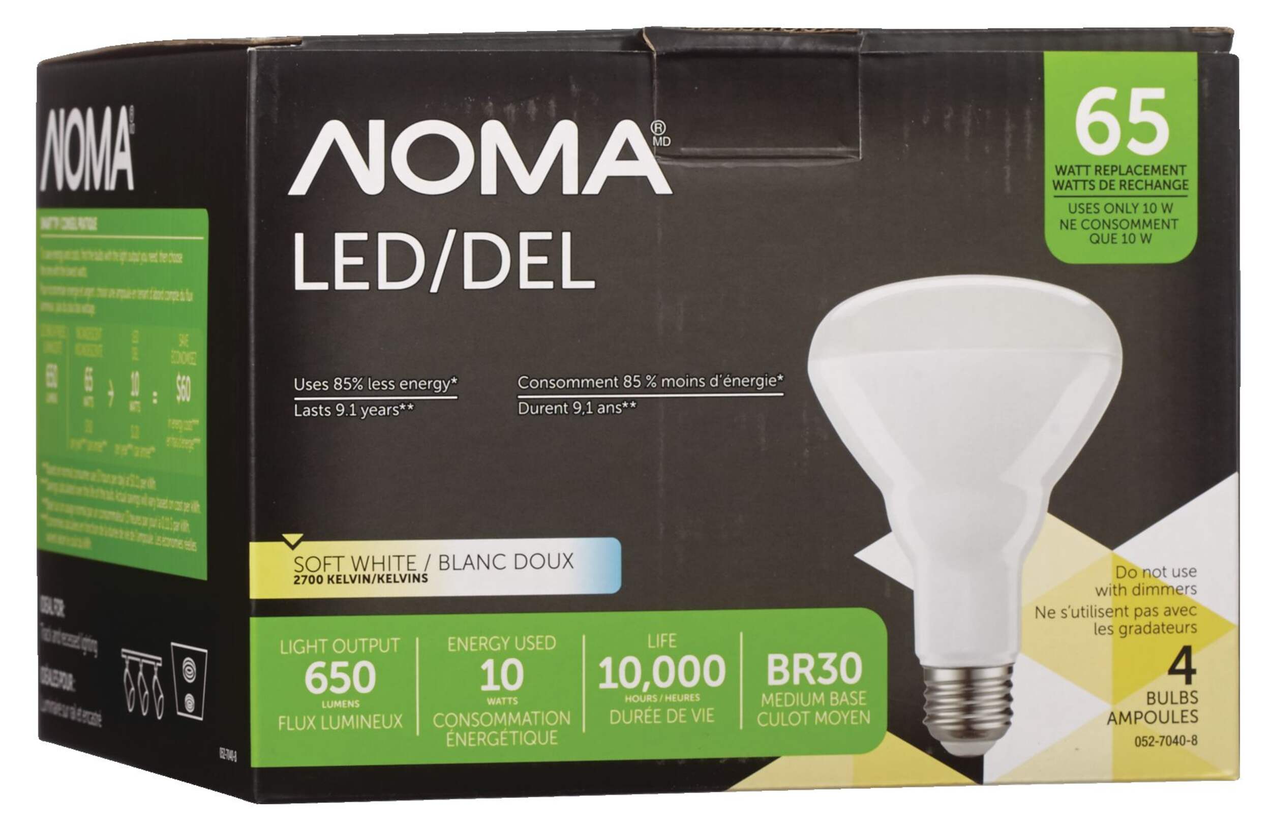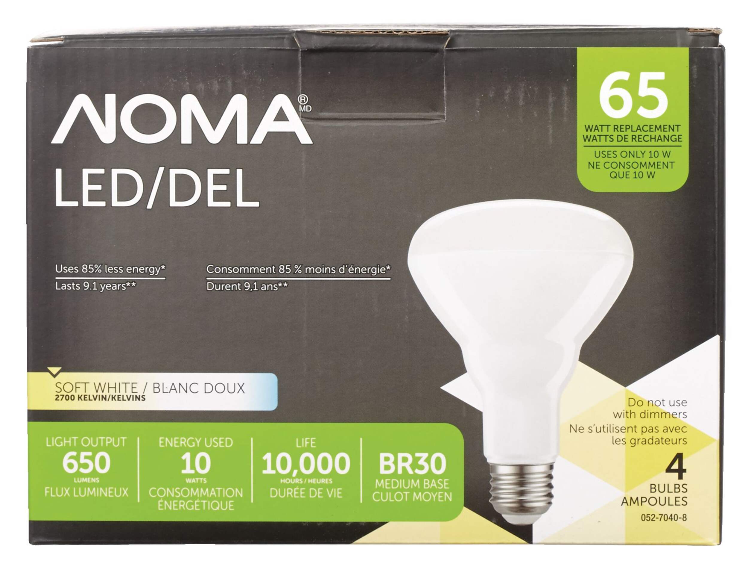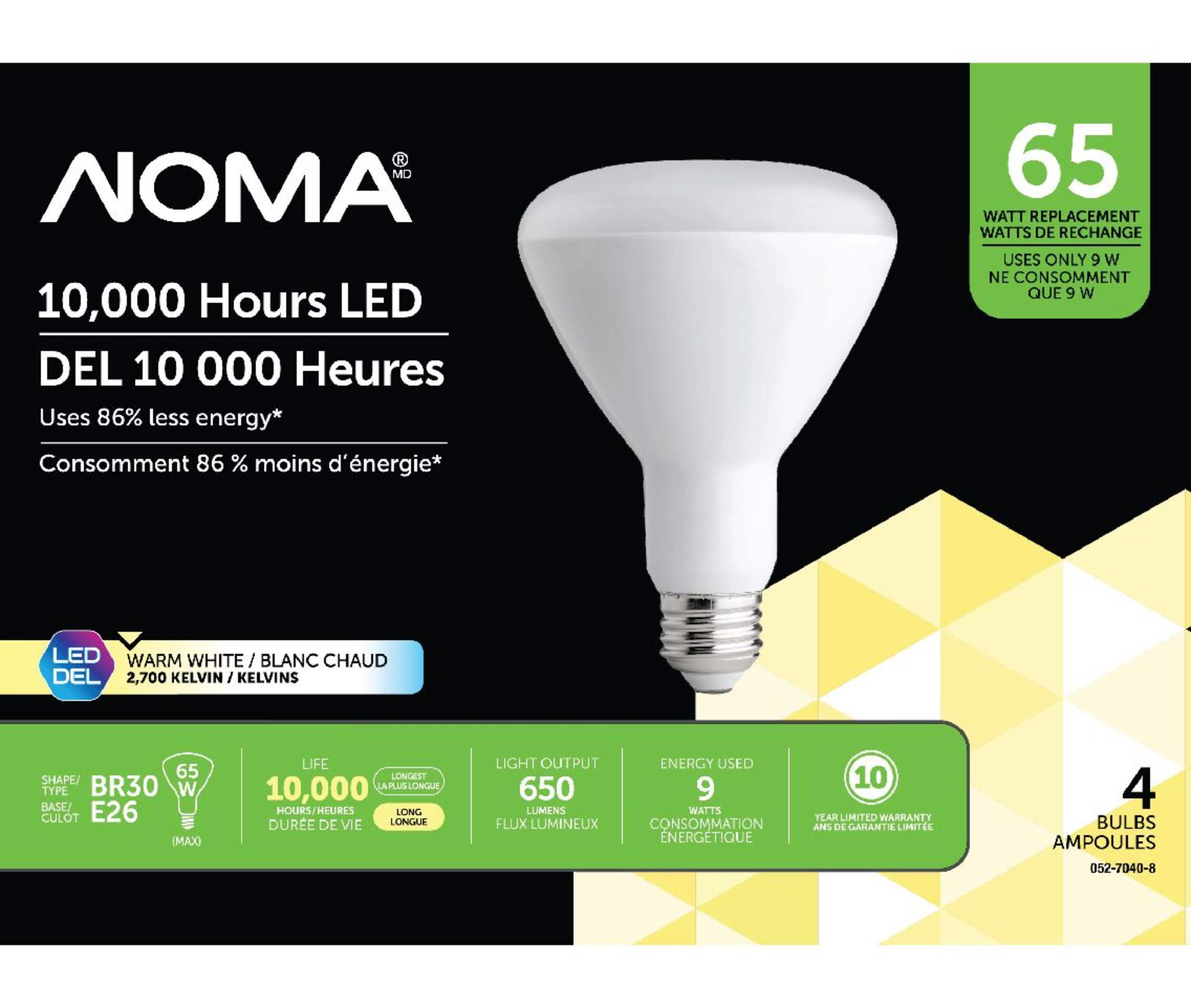 Using 85% less energy than standard alternatives, the NOMA BR30 65W LED Light Bulb provides 650 lumens of light and an extra-long life span of up to 10,000 hours while only using 10 watts of energy. The warm white light provides a natural glow suitable for general household use. This pack includes 4 LED light bulbs, each with a BR30 shape and E26 base, making them ideal for compatible track and recessed lighting fixtures.