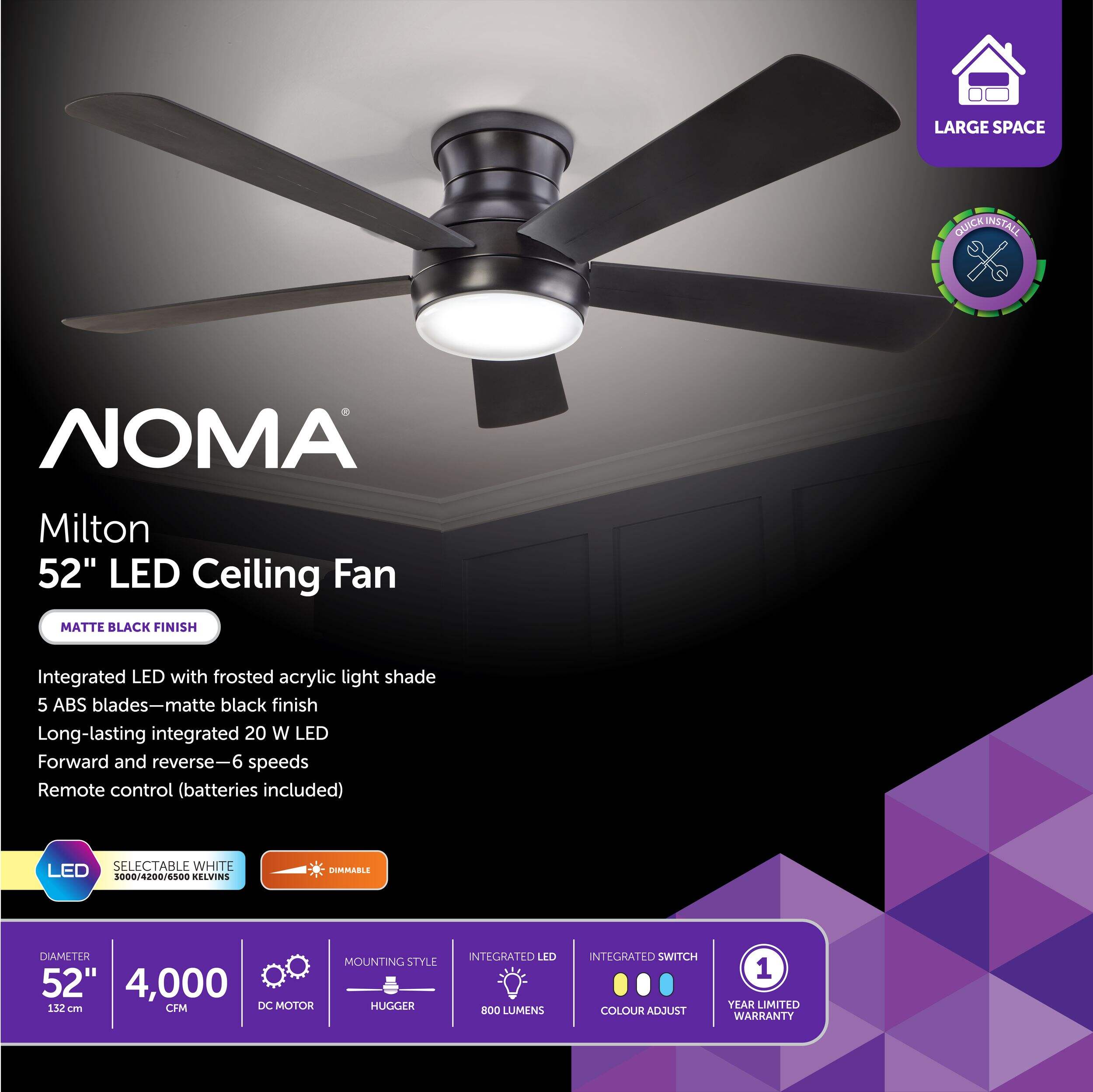 Add comfort to your home with the NOMA Milton 5-Reversible Blade, 6-Speed Ceiling Fan for a sleek and functional ceiling fan option. This remote controlled ceiling fan features a dimmable LED light for customized brightness. With a stylish, modern design, this LED light ceiling fan fits effortlessly in a variety of decors, and it comes with all the necessary hardware ensuring a hassle-free installation.