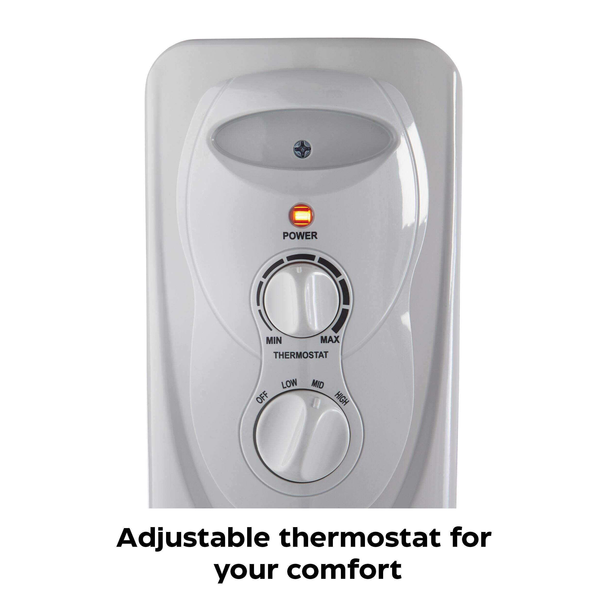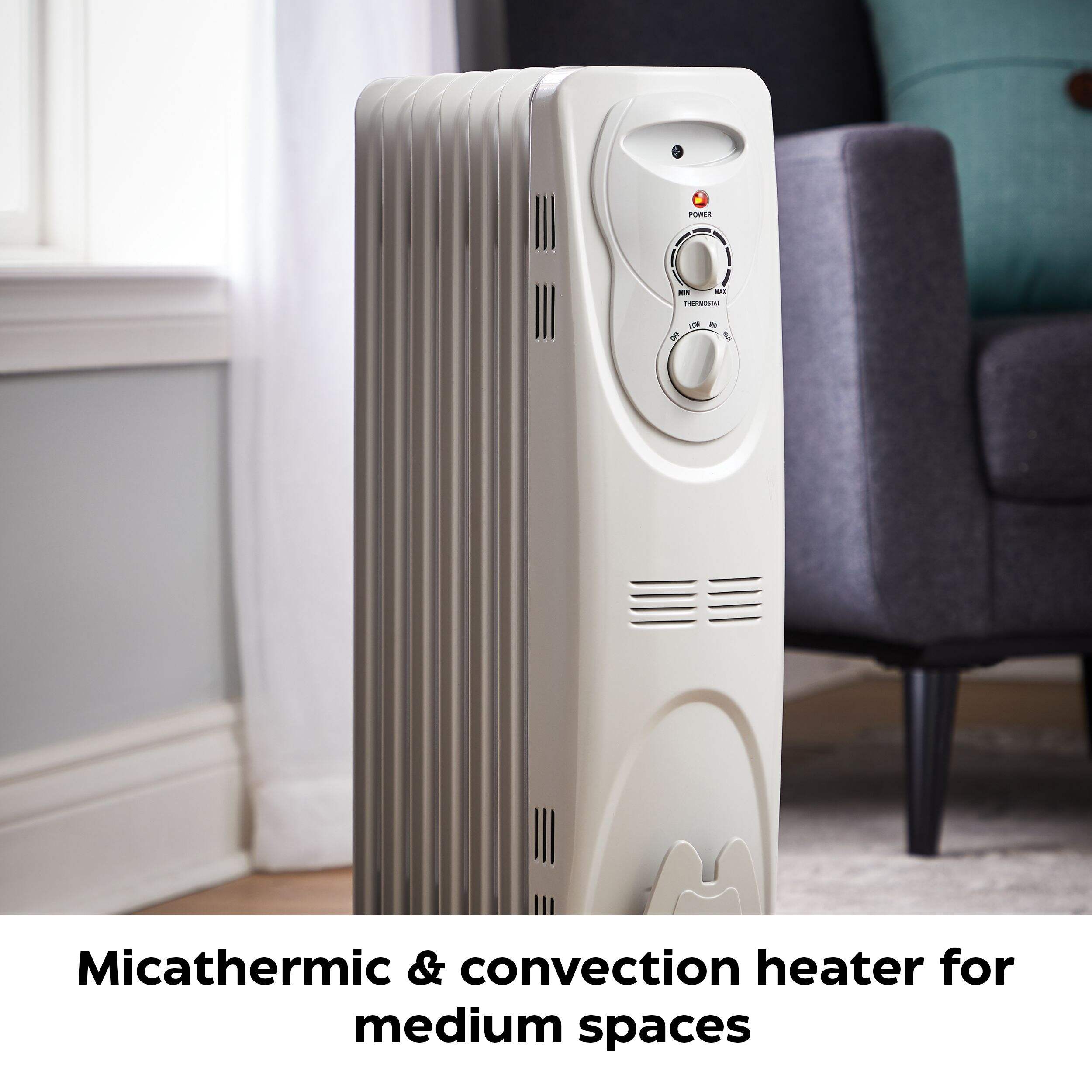 Featuring a micathermic and convection heating design, the NOMA Oil Filled Portable Radiator Heater allows air to naturally pass over a large heating element, which circulates steady, long-term heat throughout the room. Not only is this exceptionally energy-efficient, but this ultra-quiet process delivers gradual, consistent heat to your space. With three heat settings – 600W, 900W, and 1500W – this radiator heater delivers ample heat where you need it most. The adjustable thermostat and remote control make it easy to select and maintain your desired heat, so your space is warm and cozy in minutes and stays that way for hours. With a portable design featuring wheels and a carrying handle, you can easily move this oil radiator from room to room as necessary, so you can bring it from your home office during the day to your living room or basement in the evenings. Built with safety in mind, this radiator heater features tip-over and overheat protection, which is ideal for homes with pets and children. With the 10-hour auto on/off timer, you can easily program this heater to suit your needs without worrying about leaving it on for too long.