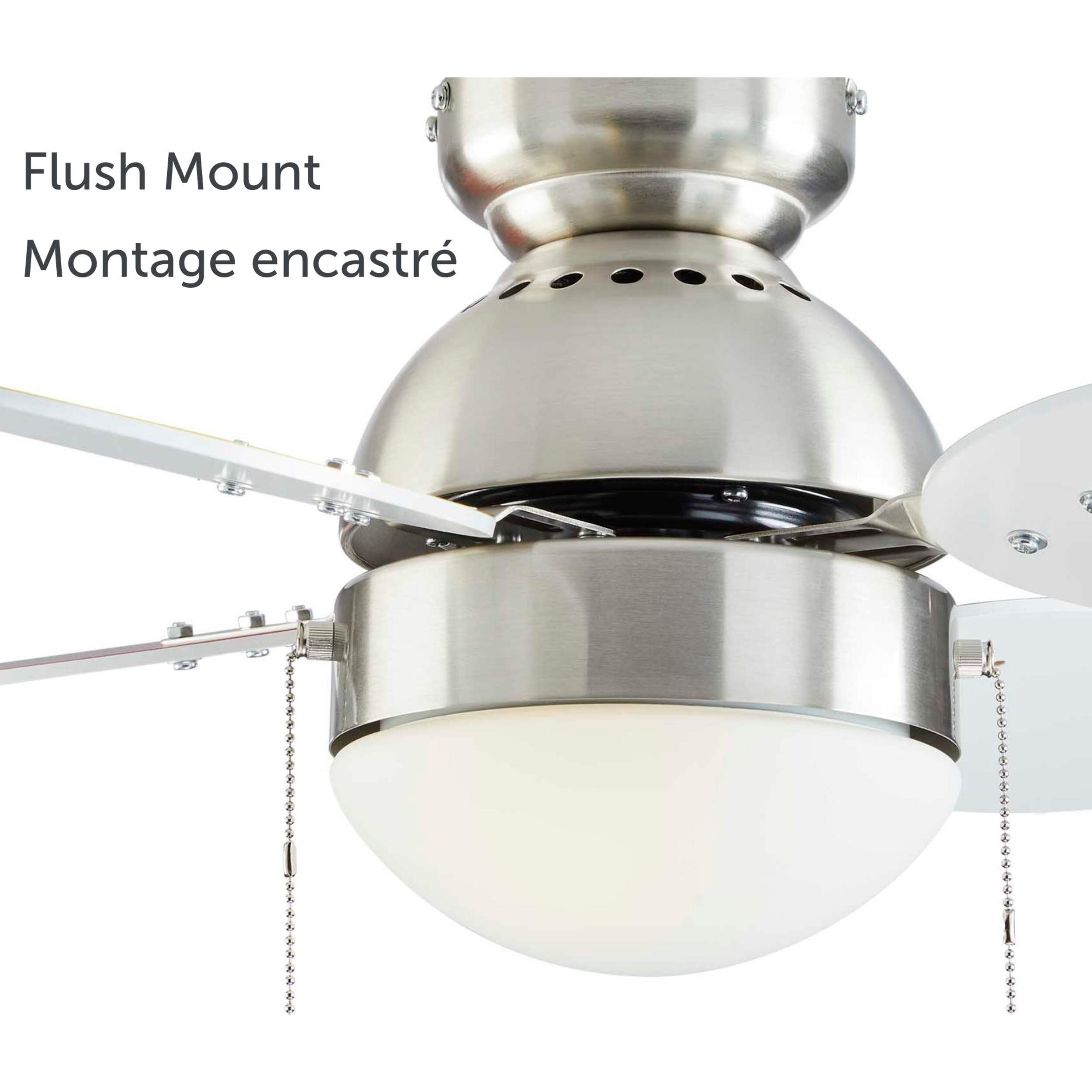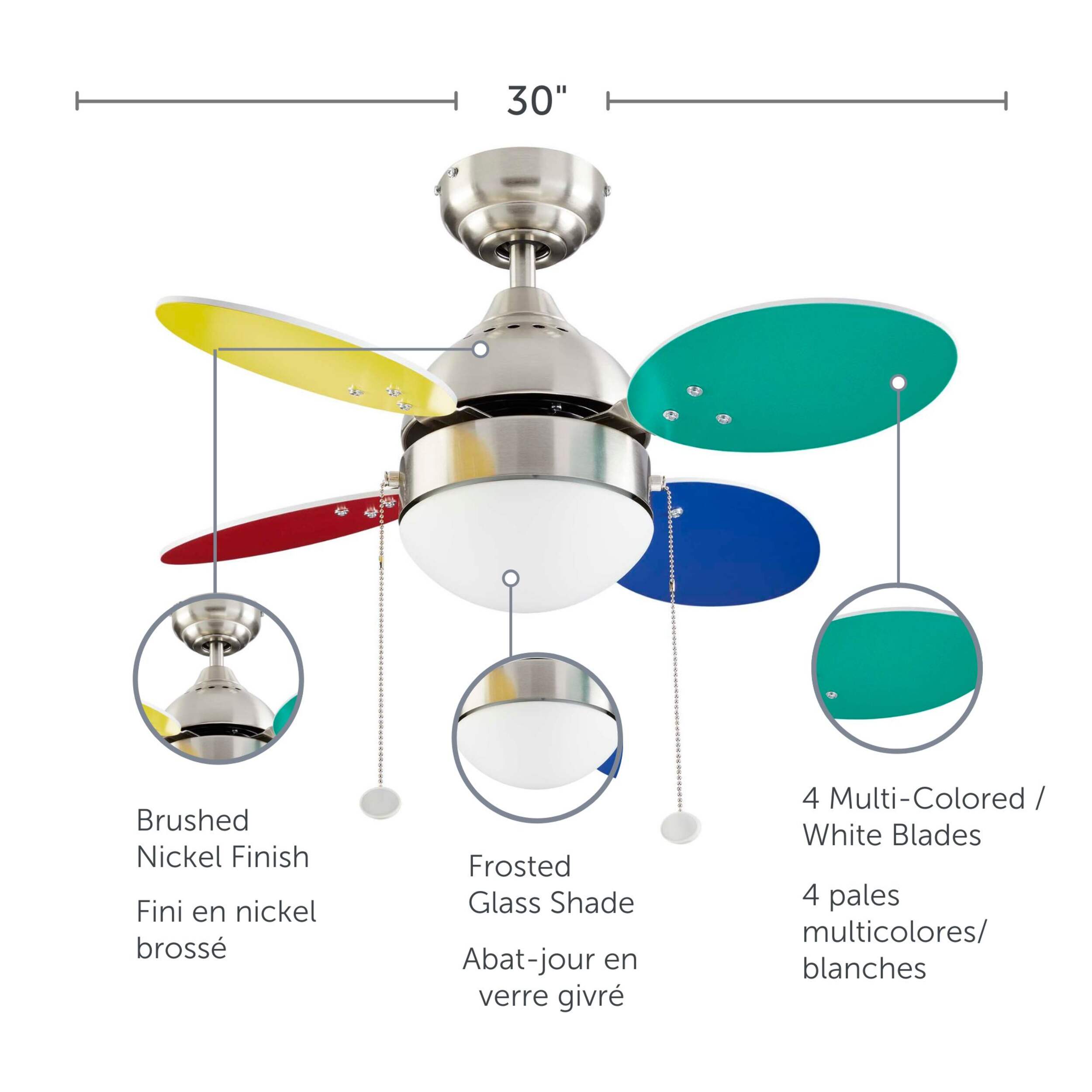 Add colourful and functional fun to your child’s bedroom with the NOMA Ollie Ceiling Fan. With a frosted glass shade, brushed nickel finish, and four coloured blades, it’ll keep air moving while adding an eye-catching feature to any room. The four blades on this ceiling fan with light are reversible which opens up many different possibilities regardless of the time of year. In the summertime, point air downward to help circulate cool air. During colder months, you can direct air up to help bring in additional warmth to the room. The pull chains on this ceiling fan for bedrooms easily change the settings depending on the function and intensity you need at any given time. Mounting hardware and instructions are included, but only mount this NOMA ceiling fan to an outlet marked acceptable for fan support. Most outlets commonly used for a light fixture are not acceptable for fan support and may need to be replaced. If in doubt, consult a qualified electrician.