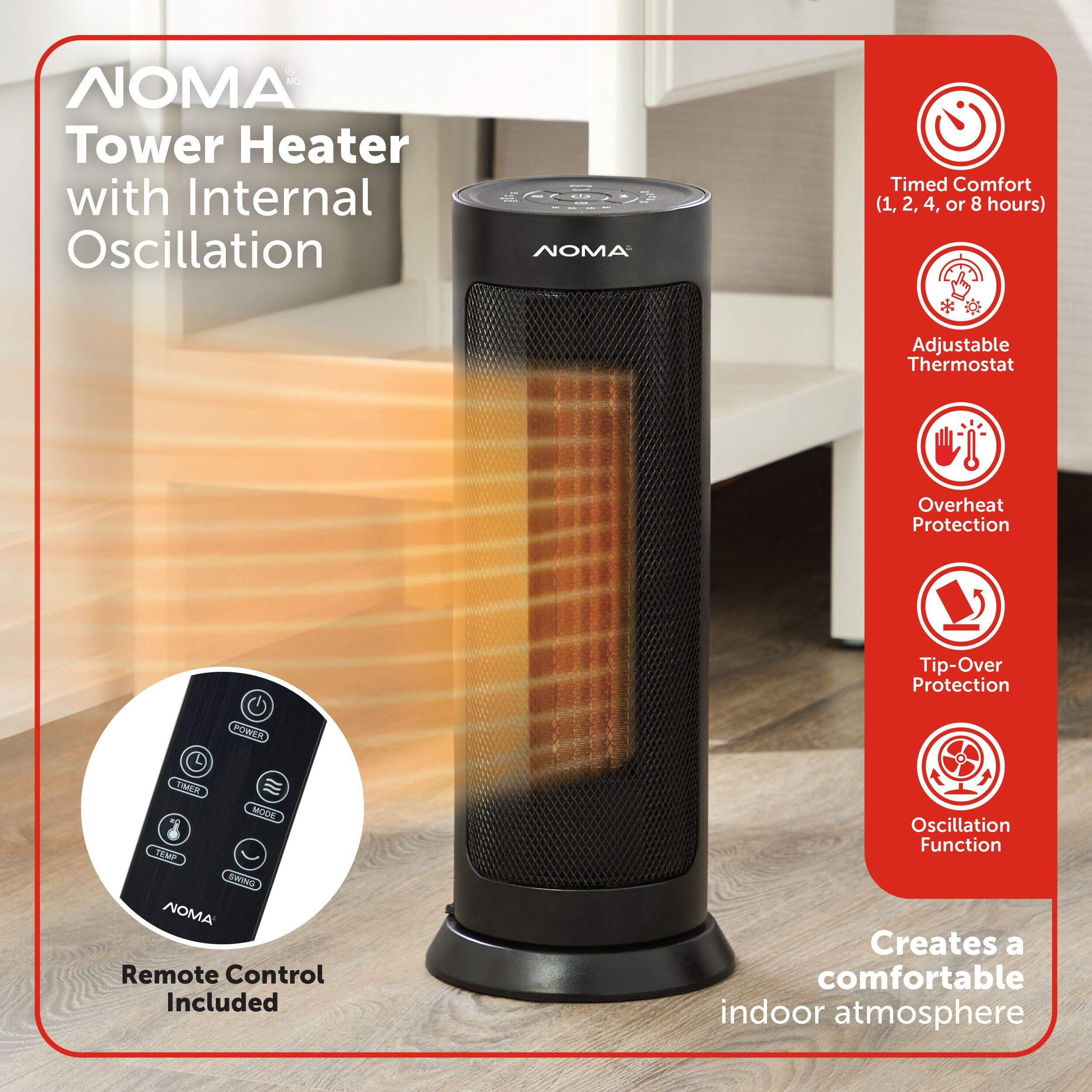 Enhance your indoor comfort with the NOMA Oscillating Digital Tower Ceramic Space Heater. This sleek, black 18-inch heater is designed to efficiently warm your space while offering user-friendly features like a remote control and adjustable thermostat. Its modern design and oscillation function ensure even heat distribution, making it a perfect addition to any room.