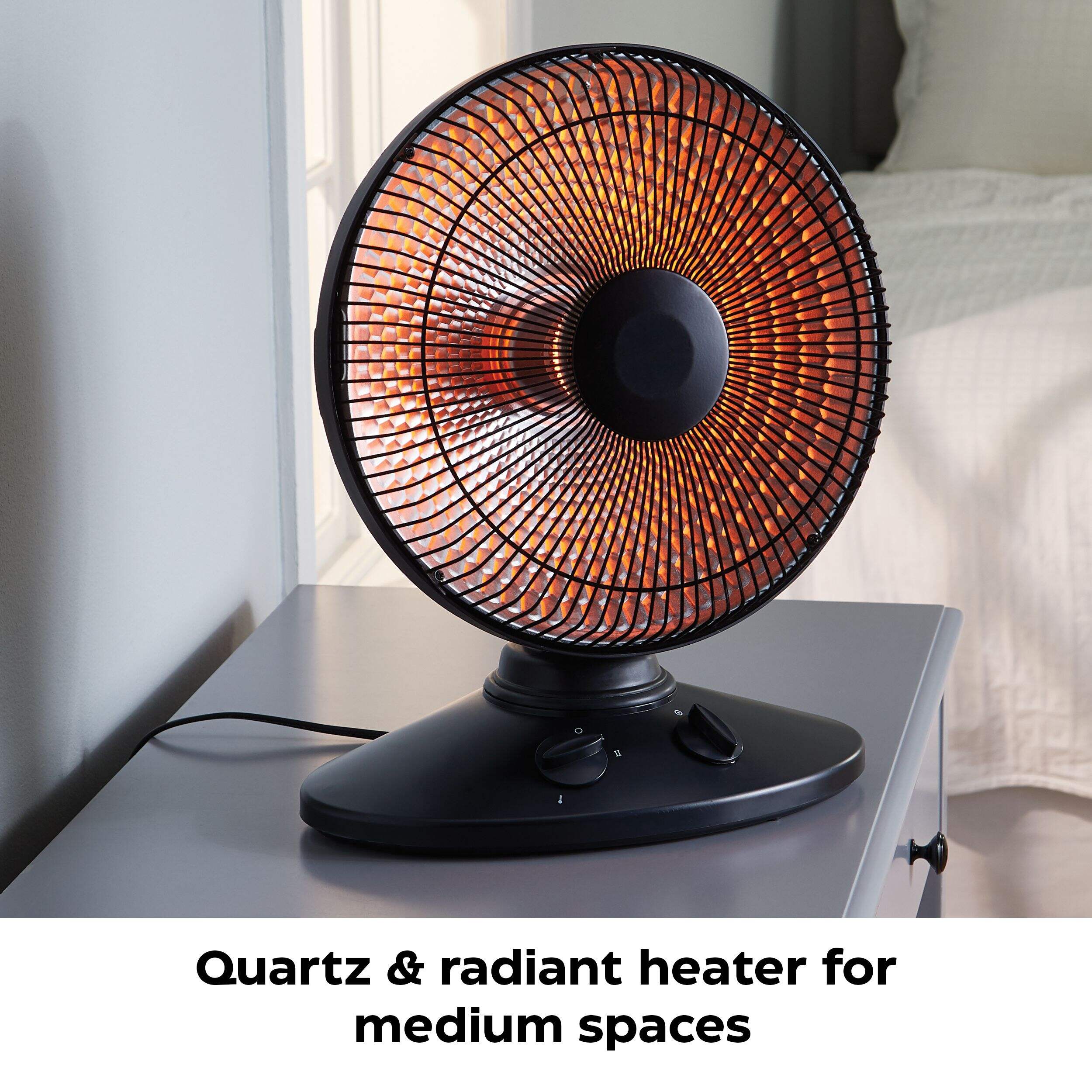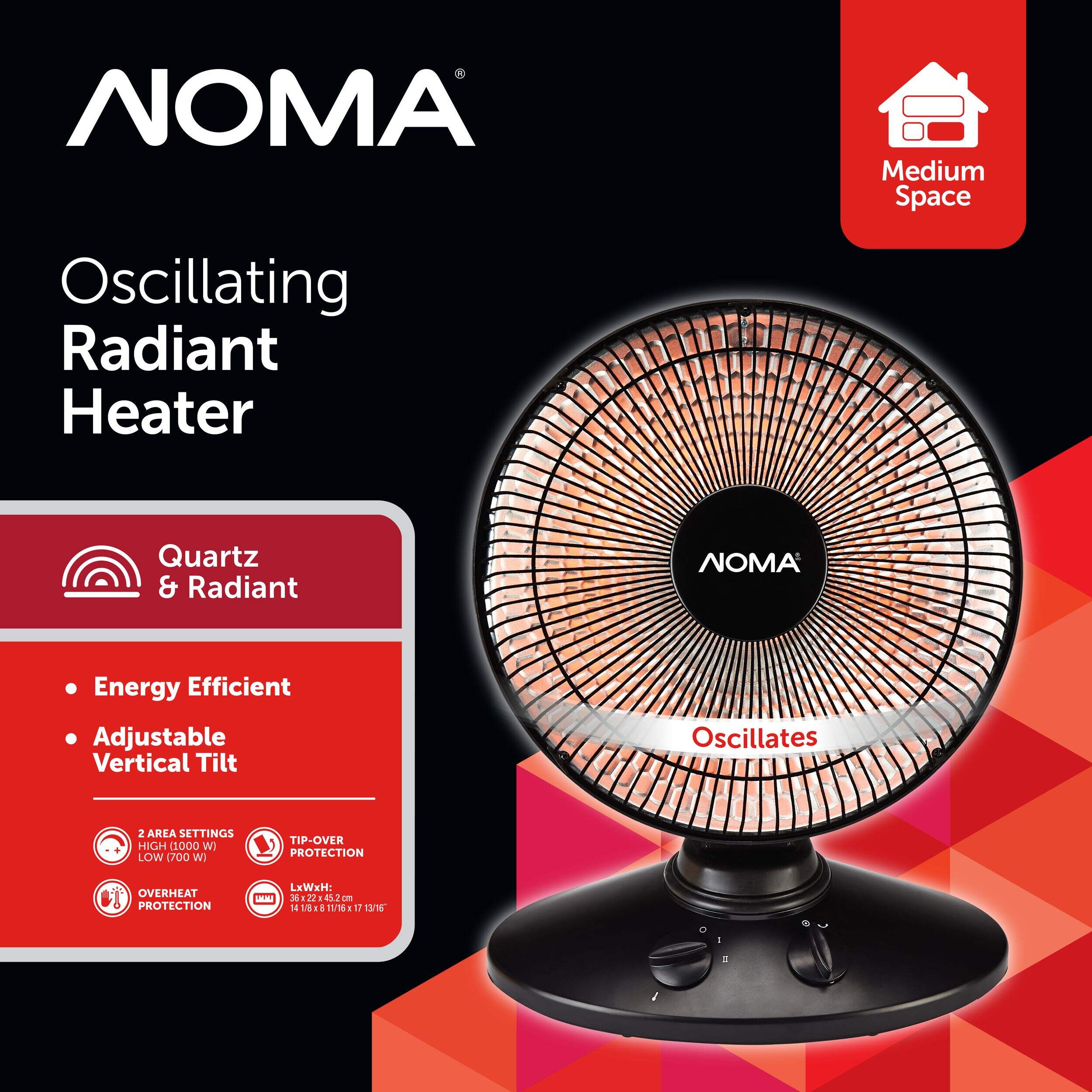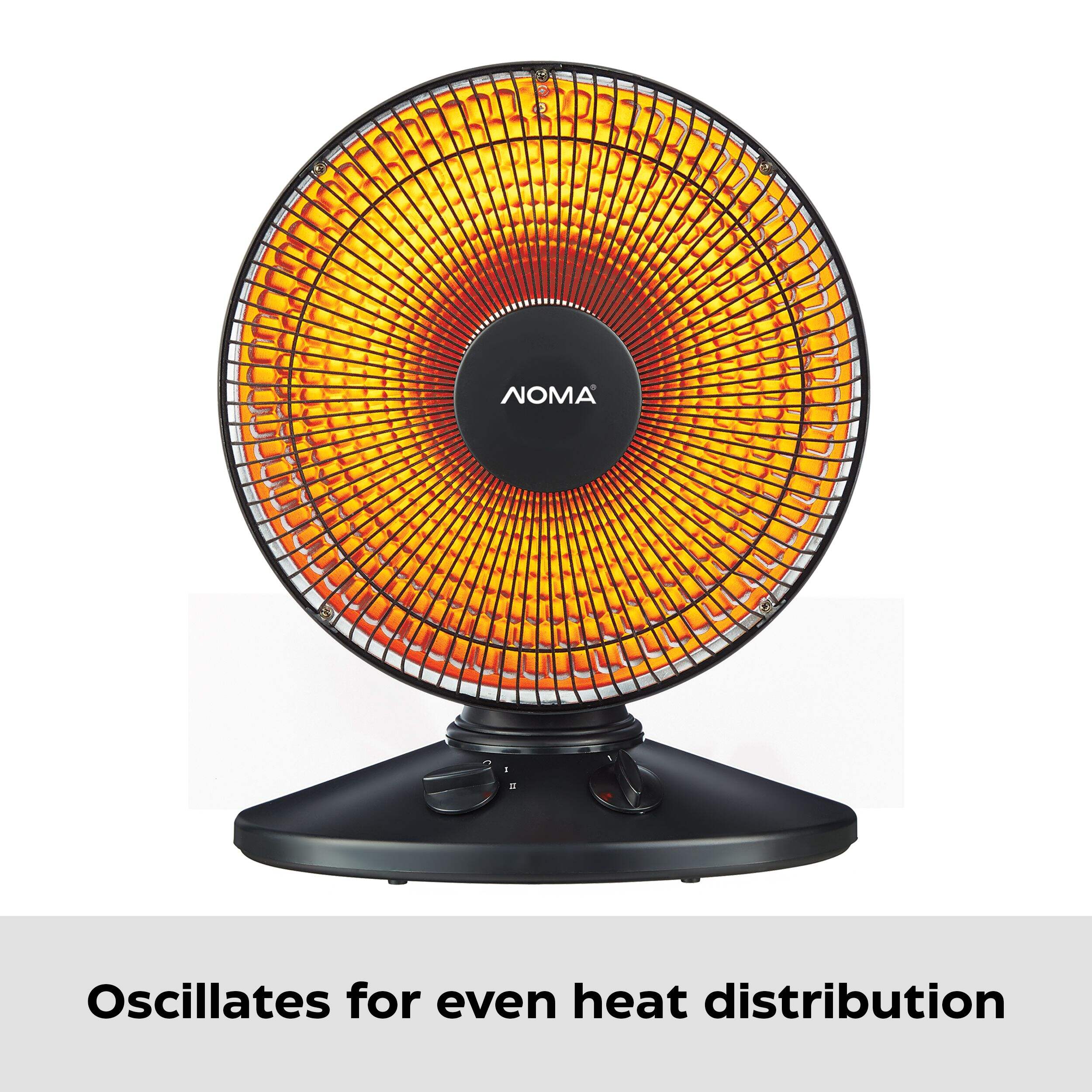 Ideal for medium-sized rooms up to 250 square feet, this NOMA Portable Oscillating Radiant Electric Space Heater provides radiant heat, ensuring the closer you are to the space heater, the warmer you feel. The oscillating design rotates 70 degrees, providing even heat distribution to keep you warm and cozy, while the adjustable, two-area heat settings (high and low) provide 1000 watts and 700 watts of heat respectively. Loaded with safety features including a stay-cool safety grill, overheat protection, tip-over protection, and flame-retardant plastic cabinet, this electric space heater can be used around children and pets without worrying about damage. Boasting targeted, sun-like heat thanks to the quartz design, this room heater delivers immediate personal warmth, so be sure to position it close to you when working in your workshop, garage, or chilly home office. You can also adjust the vertical tilt to direct the heat upwards or downwards, giving you a bit of extra flexibility in room placement for optimal heating in any space. Simply turn the adjustable heat knob to turn on this space heater and make your room feel more cozy and comfortable.