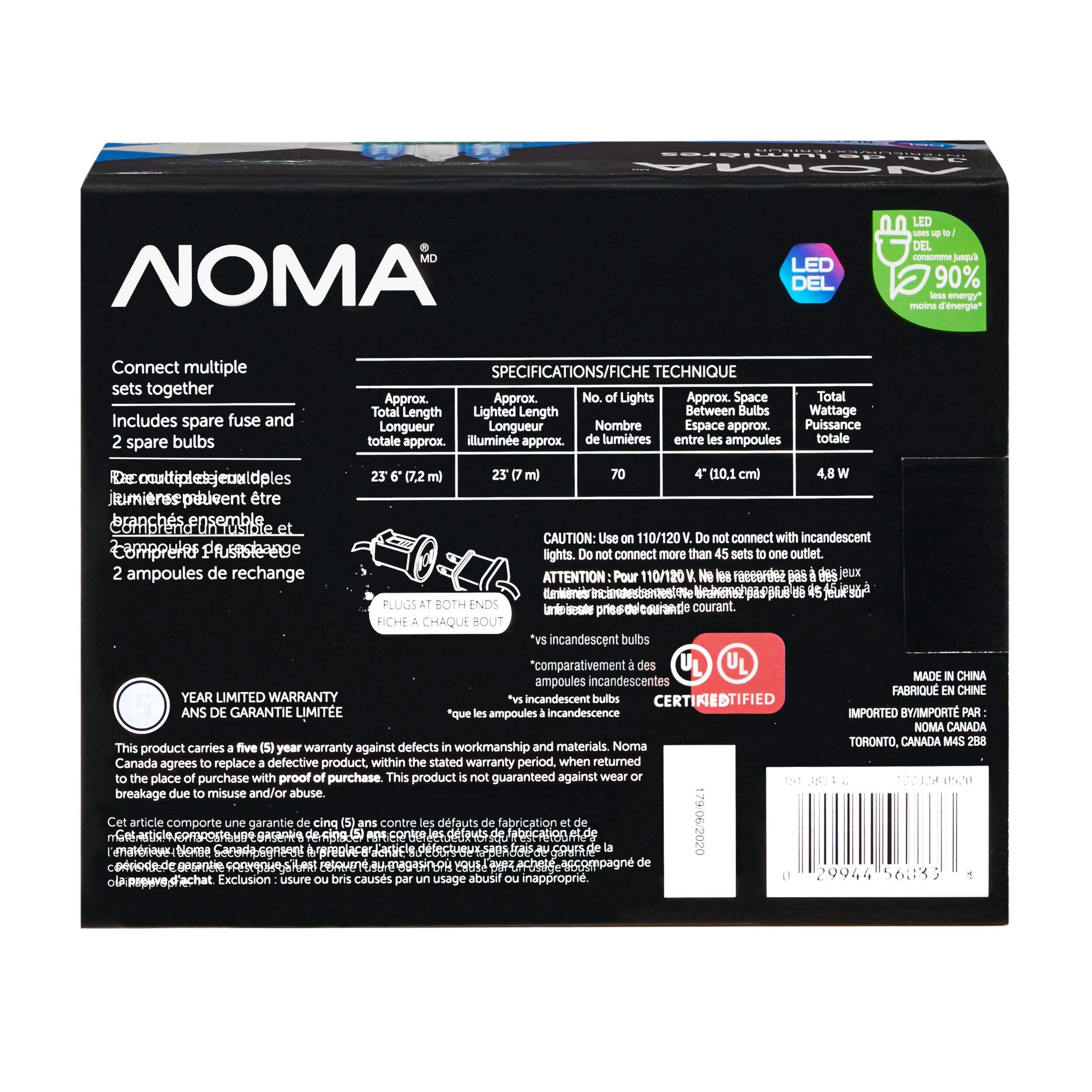 Create a one-of-a-kind Christmas display with the blue/pure white NOMA Outdoor 70 Mini LED Lights. They feature cool-to-the-touch LED bulbs, which are more energy efficient than incandescent lights. These LED bulbs also last much longer, so you won't be swapping out dead bulbs at the end of the season. There's a plug at each end of the outdoor Christmas string lights, allowing you to connect multiple strands together as needed for a vibrant holiday display.