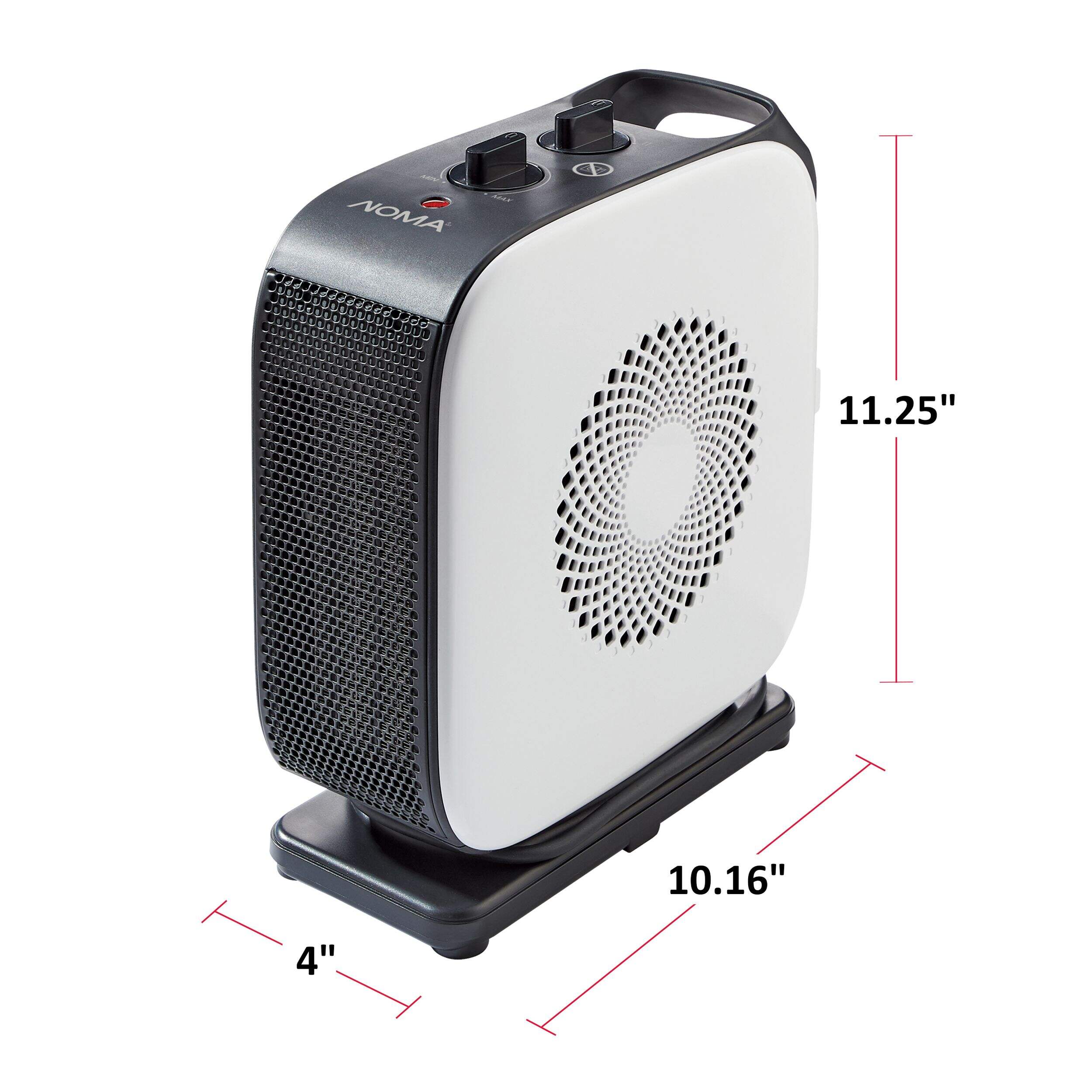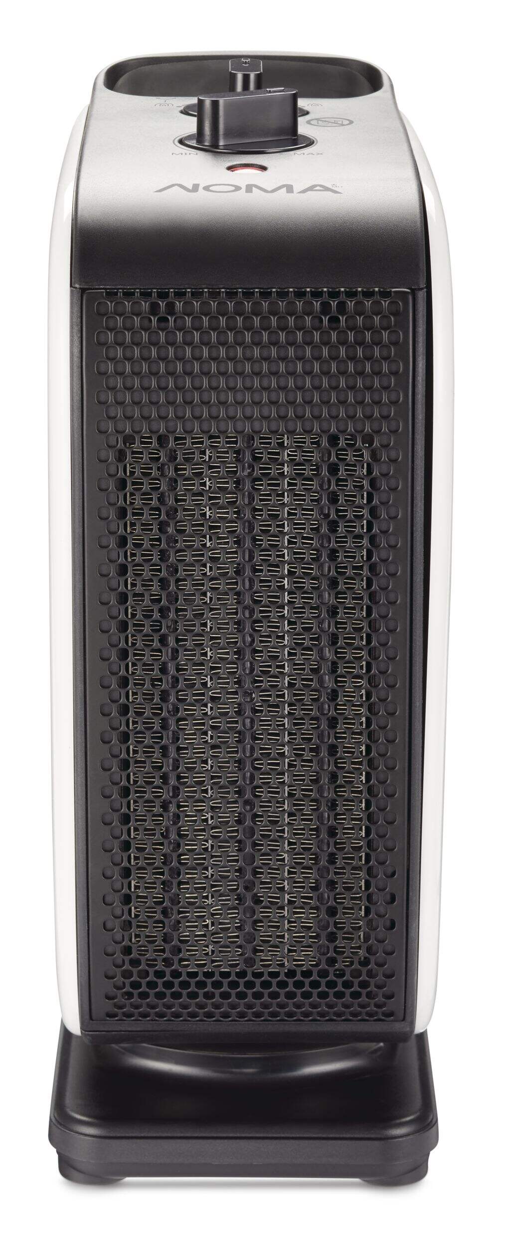 The NOMA Portable Oscillating Ceramic Space Heater is small enough to take with you anywhere you need a little extra warmth. It features two heat settings and one normal wind speed, and the carrying handle on this compact space heater allows for convenient portability between rooms. An innovative, multi-stage pressurized centrifugal air duct keeps the volume down and avoids sharp wind supply for added safety. The oscillating design helps evenly distribute heat throughout your room for total warmth.