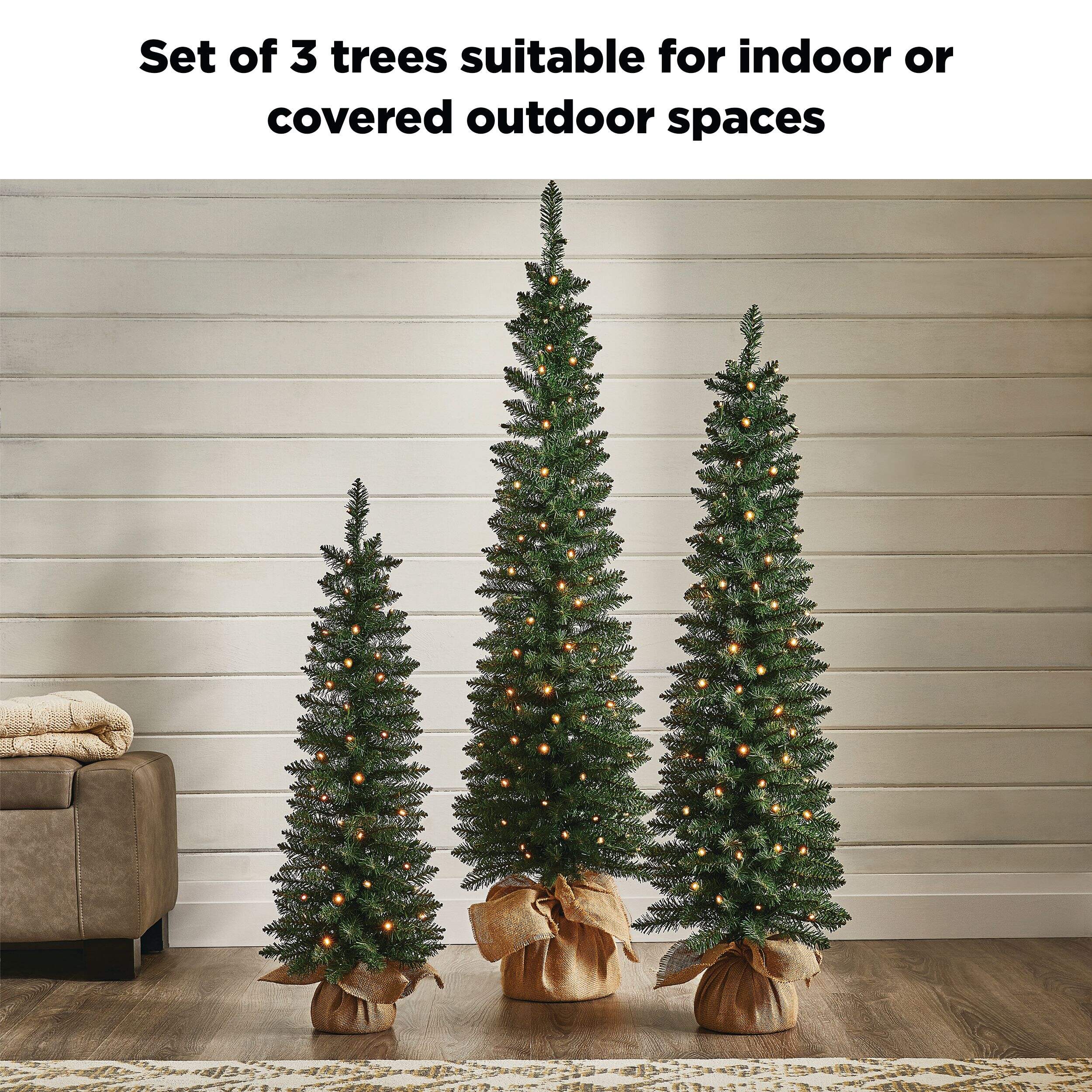Create a festive setting on your back patio, front porch, or any indoor space that needs a little extra holiday cheer with the NOMA Carlisle 3-Pack Potted Trees. This pack includes three charming artificial Christmas trees of three, four and five feet, each with authentic burlap wrapped around the base. These faux Christmas trees feature built-in, energy-efficient white LED lights, realistic PVC branches, and look great on their own or as a team.
