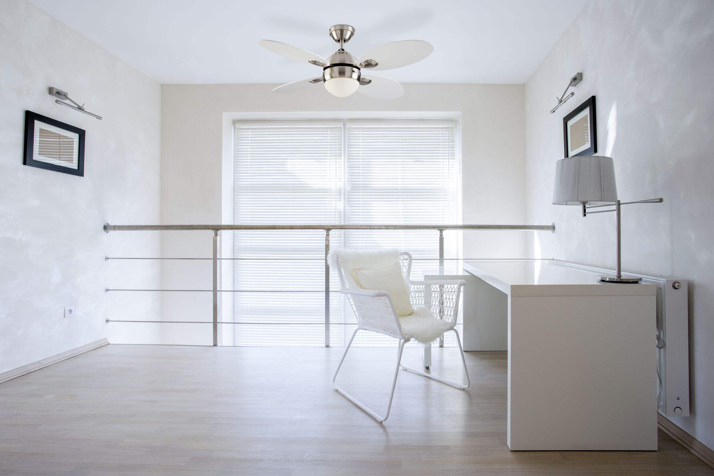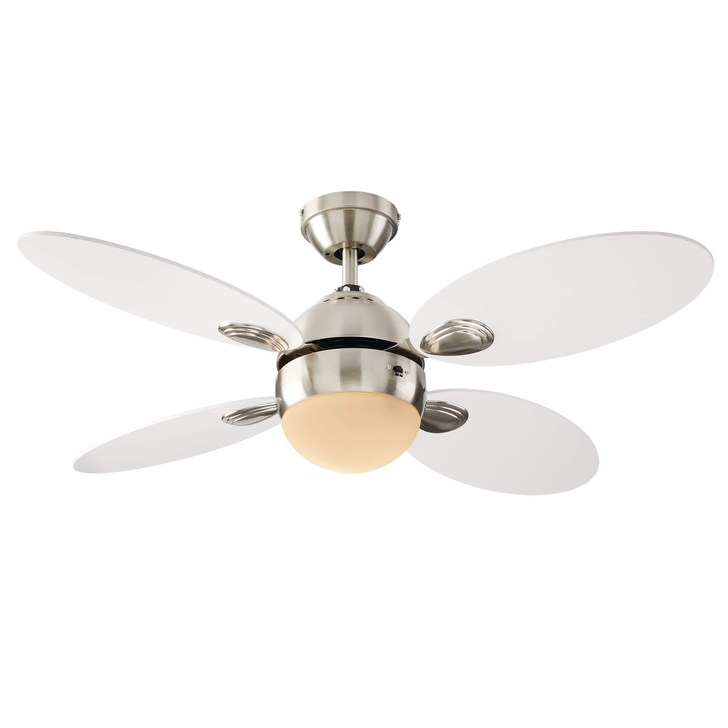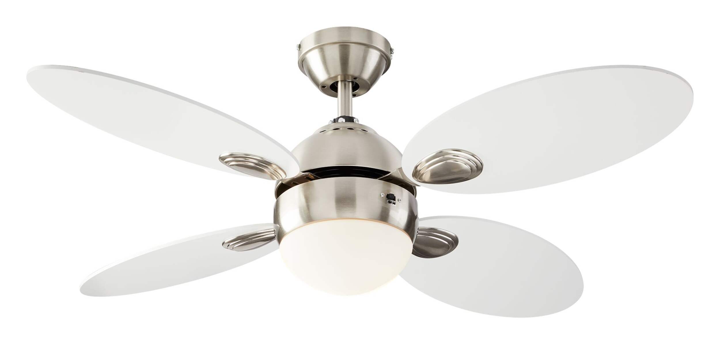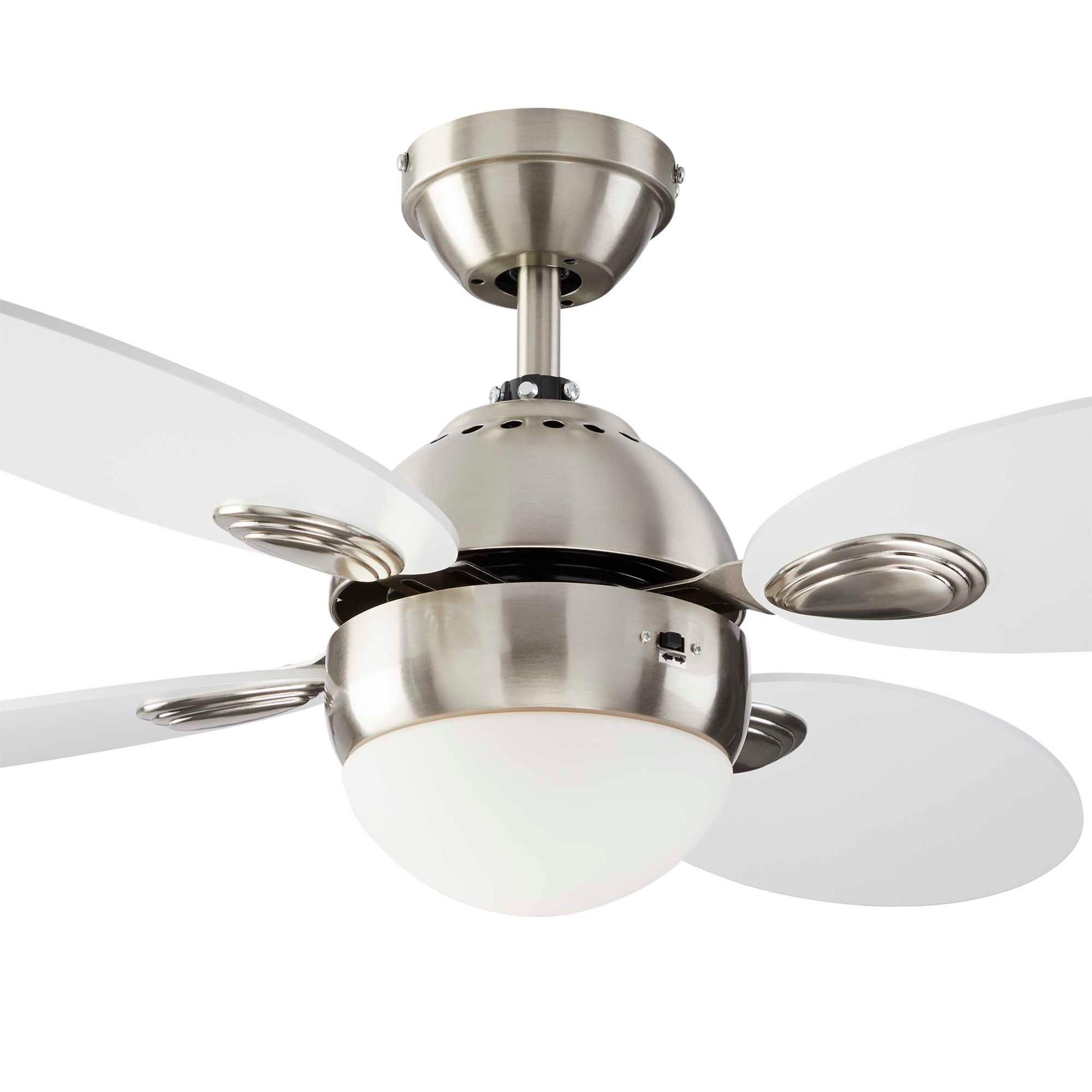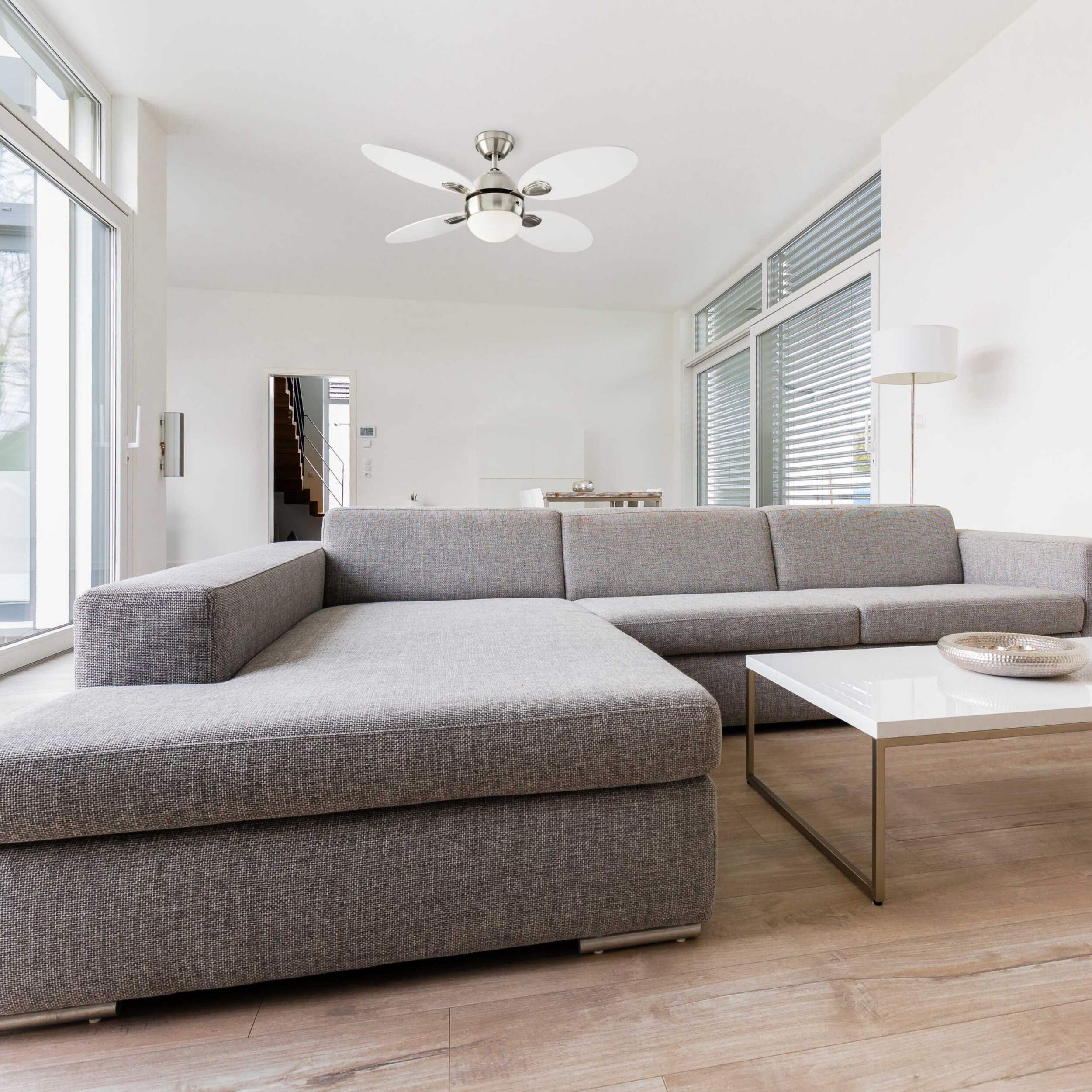 The NOMA Scandinavian White Ceiling Fan features a brushed nickel finish and four white blades to complement any home décor
