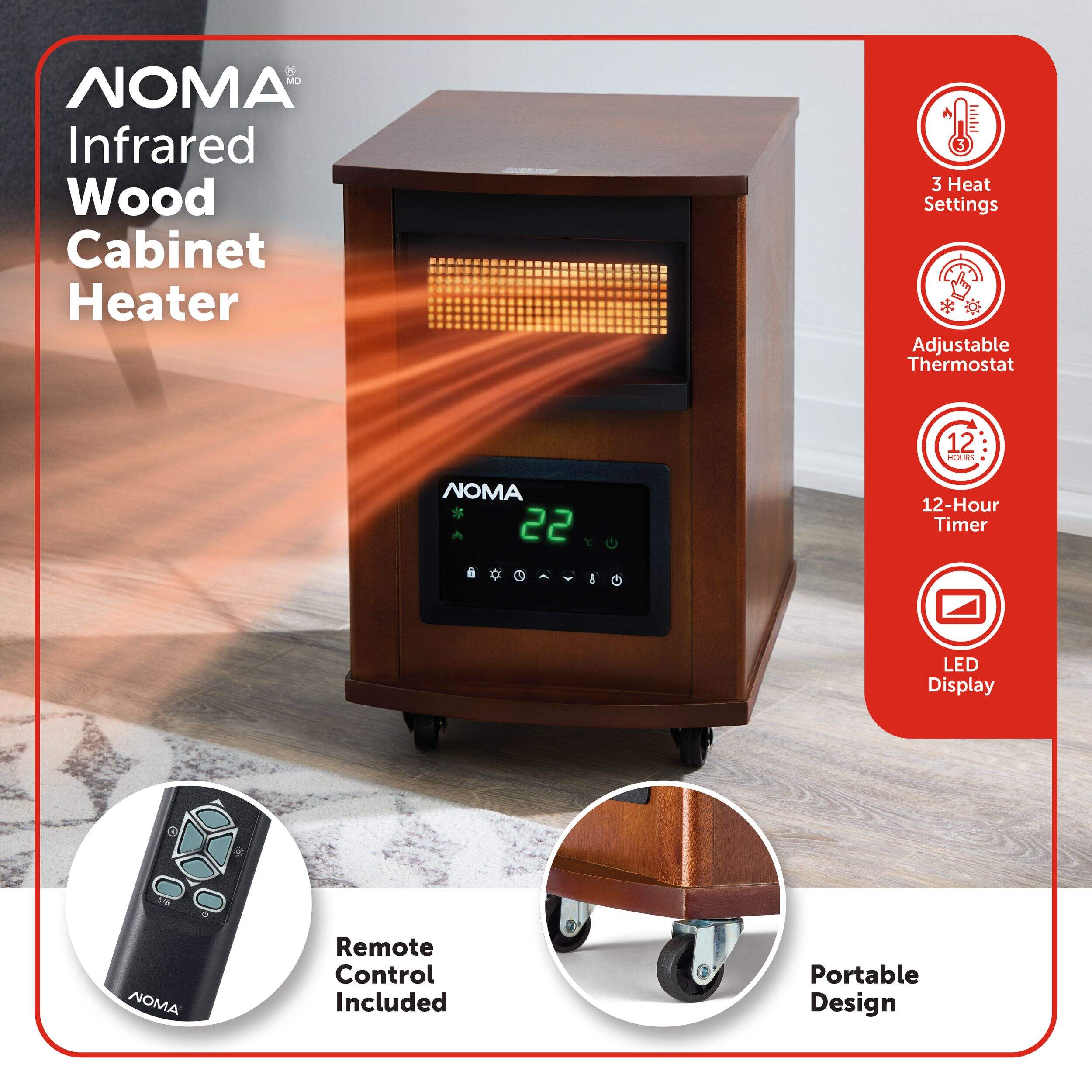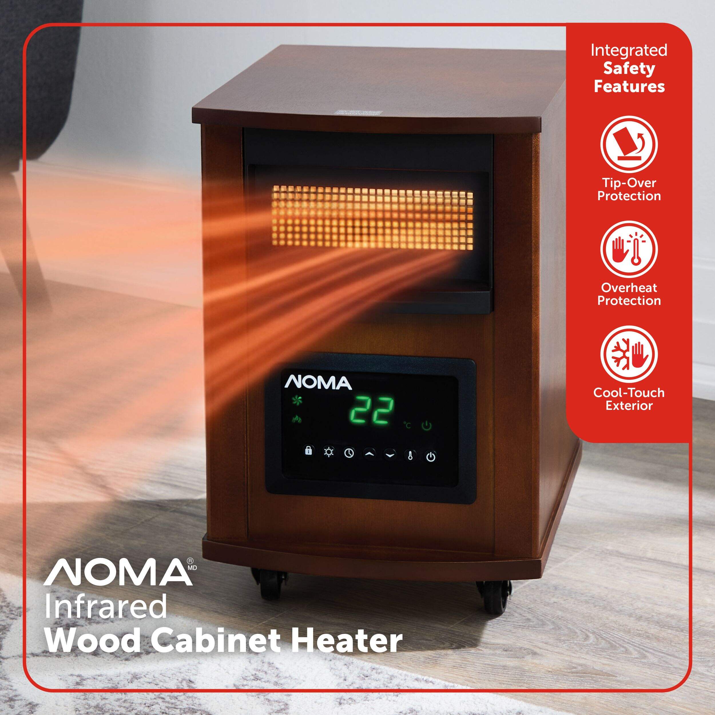 The NOMA Wood Cabinet Infrared Space Heater is a perfect match for any room in need of heat and some added style. This space heater features four infrared quartz tubes, which are highly effective at transferring heat. With an adjustable thermostat and LED display, this heater ensures you can always tell what the current temperature is and which settings are currently in action.