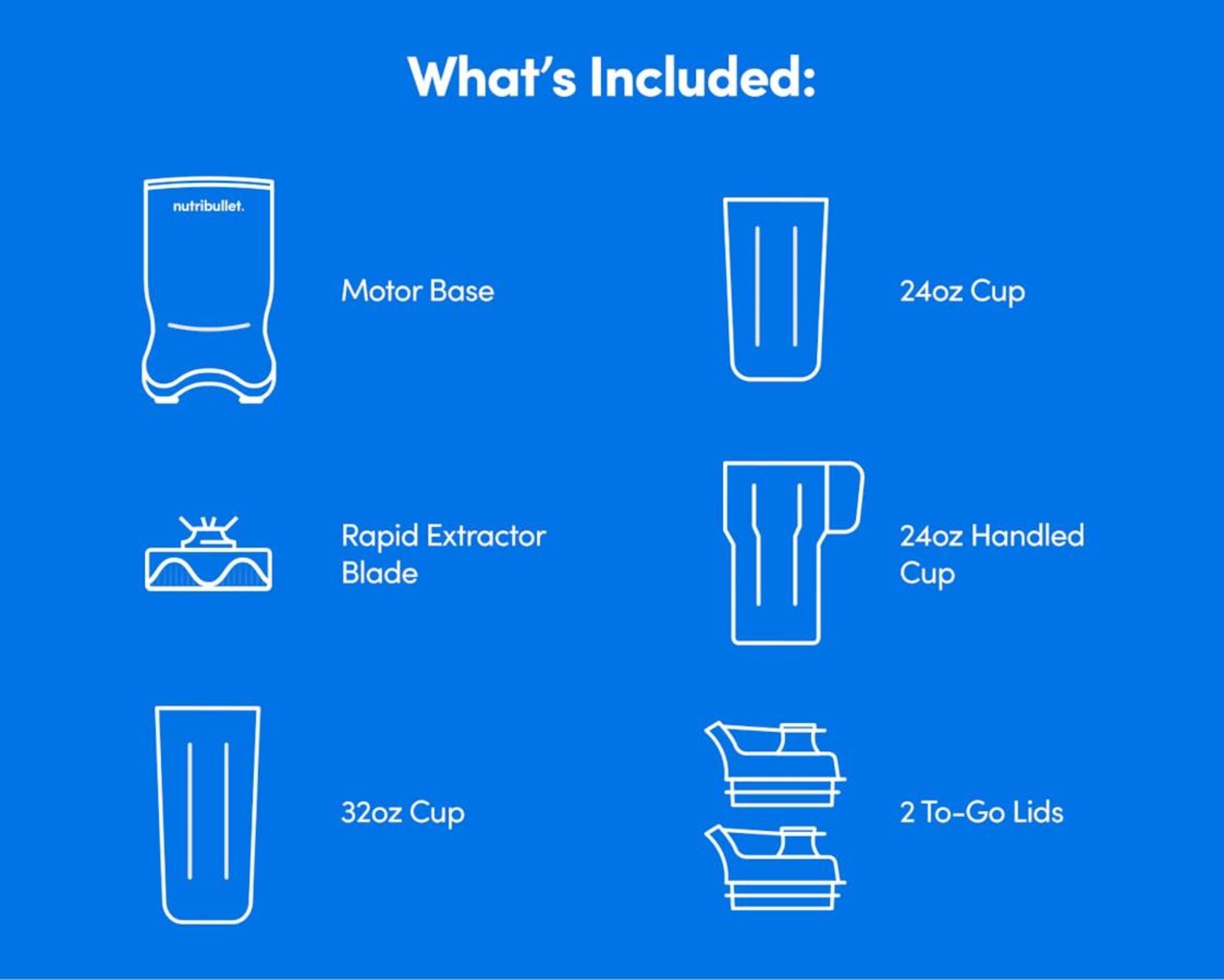 Includes: (1) 1200W motor base, (1) stainless steel blade, (1) 32 oz (900 mL) cup, (1) 24 oz (700 mL) cup, (1) 24 oz (700 mL) handled cup, (2) to-go lids, (1) user guide, and (1) recipe QR card insert