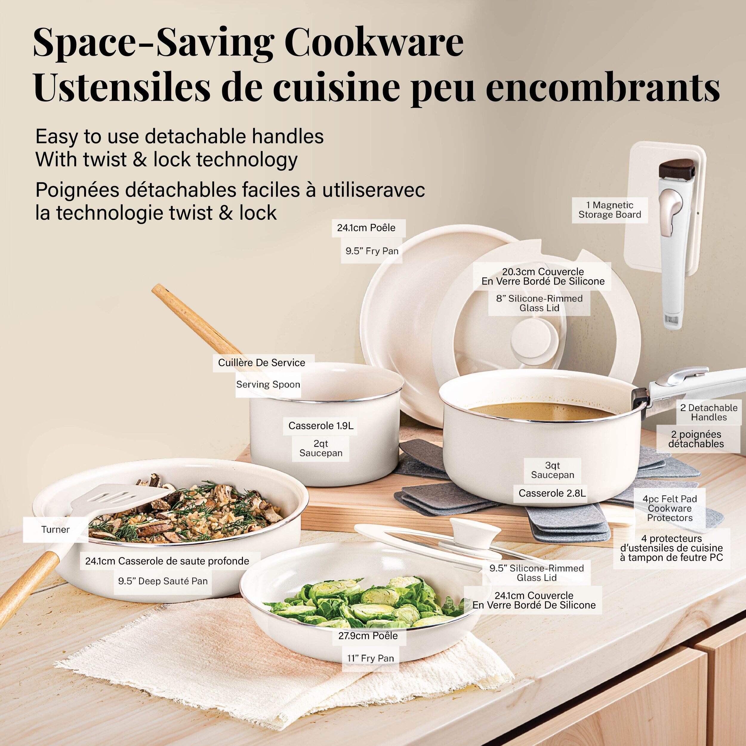 This innovative ceramic nonstick set features secure locking handles that easily attach and detach as you need it