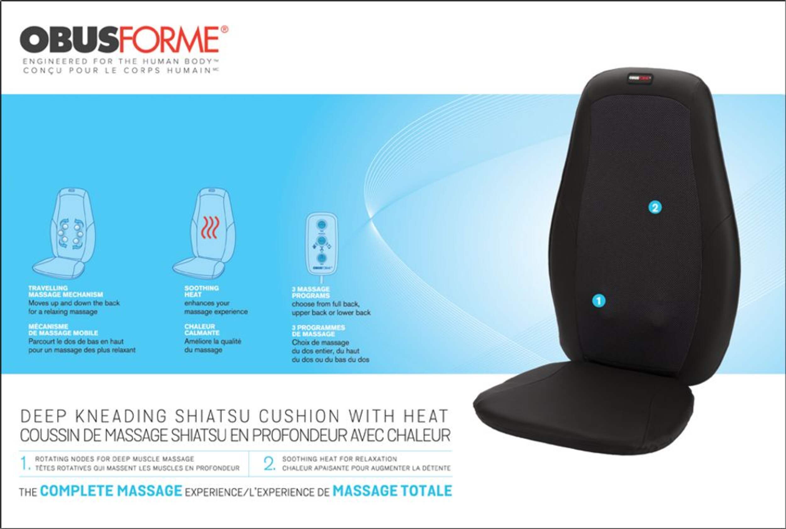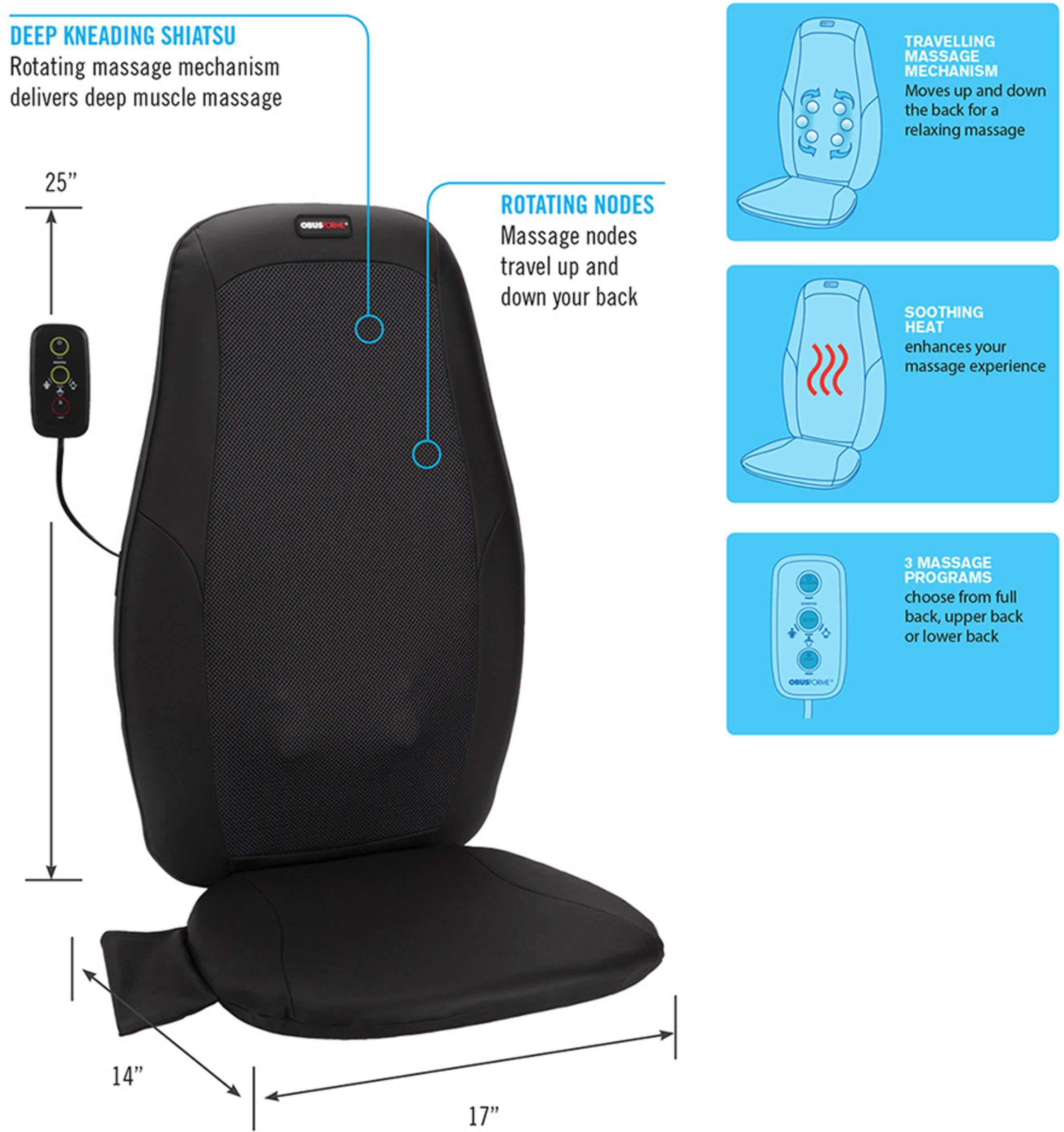 A complete and full massage experience with an easy to use remote control. With the touch of a button isolate the massage to areas of your back choosing from 3 massage programs.