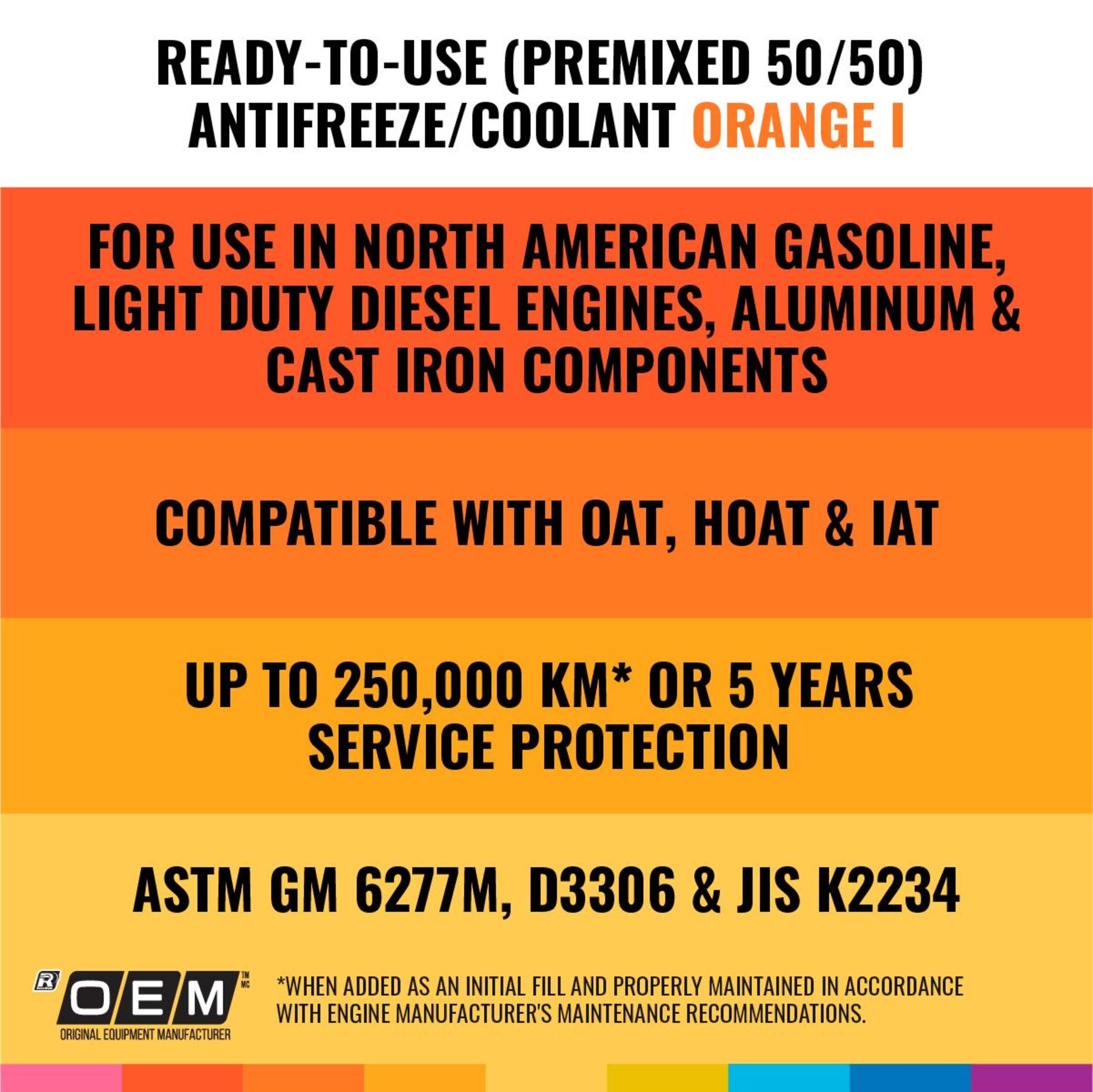 OEM Ready-to-Use Extended Life Antifreeze/Coolant Orange I is available in both Ready-to-Use (premixed 50/50) and concentrate formula