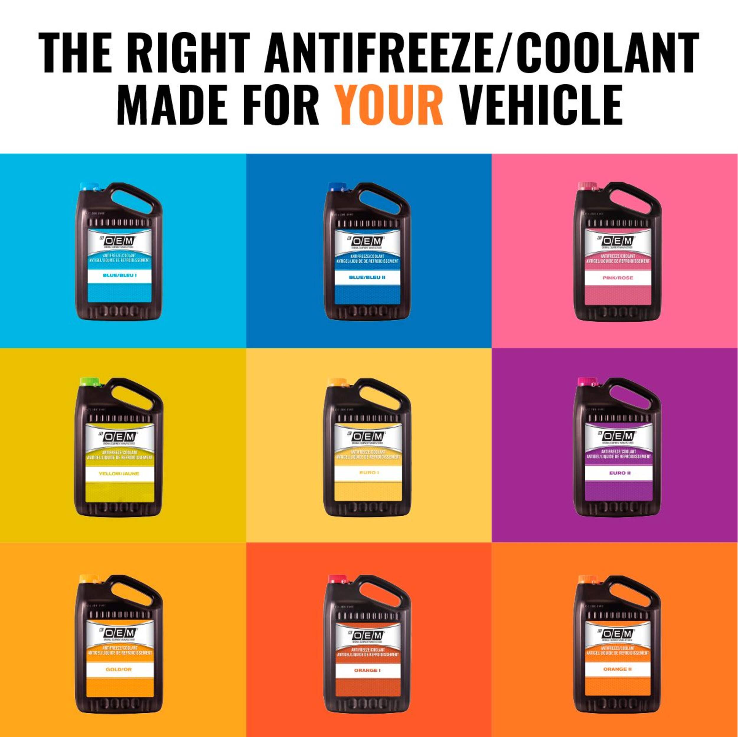 OEM Antifreeze Coolant - The right match for your vehicleWe're Matchmakers. OEM understands, you love your vehicle. OEM is dedicated to matching you to the right antifreeze/coolant for your vehicle. Your colour match indicates the right formulation for your vehicle, protecting your engine from extreme temperatures, start after start. Trust the experts at OEM.