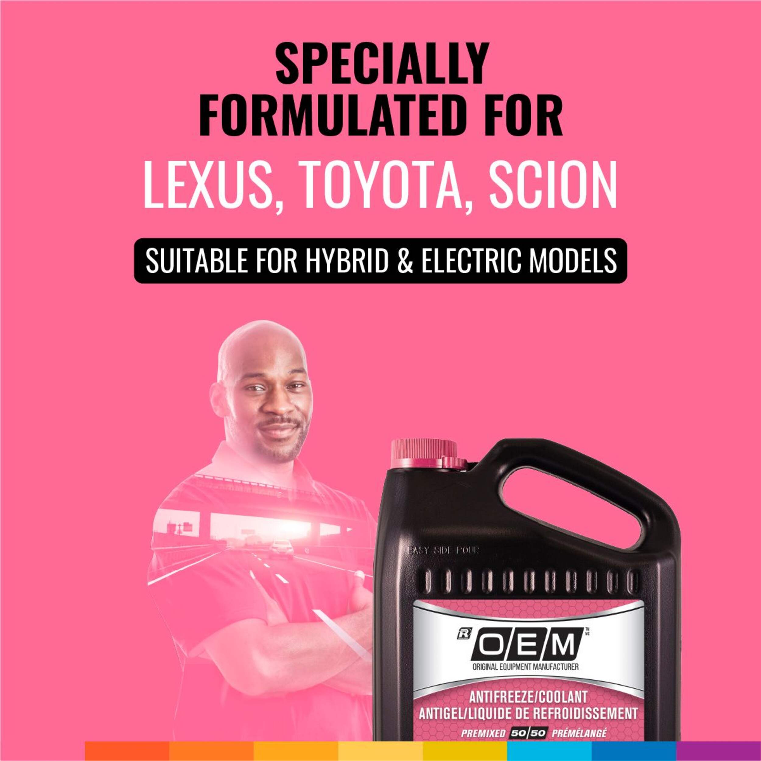 The OEM Ready-to-Use Extended Life Antifreeze/Coolant Pink is specifically formulated for Toyota, Scion and Lexus vehicles and is suitable for hybrid and electric models. The engine antifreeze/coolant provides extreme temperature protection, ranging from -37°C to 129°C. It also prevents summer overheating and winter freezing while providing extended protection against rust, corrosion and pitting caused by cavitation for all coolant system metals.