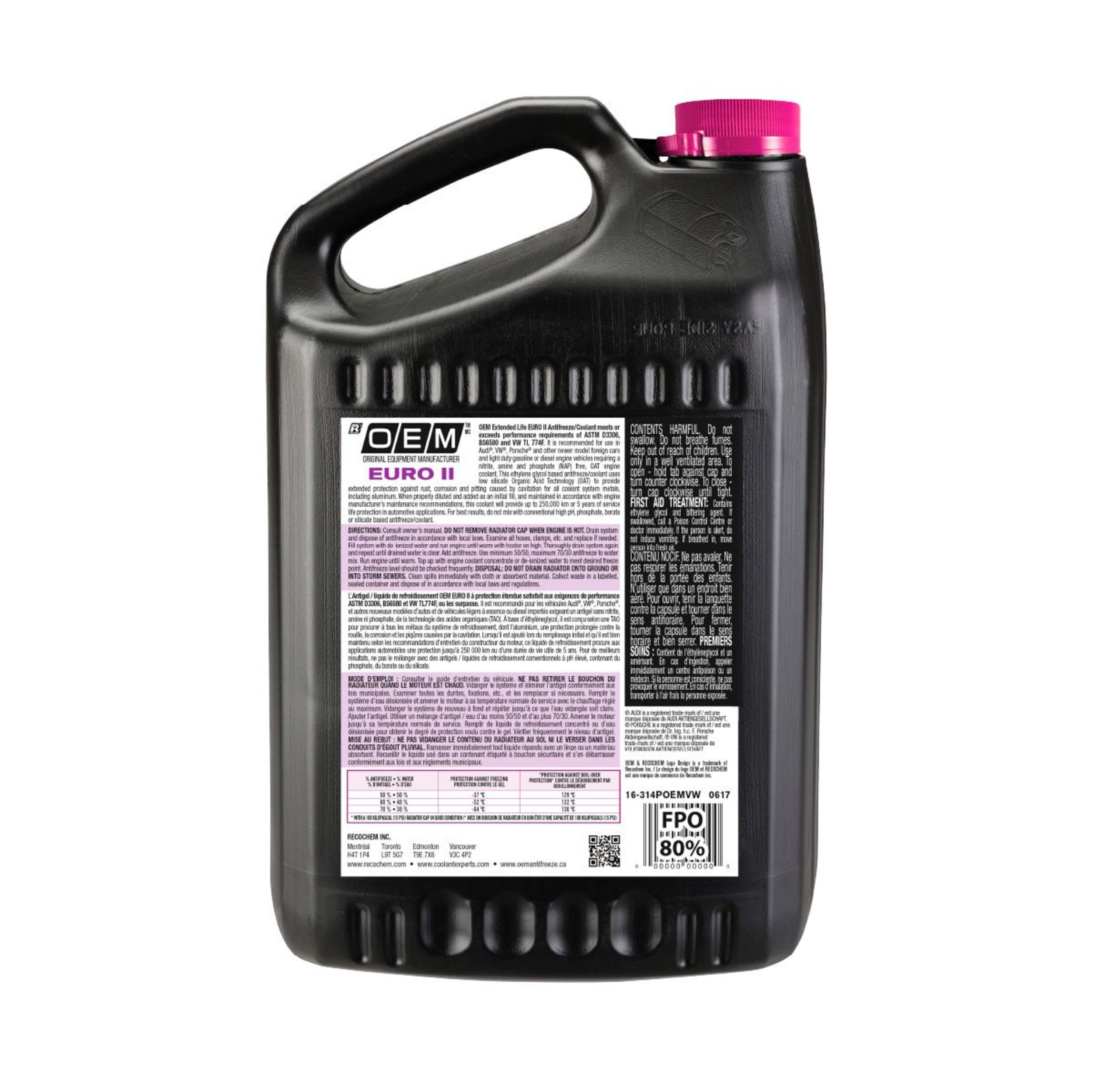 OEM Euro II is specifically made for European vehicles and light duty trucks requiring a nitrite, amine and phosphate (NAP) free OAT (Organic Acid Technology) antifreeze/coolant in aluminum engines