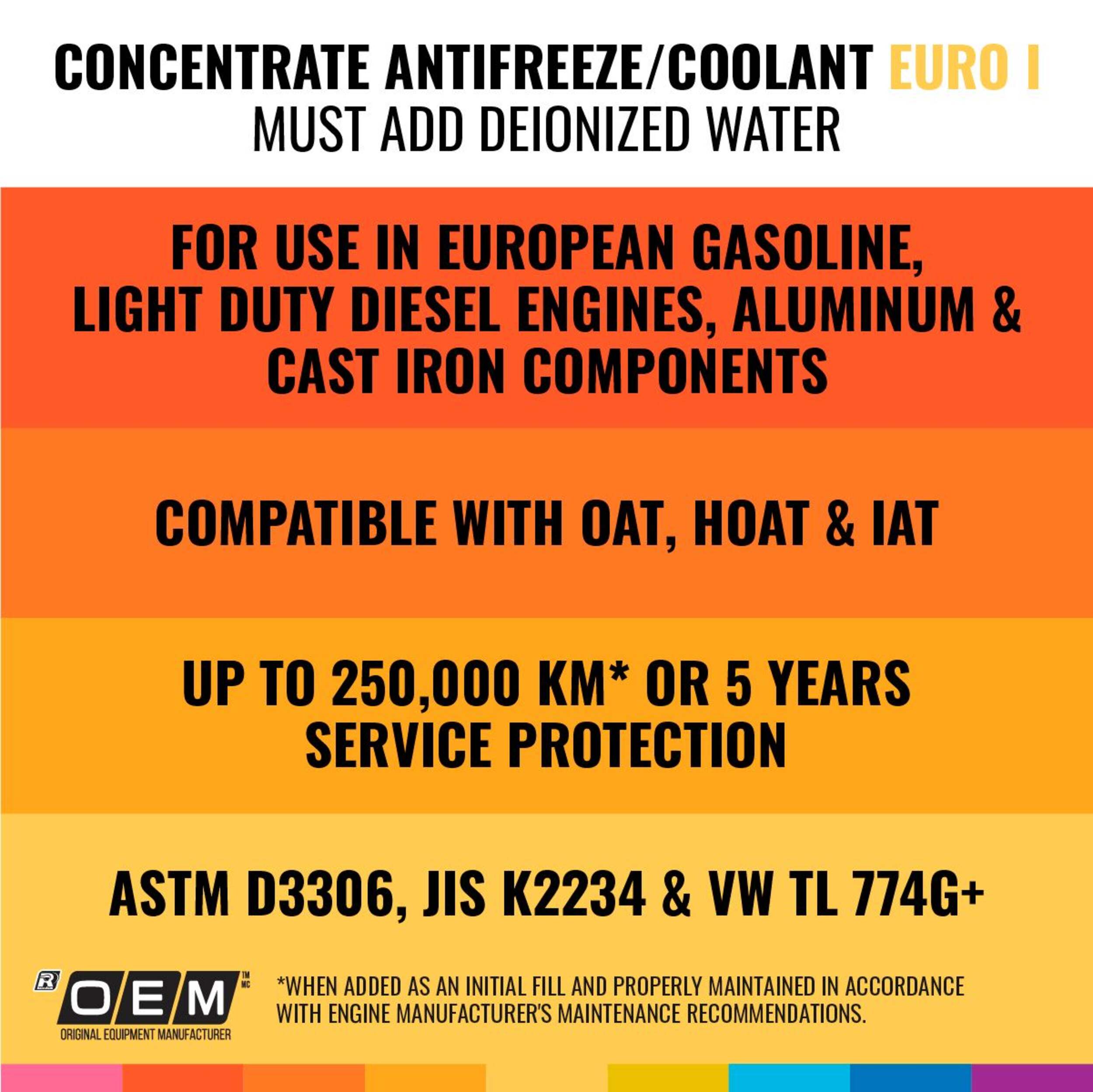 OEM Concentrate Extended Life Antifreeze/Coolant Euro I is available in both Ready-to-Use (premixed 50/50) and concentrate formula. With 10 different formulations that match the factory fill specifications, find the right coolant/antifreeze specifically made for YOUR vehicle - Find YOUR match